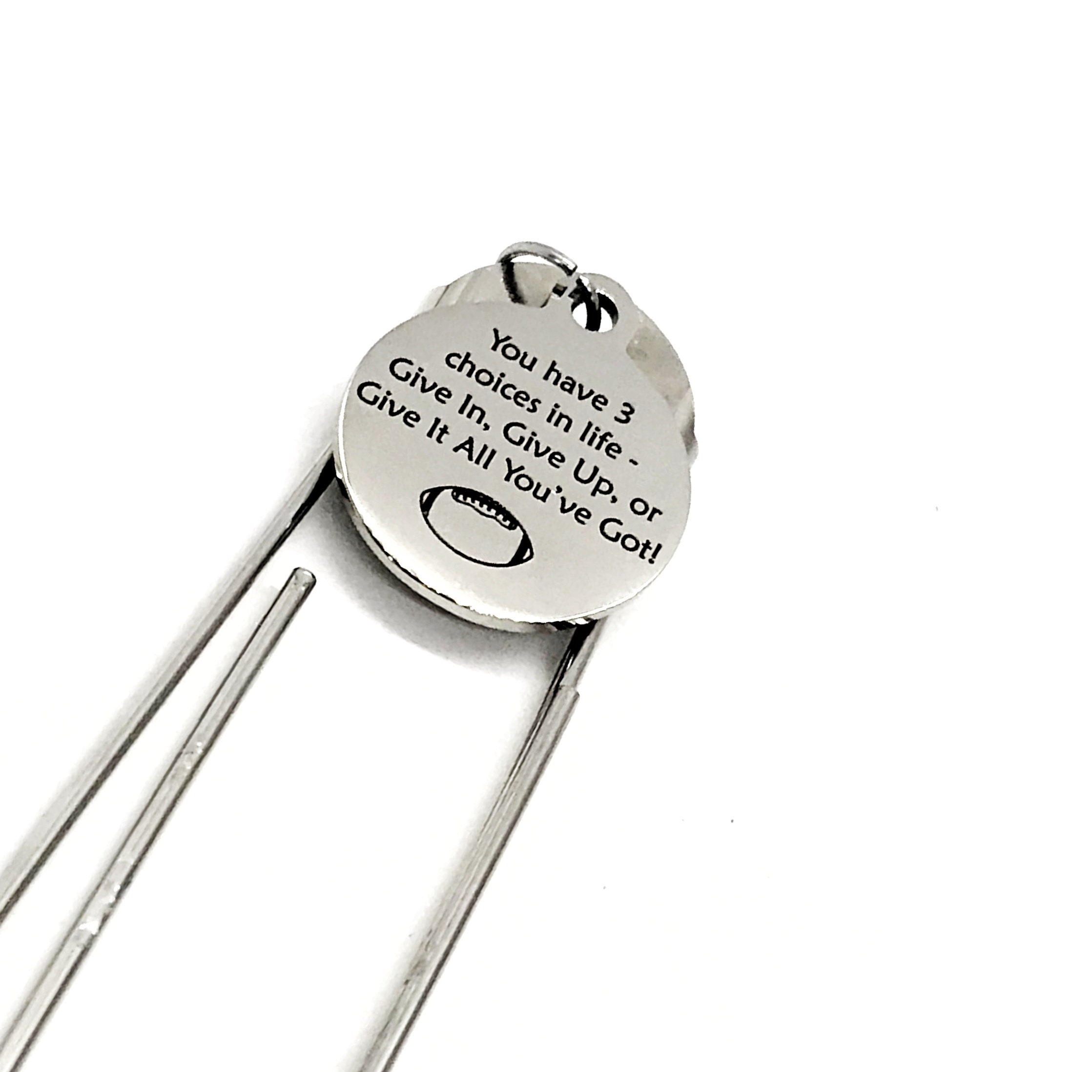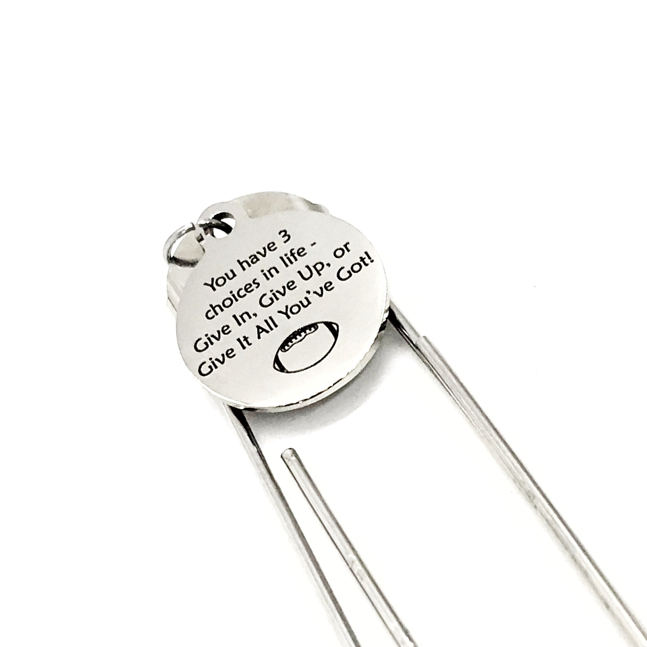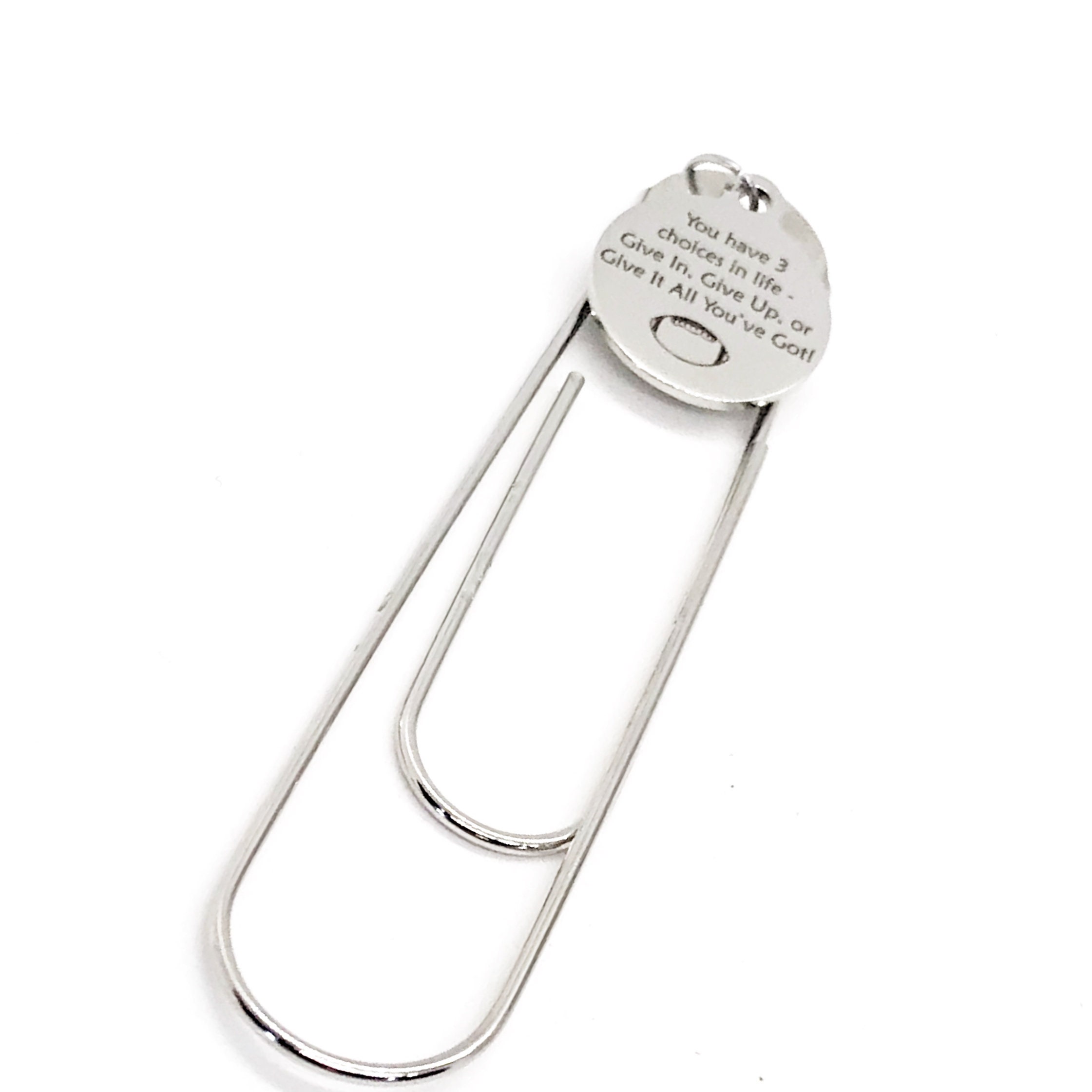 This bookmark has stainless steel laser engraved charm that says, “You have 3 choices in life - Give In, Give Up, or Give It All You’ve Got” on it. This would be a great way to encourage someone.