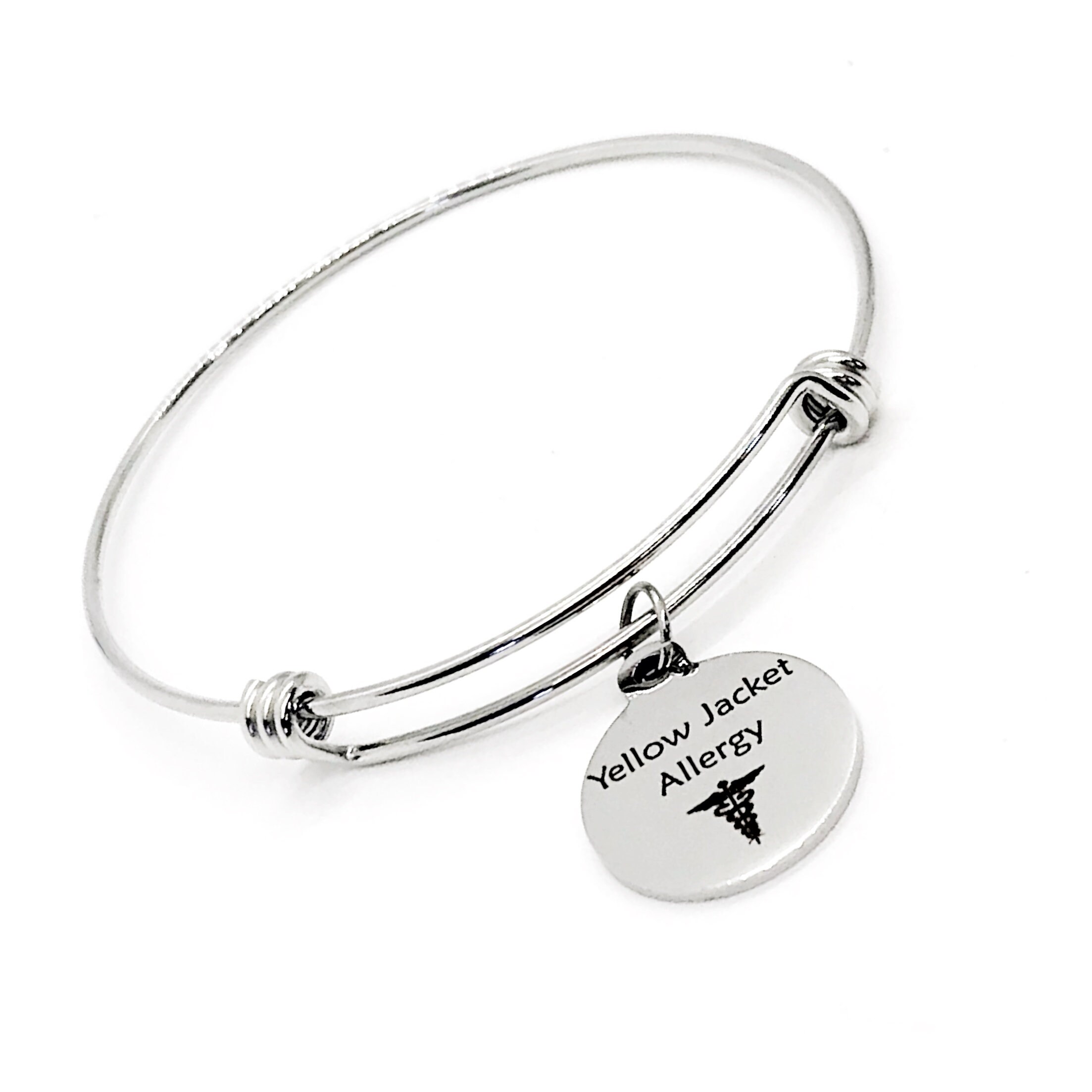 This is a beautiful bangle bracelet with a laser engraved stainless steel charm that has an “Yellow Jacket Allergy” notification on it.