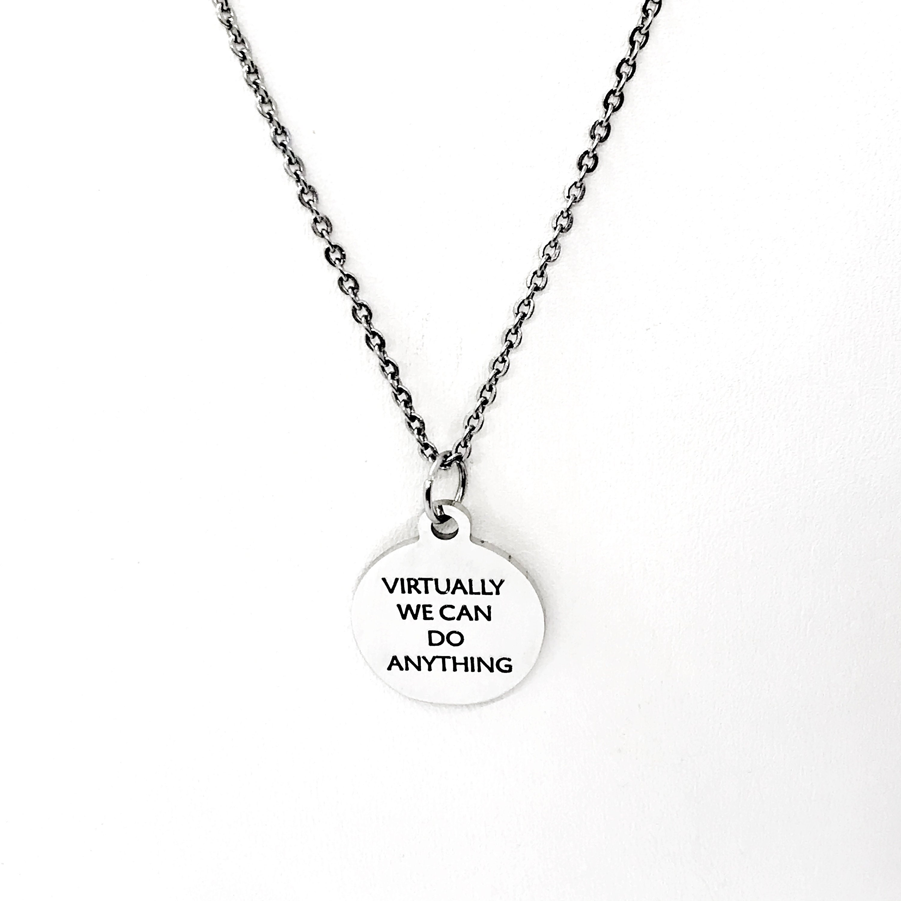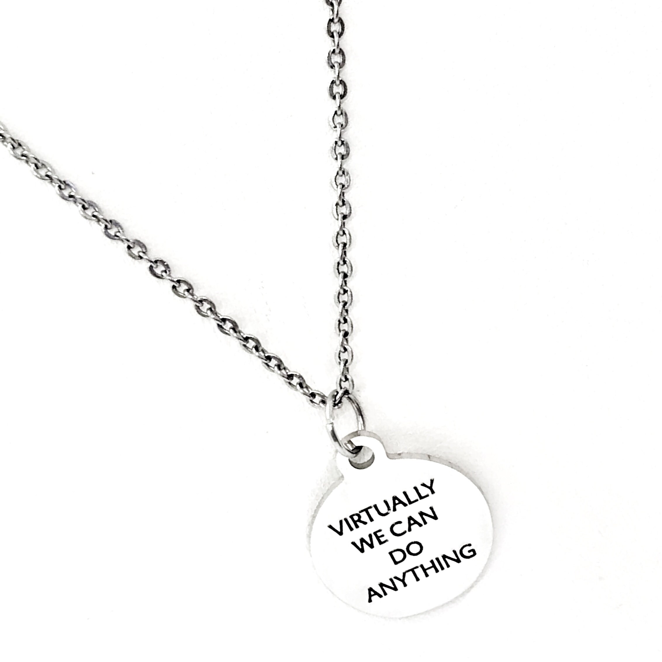 This is a simple but classic motivating gift pendant necklace. The pendant is a stainless steel laser engraved charm that has “Virtually we can do anything” on it. This pendant is available on your choice of 16, 18, 20, 22, 24, 26, 28 or 30 inch chain. The pendant is also available for individual purchase if you have another chain on which you would like to wear it.