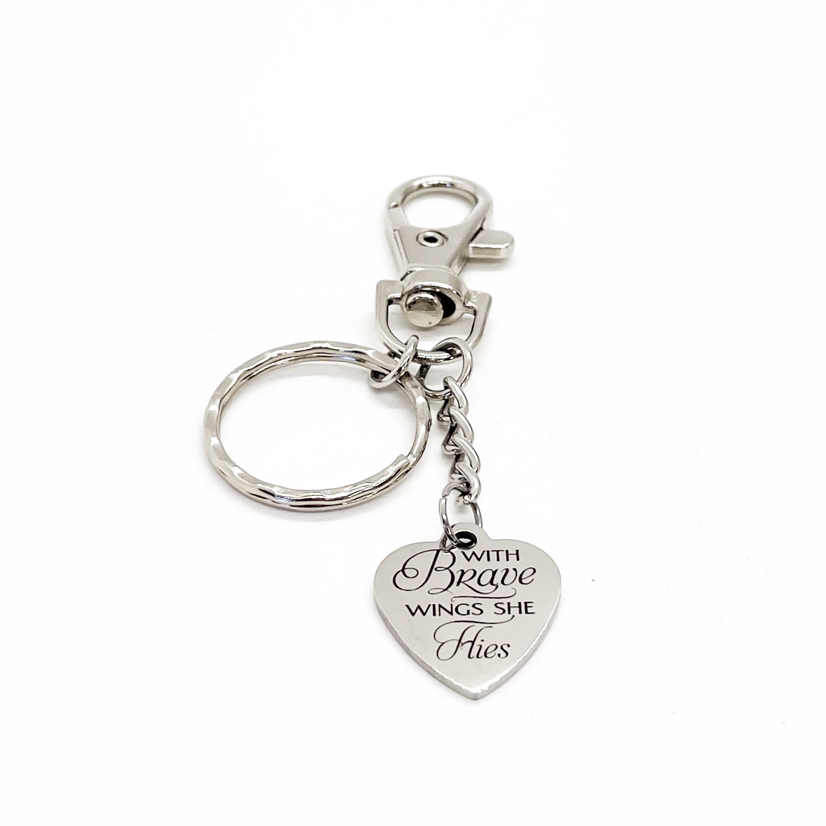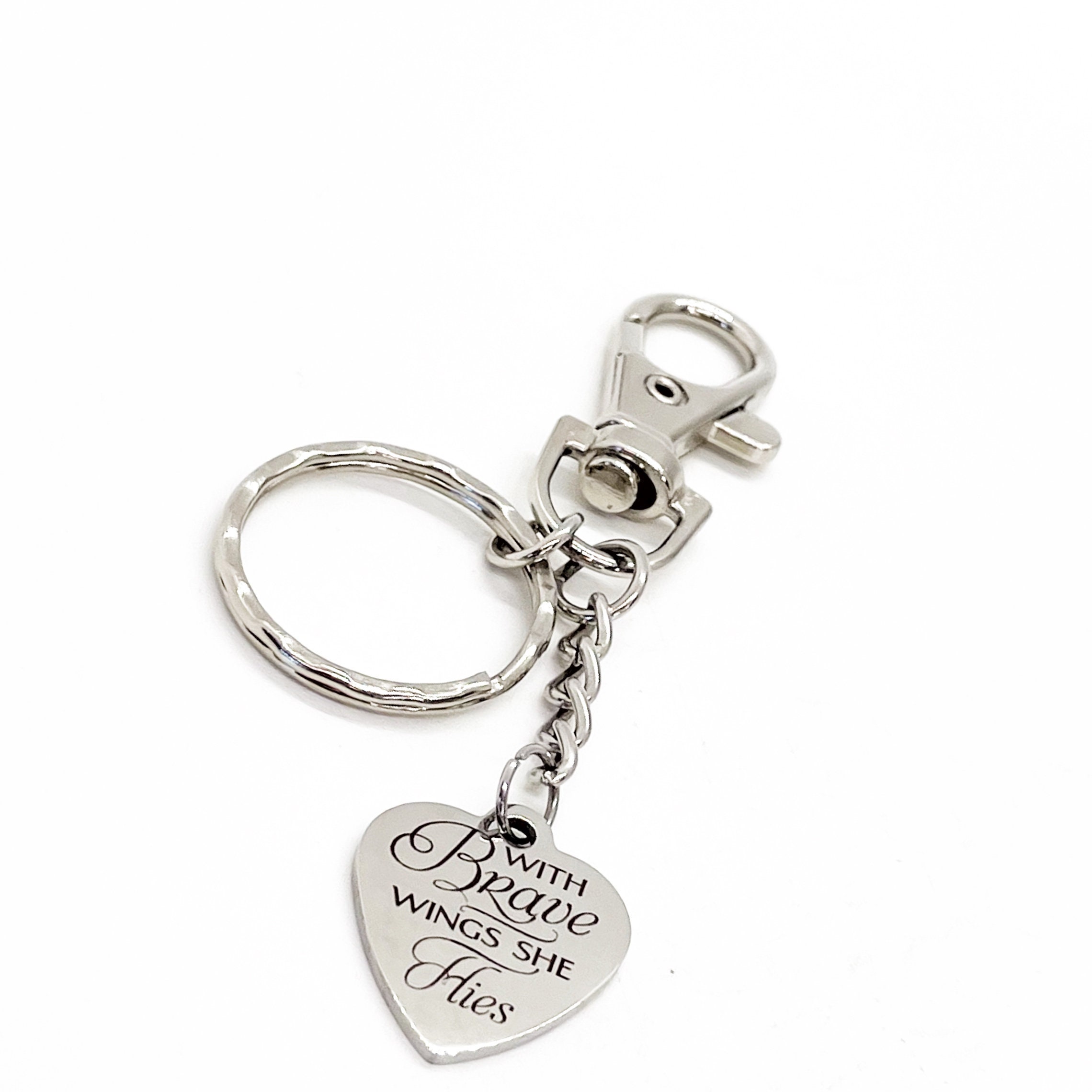 This is a great. keychain gift . The keyring can be clipped onto your bag to make it easy to access without digging to the bottom of the bag. It has a stainless steel laser engraved charm with “With brave wings she flies” on it.