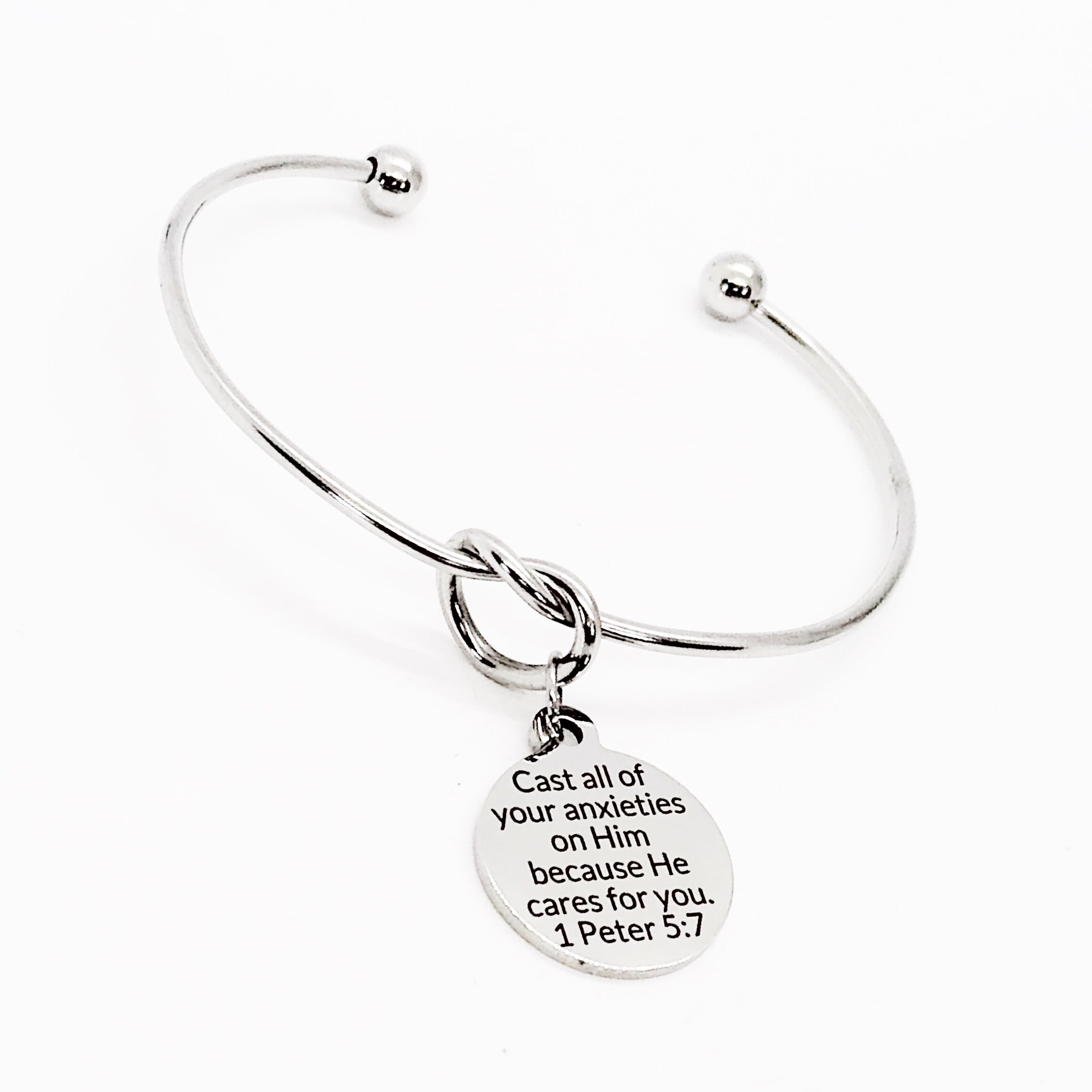 This is a beautiful knotted cuff bracelet with an engraved charm with “Cast all of your anxieties on him” from 1 Peter 5:7 on it. The bracelet easily expands to fit on any wrist size. The charm measures approx. 3/4 inch across.
