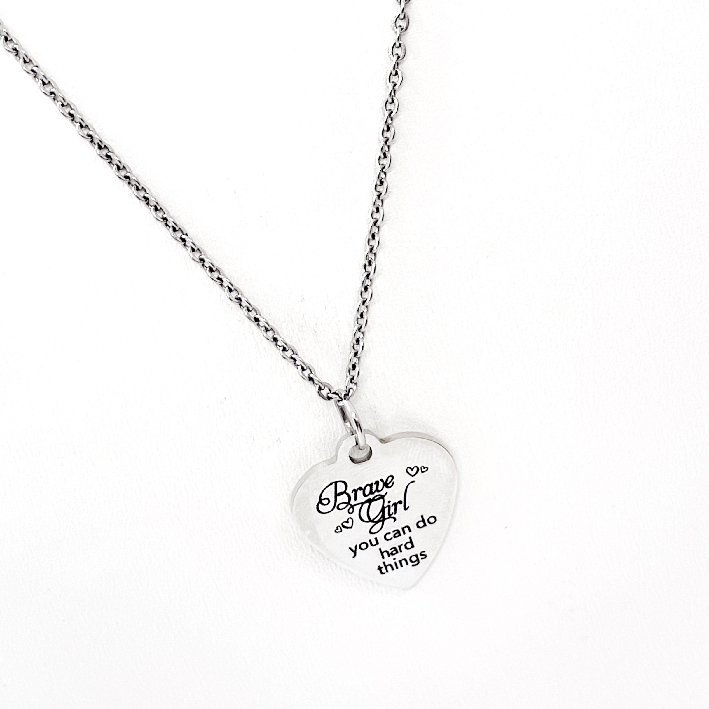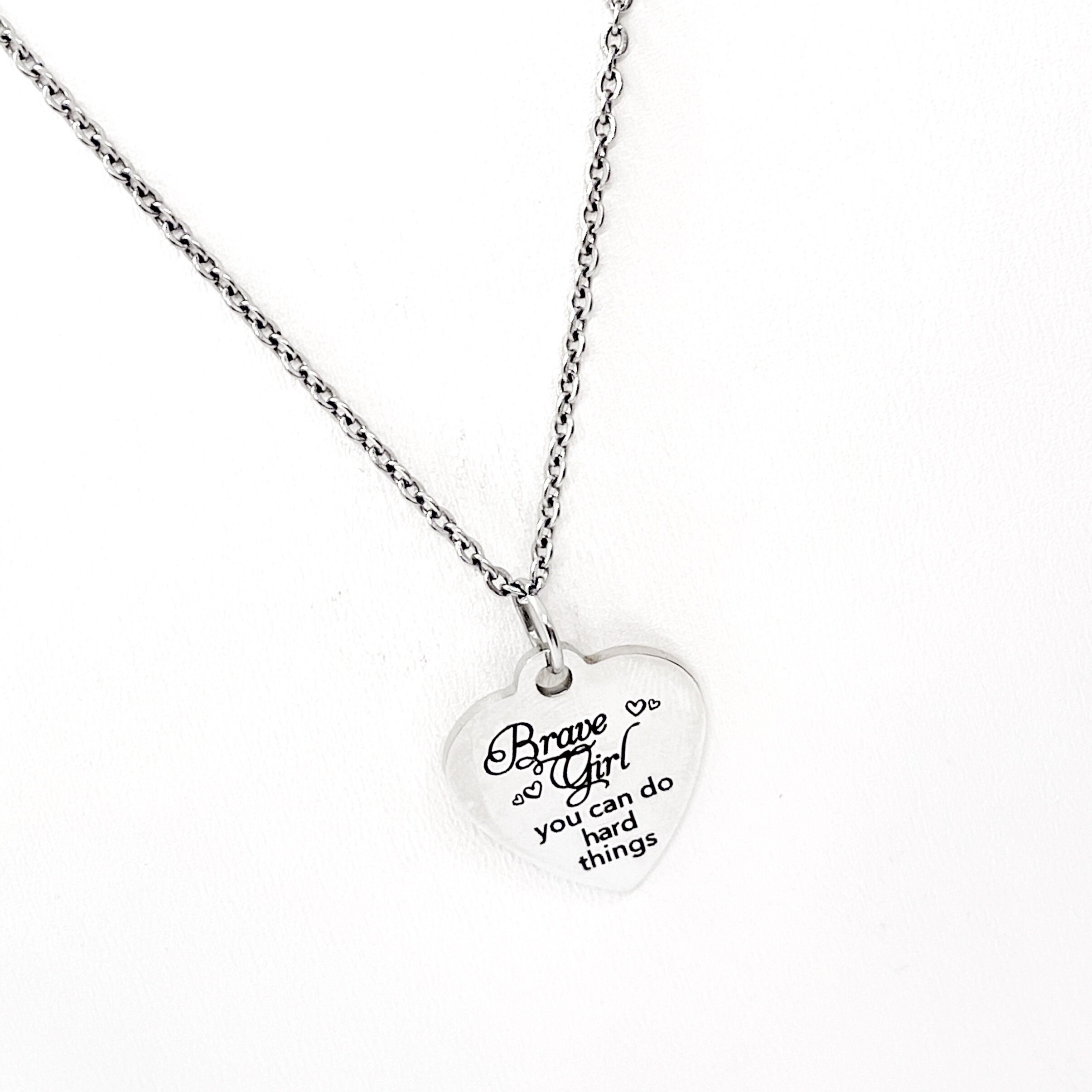 This beautiful necklace would make a great motivation gift to encourage someone. The pendant is a stainless steel laser engraved pendant that has “Brave Girl You Can Do Hard Things” on it.