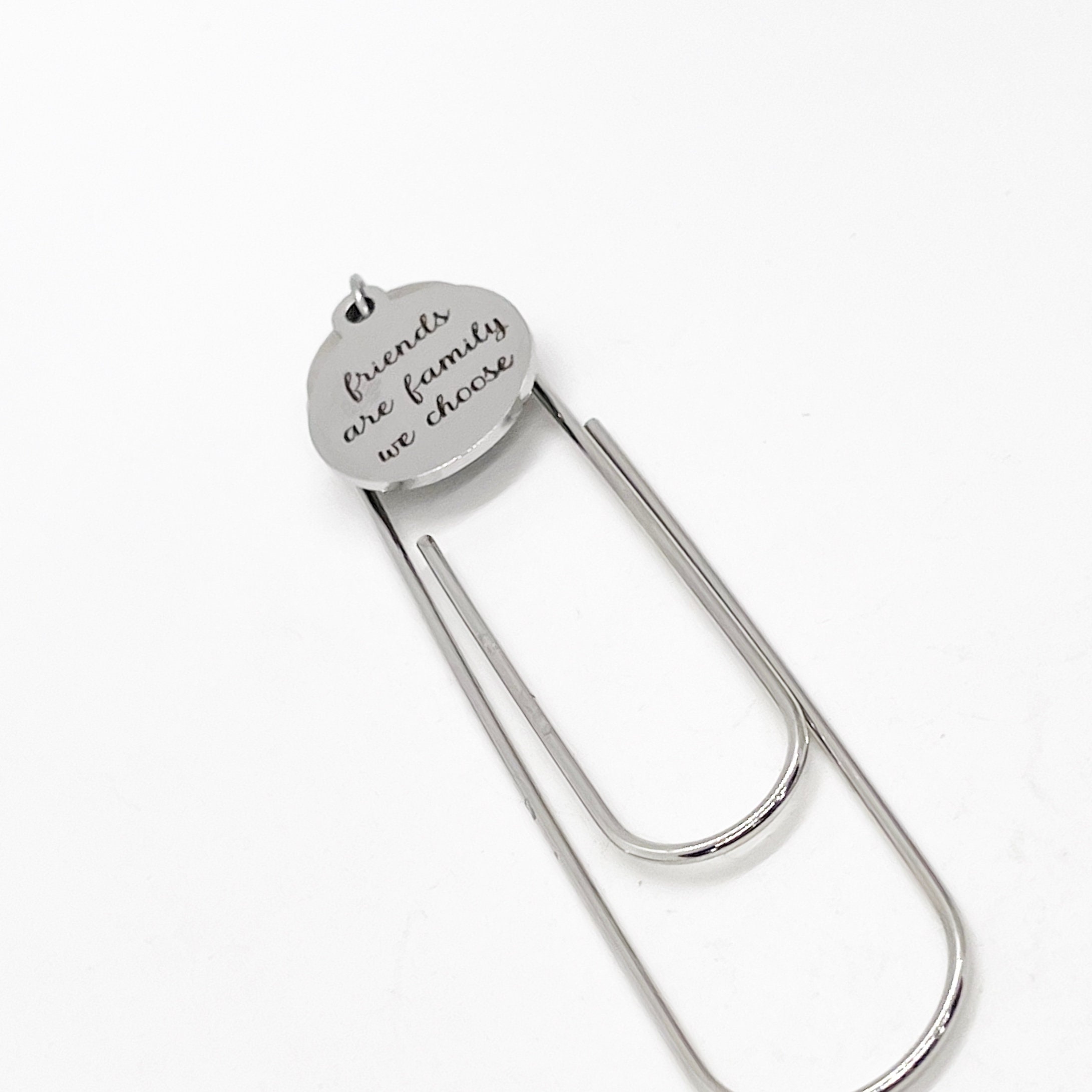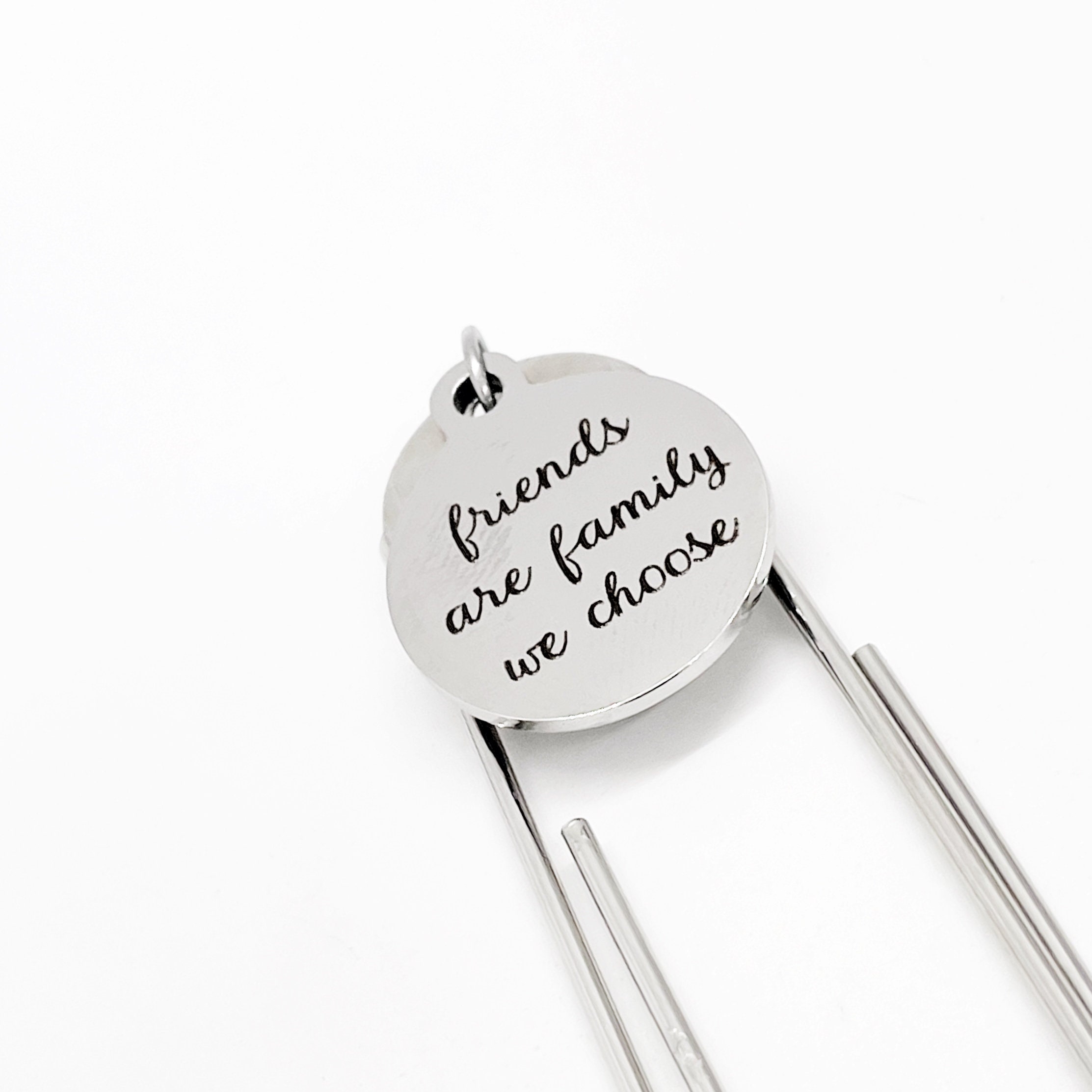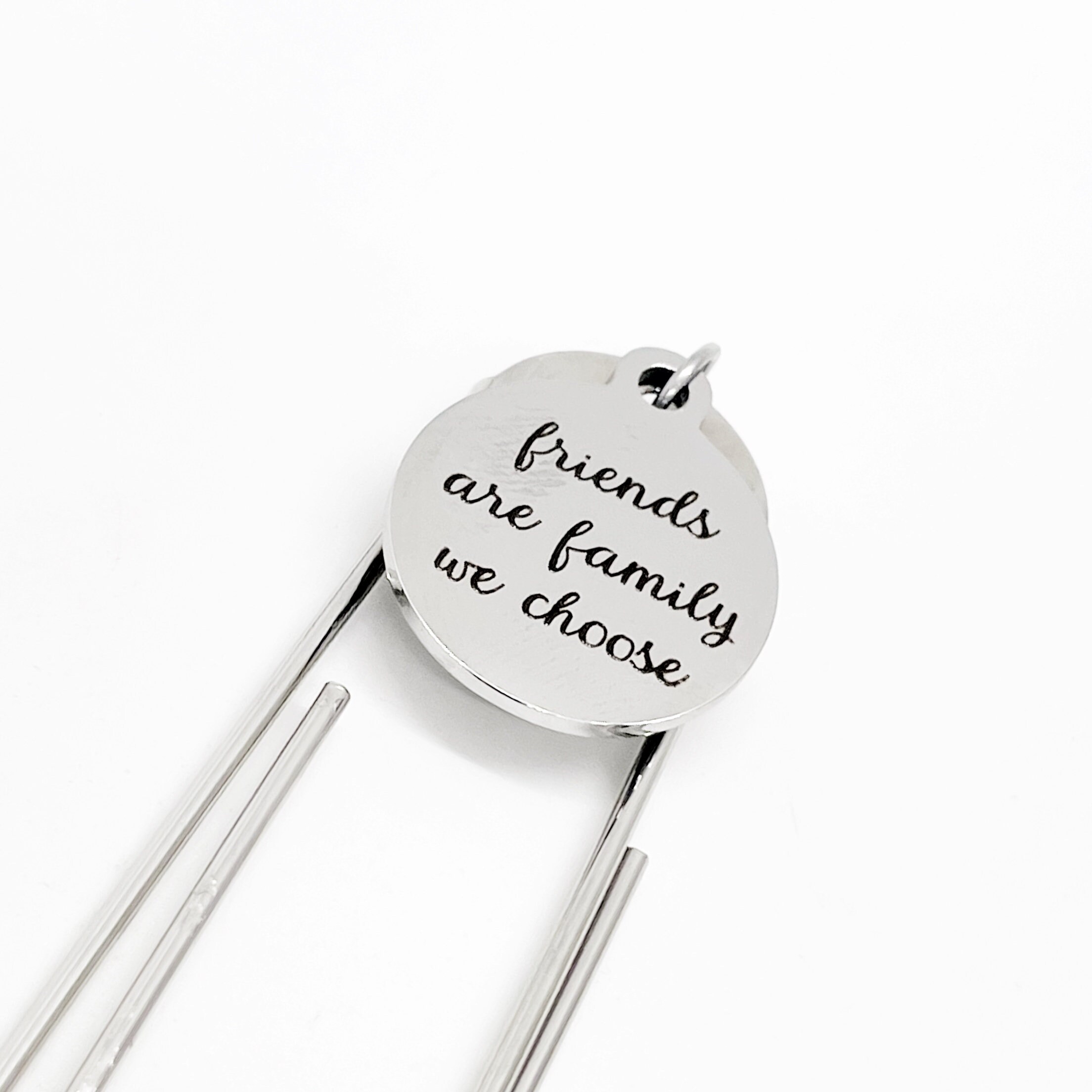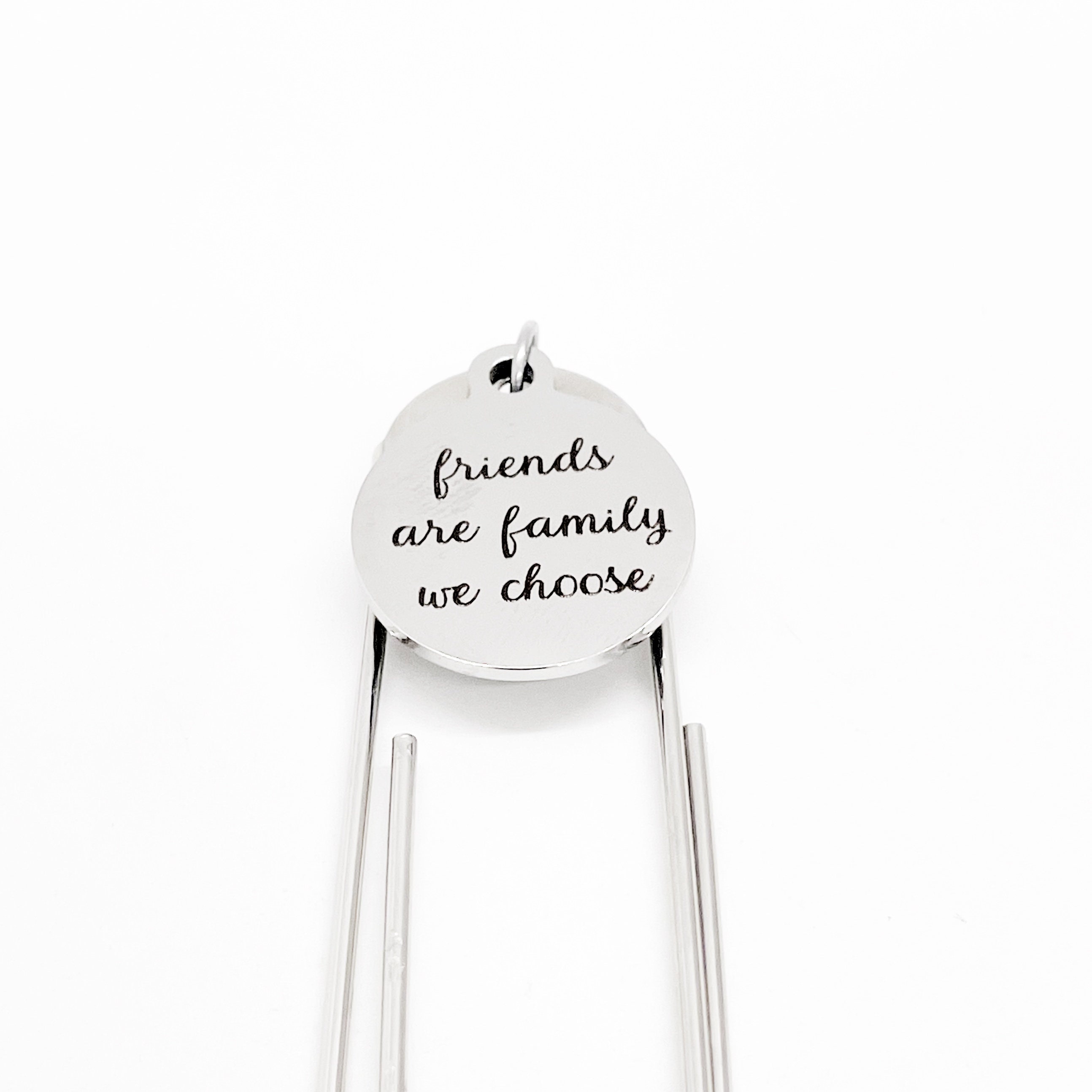 This bookmark has a stainless steel laser engraved charm with “friends are the family we choose” on it.