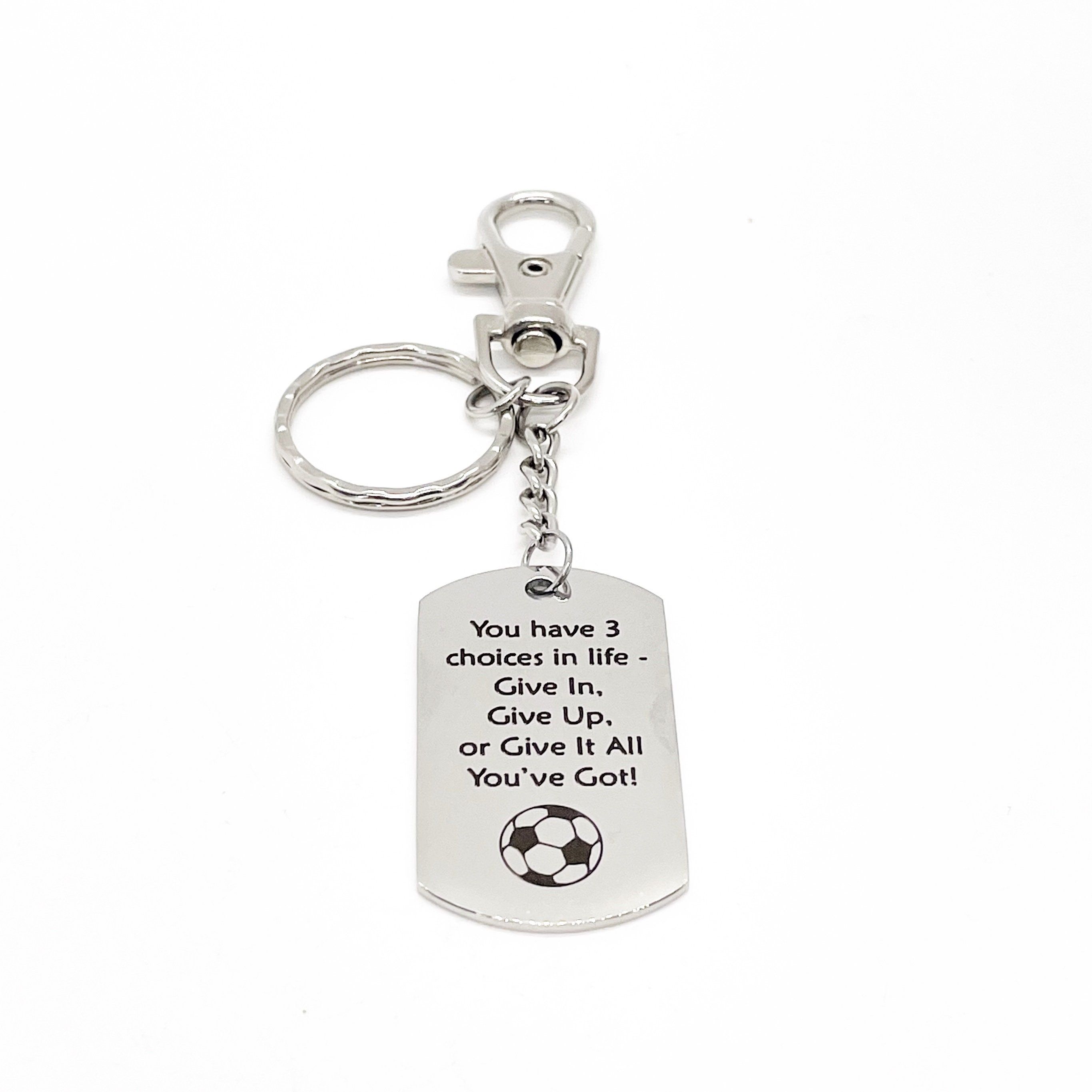 This is a great keychain gift . The keyring can be clipped onto your bag to make it easy to access without digging to the bottom of the bag. It has a stainless steel laser engraved charm with “You have 3 choices in life - Give In, Give Up, or Give It All You’ve Got”” on it.