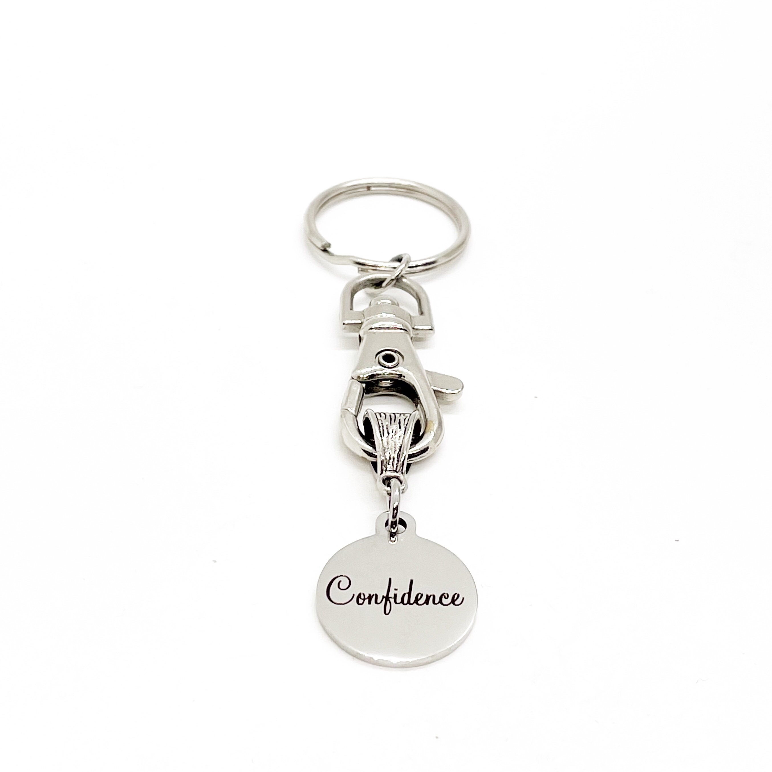 This is a great keychain that has a stainless steel laser engraved charm which says, "Confidence". This is a great motivational keychain for someone working to reach a goal.
