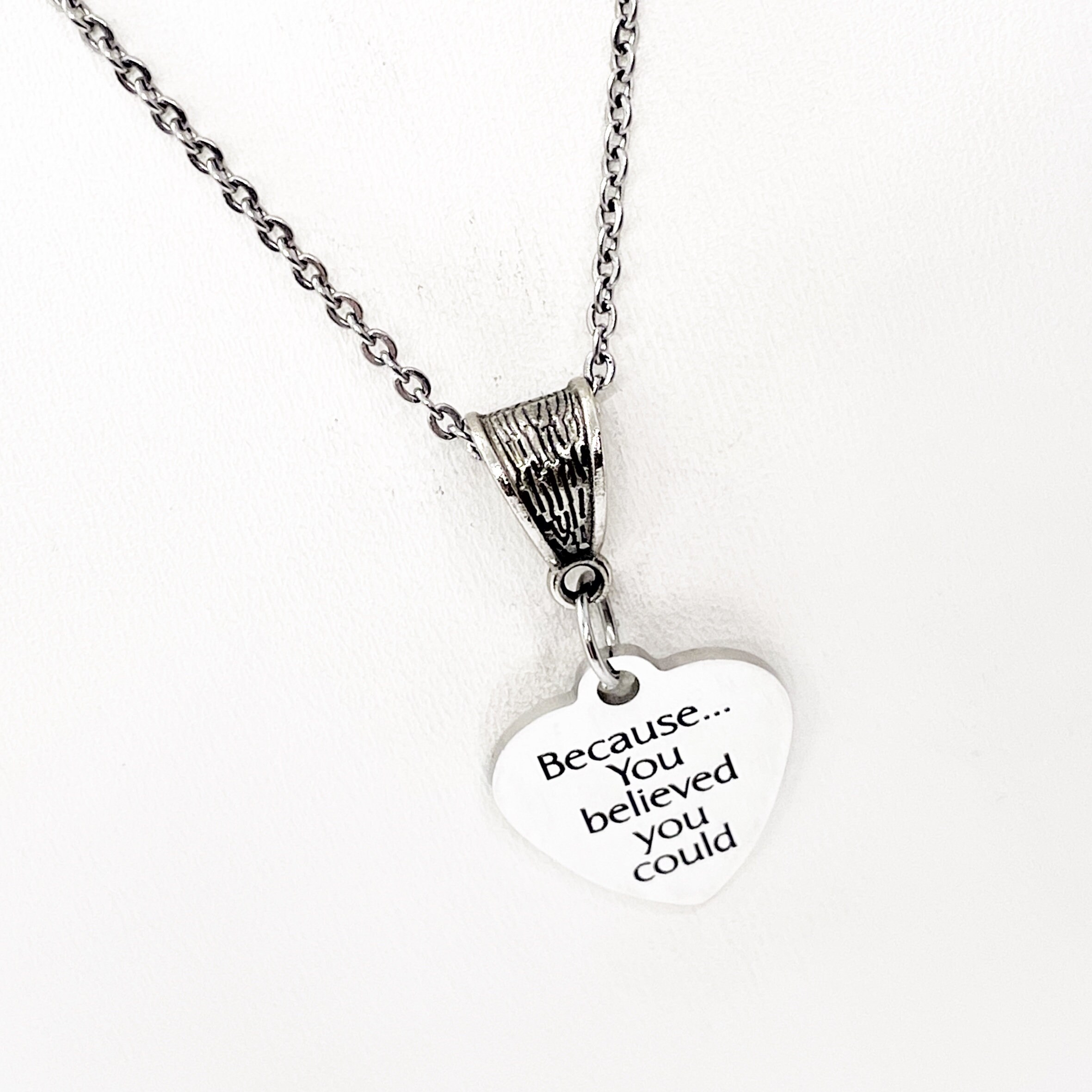This is a stainless steel laser engraved pendant on a stainless steel link chain. The pendant says “Because... You believed you could”.