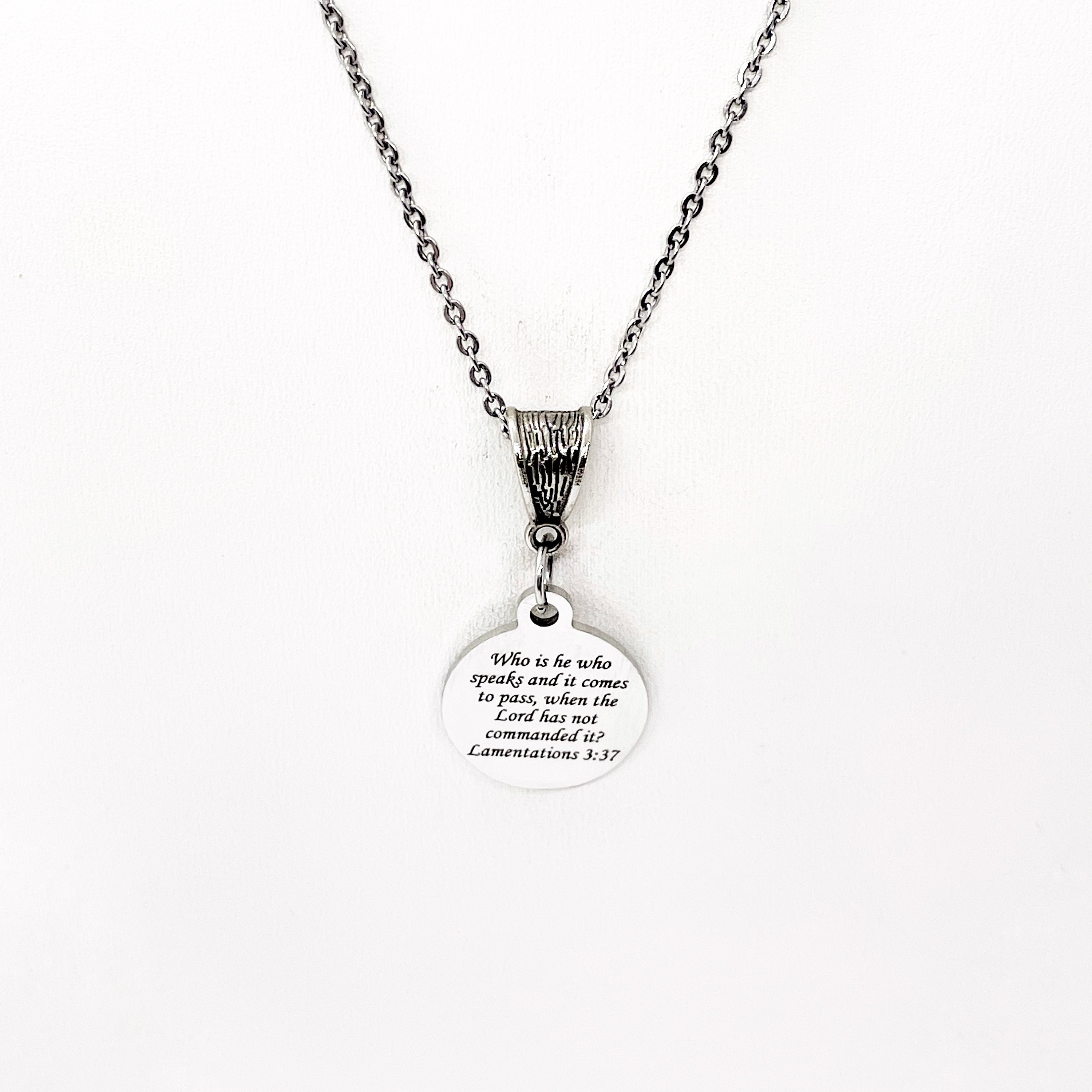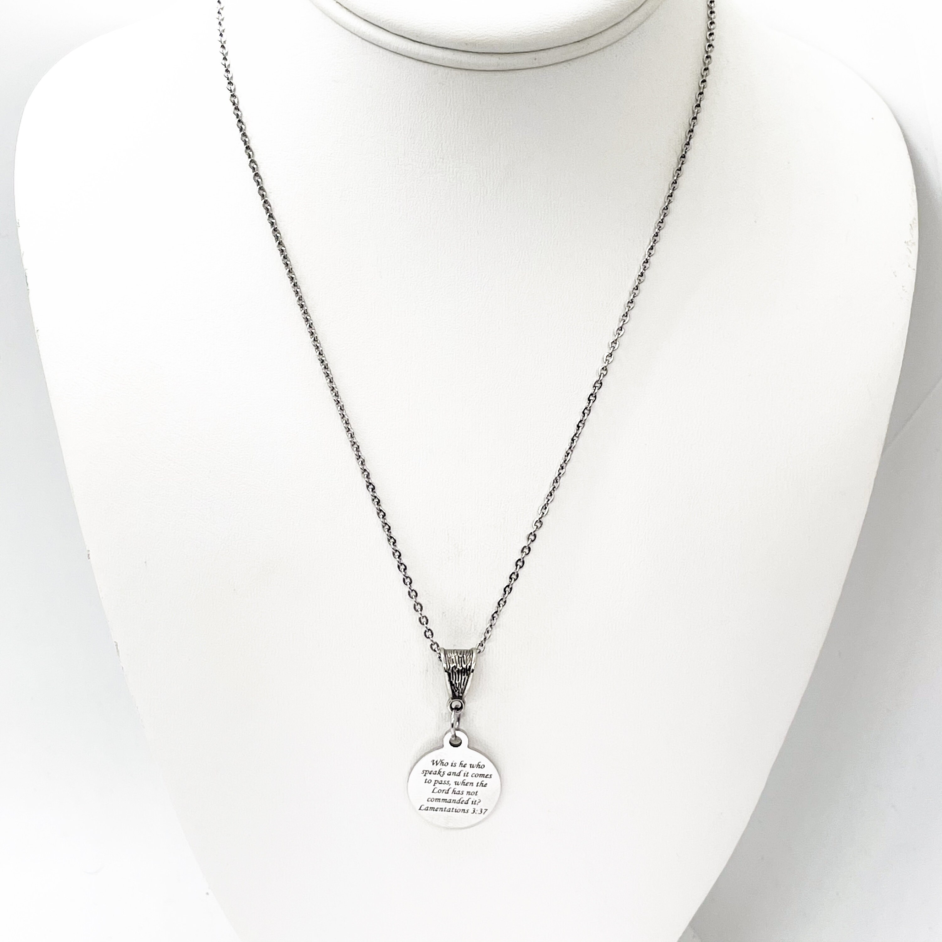 This is a stainless steel laser engraved pendant on a stainless steel link chain. The pendant says “Who is he who speaks and it comes to pass, when the Lord has not commanded it?” From Lamentations 3:37.