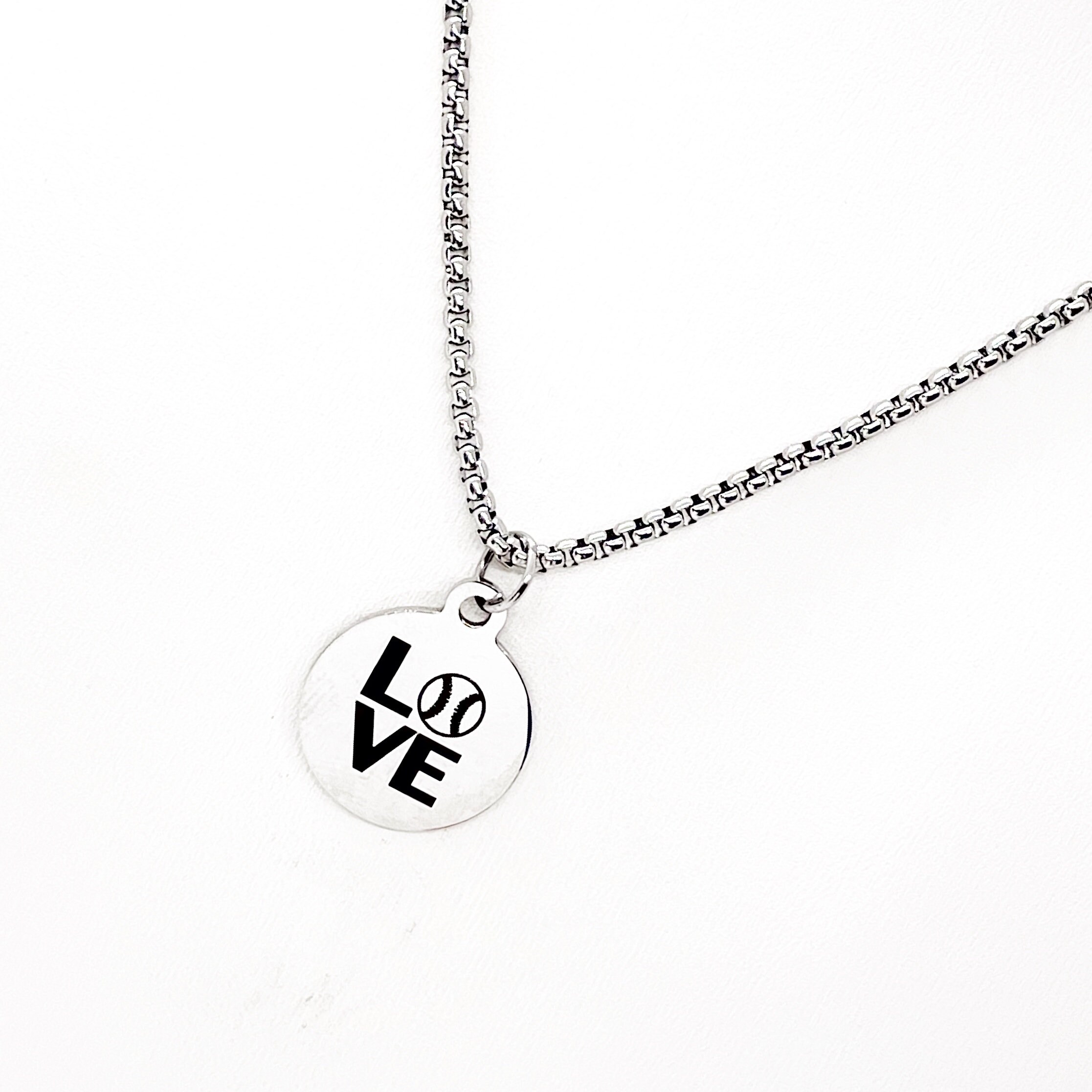 The piece is stainless steel laser engraved charm on a 22 inch ball chain. It has “LOVE” with a baseball where the O is on it.