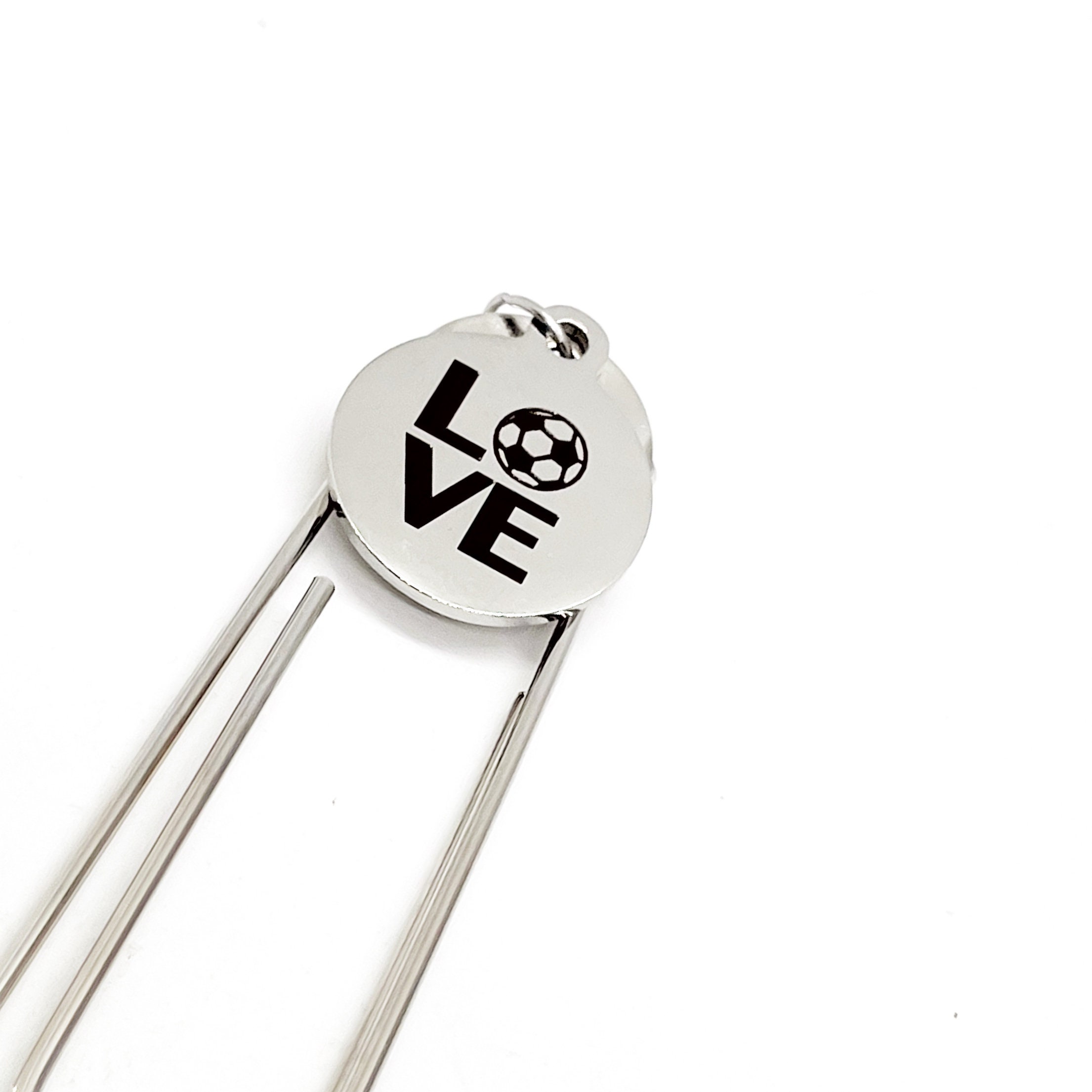 This is a great bookmark. This paper clip bookmark has a stainless steel laser engraved charm with “LOVE” with a soccer ball in the place of the O on it. It can be used as a bookmark, page marker, or planner book mark.