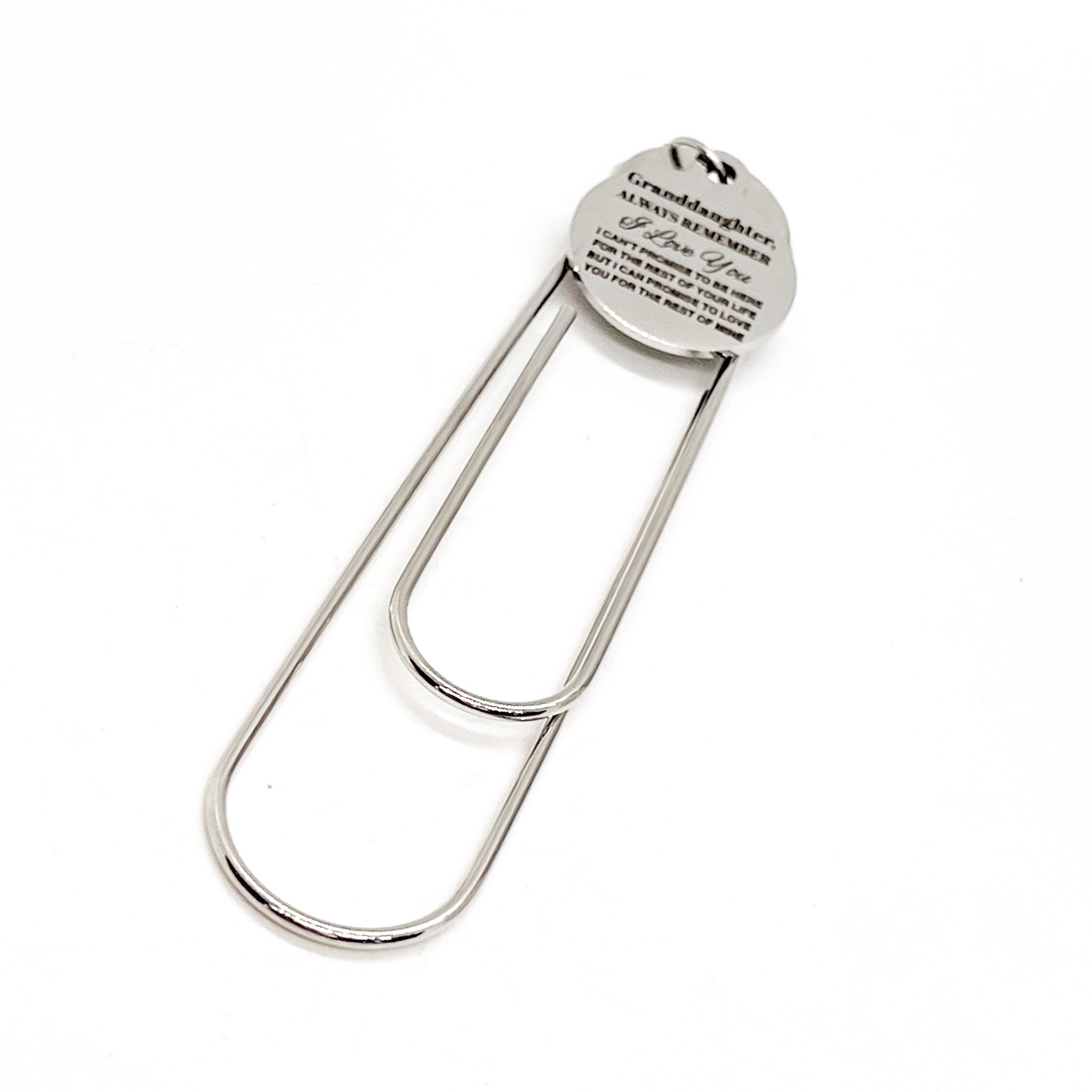 This is a great bookmark. This paper clip bookmark has a stainless steel laser engraved charm with “Granddaughter, Always remember I Love You I can’t promise to be here for the rest of your life but I can promise to love you for the rest of mine” on it. It can be used as a bookmark, page marker, or planner book mark.