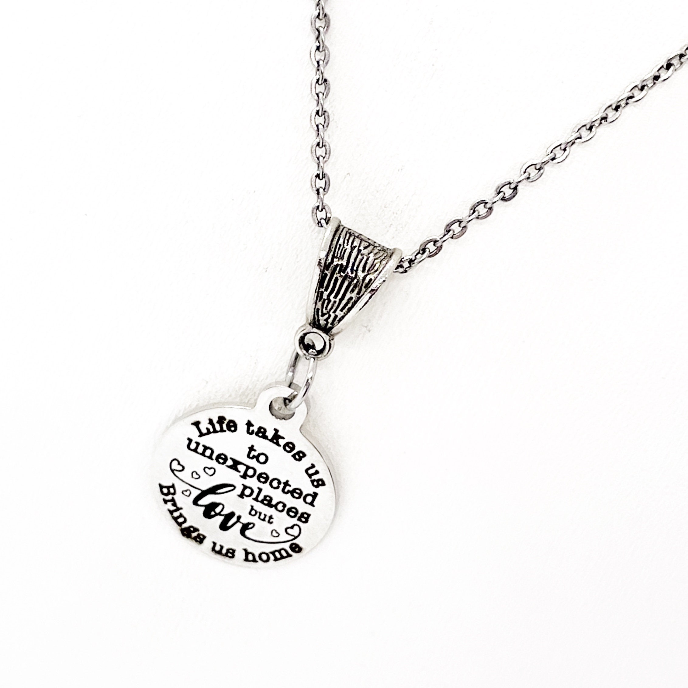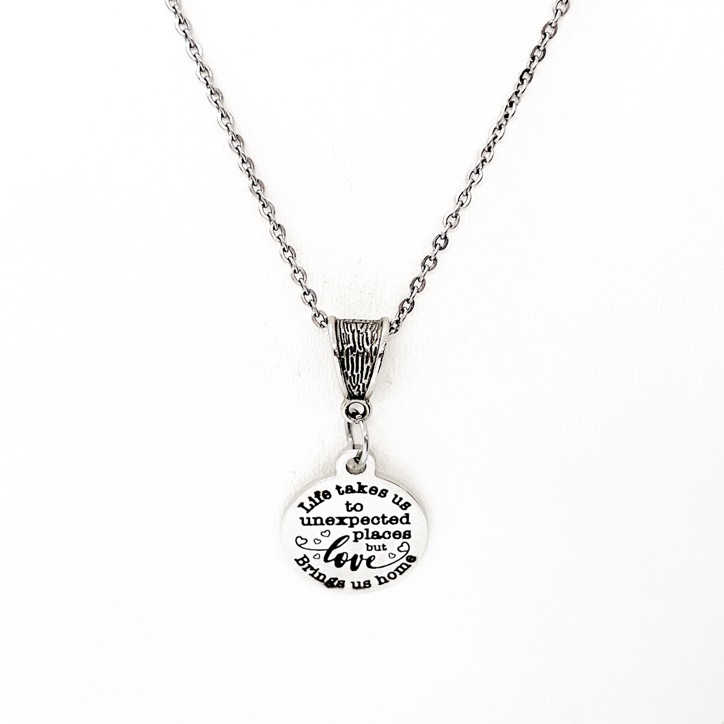 This beautiful necklace would make a great love jewelry piece. The pendant is a stainless steel laser engraved charm with “Life takes us to unexpected places but love brings us home” on it with a silver-tone bail.