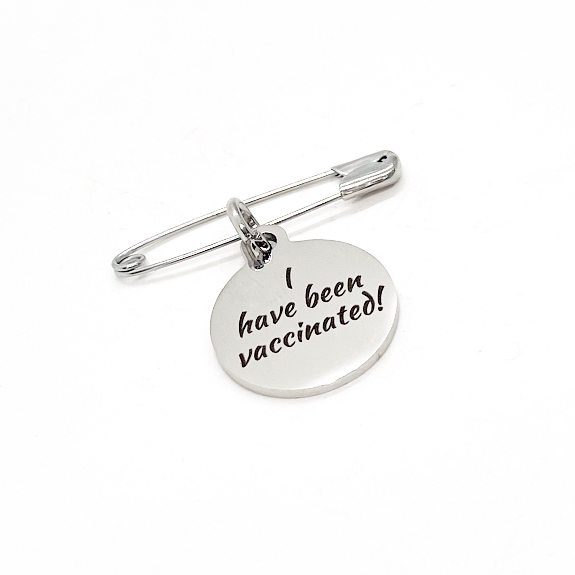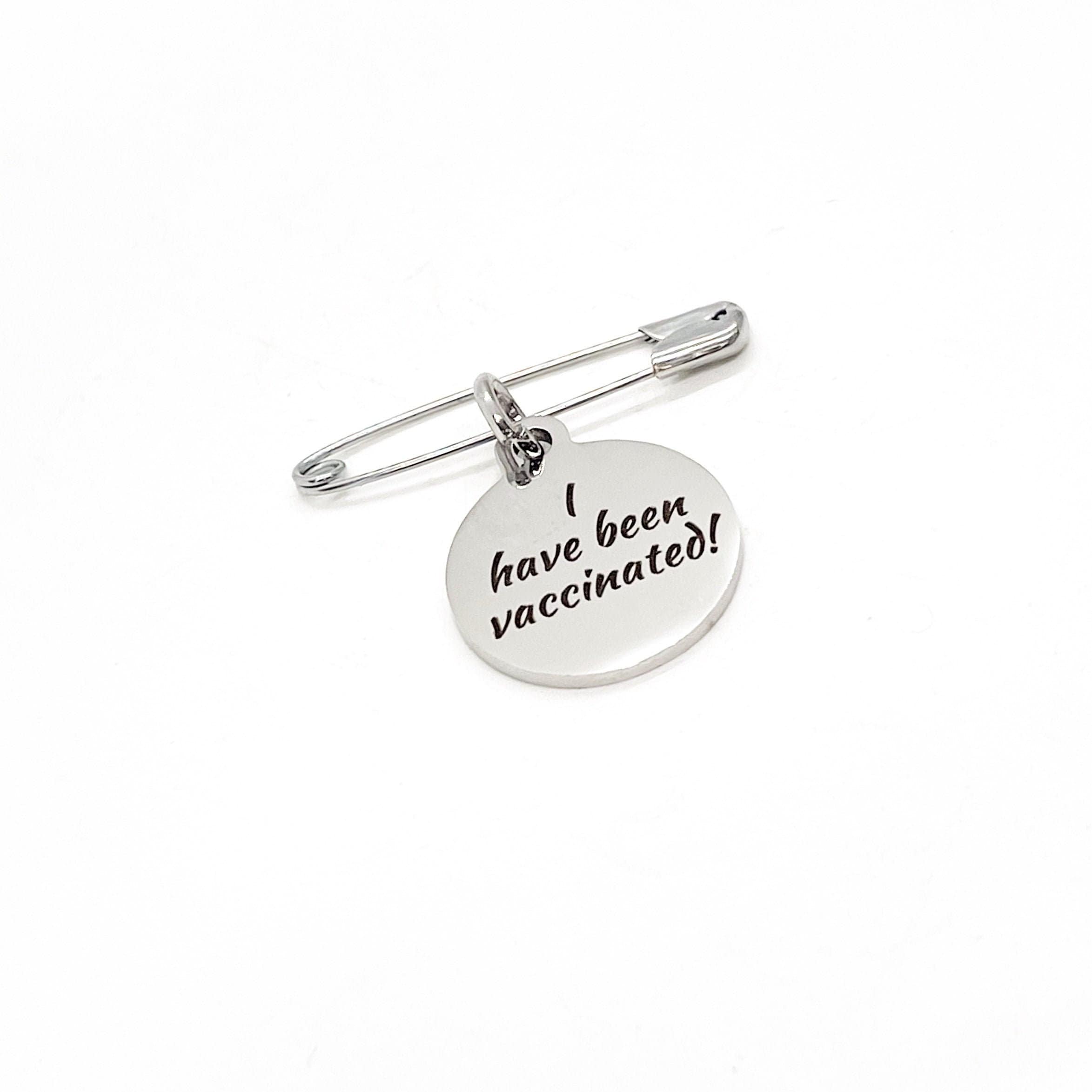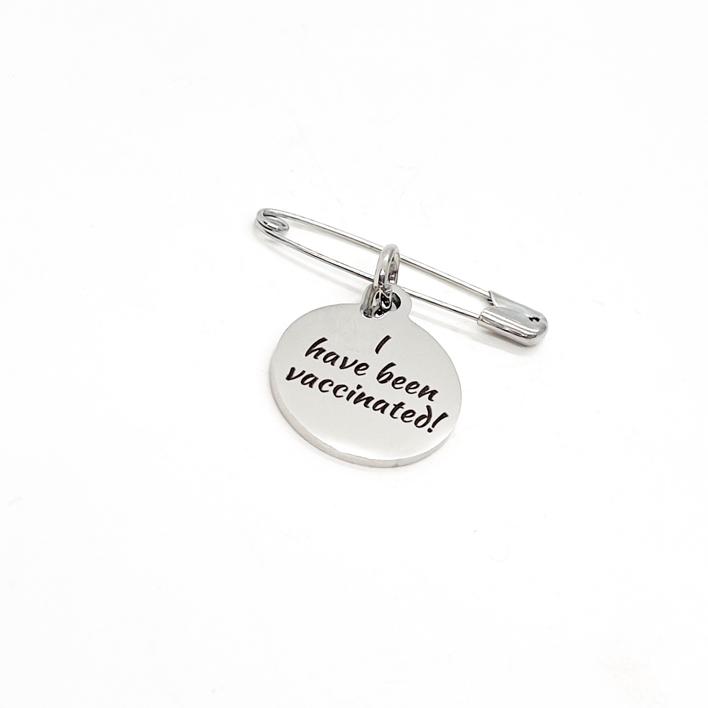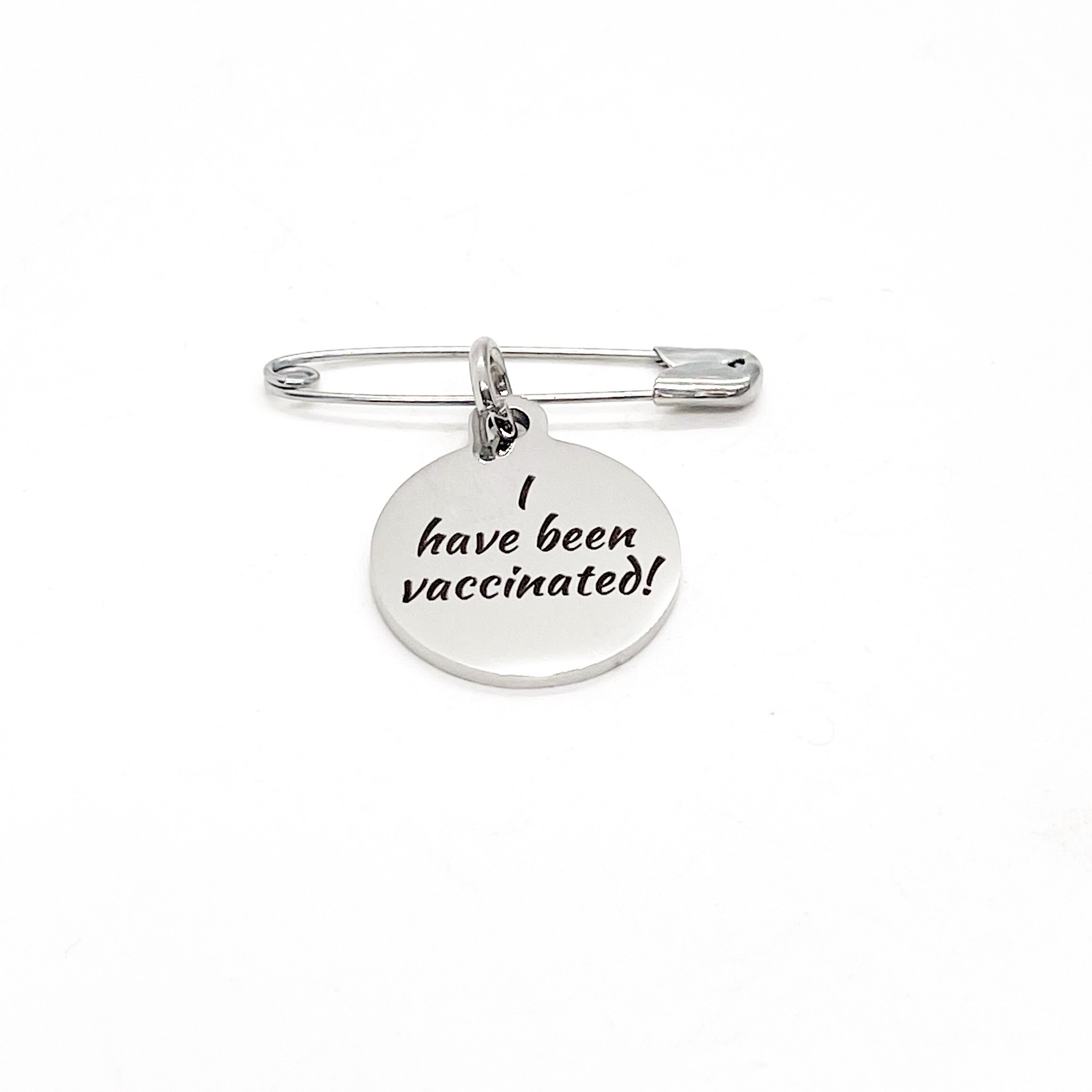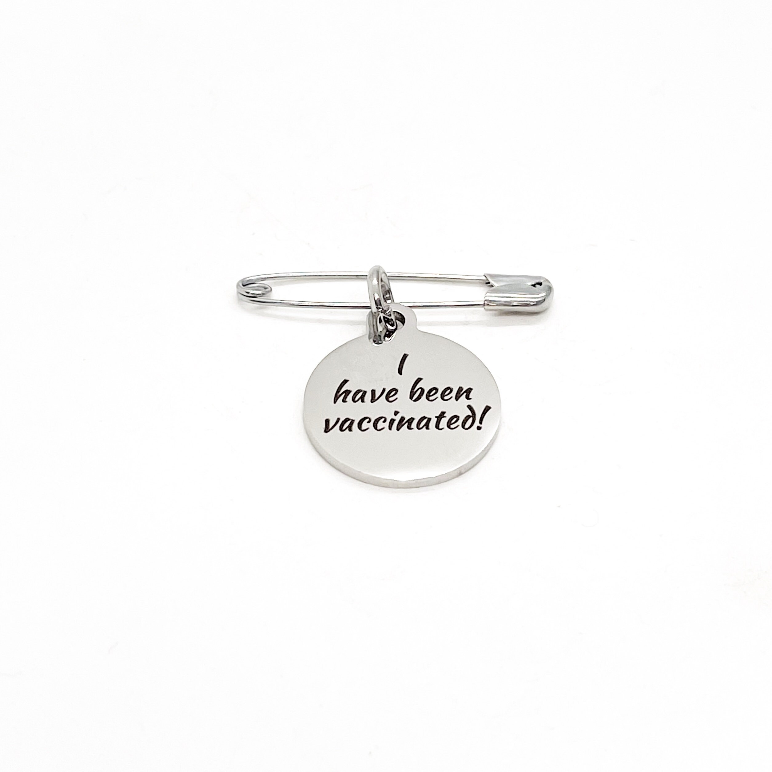 This is a pin with a stainless steel laser engraved charm with “I have been vaccinated” on it. The charm measures approx. 3/4 inch across.