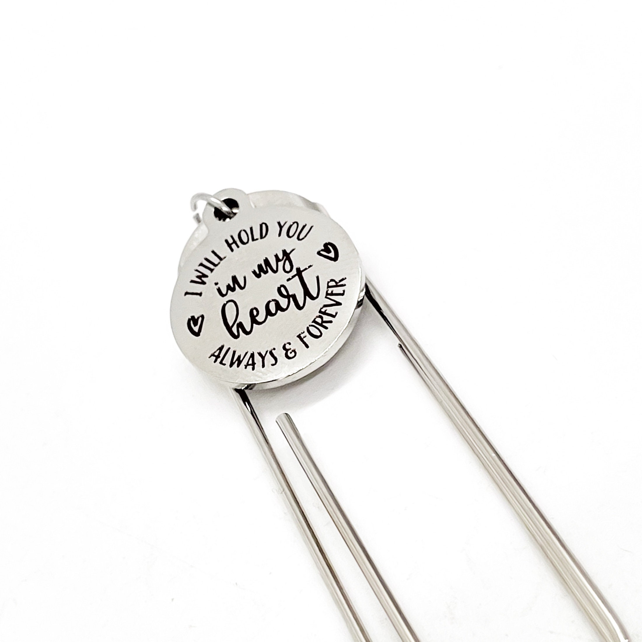 This is a great large paper clip style bookmark that has a stainless steel laser engraved charm with "I will hold you in my heart always and forever" on it. It can be used as a bookmark, page marker, or planner book mark.