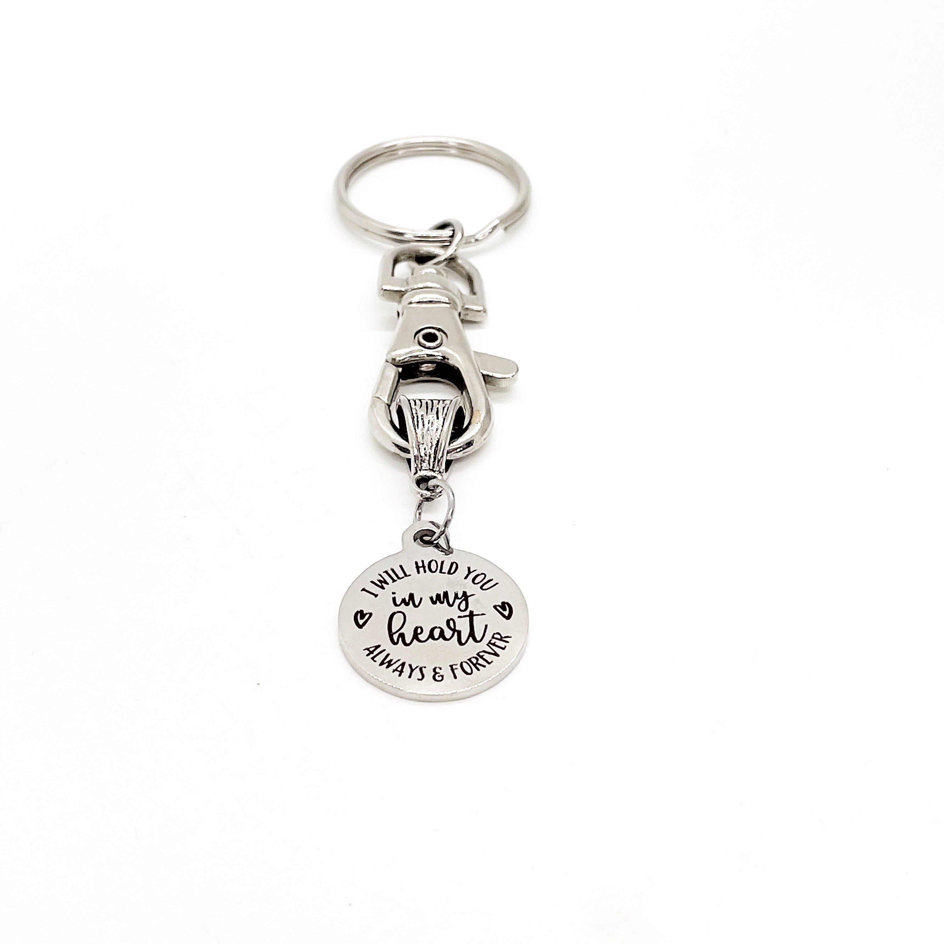 This is a great keychain that has a stainless steel laser engraved charm which says, "I will hold you in my heart always and forever".