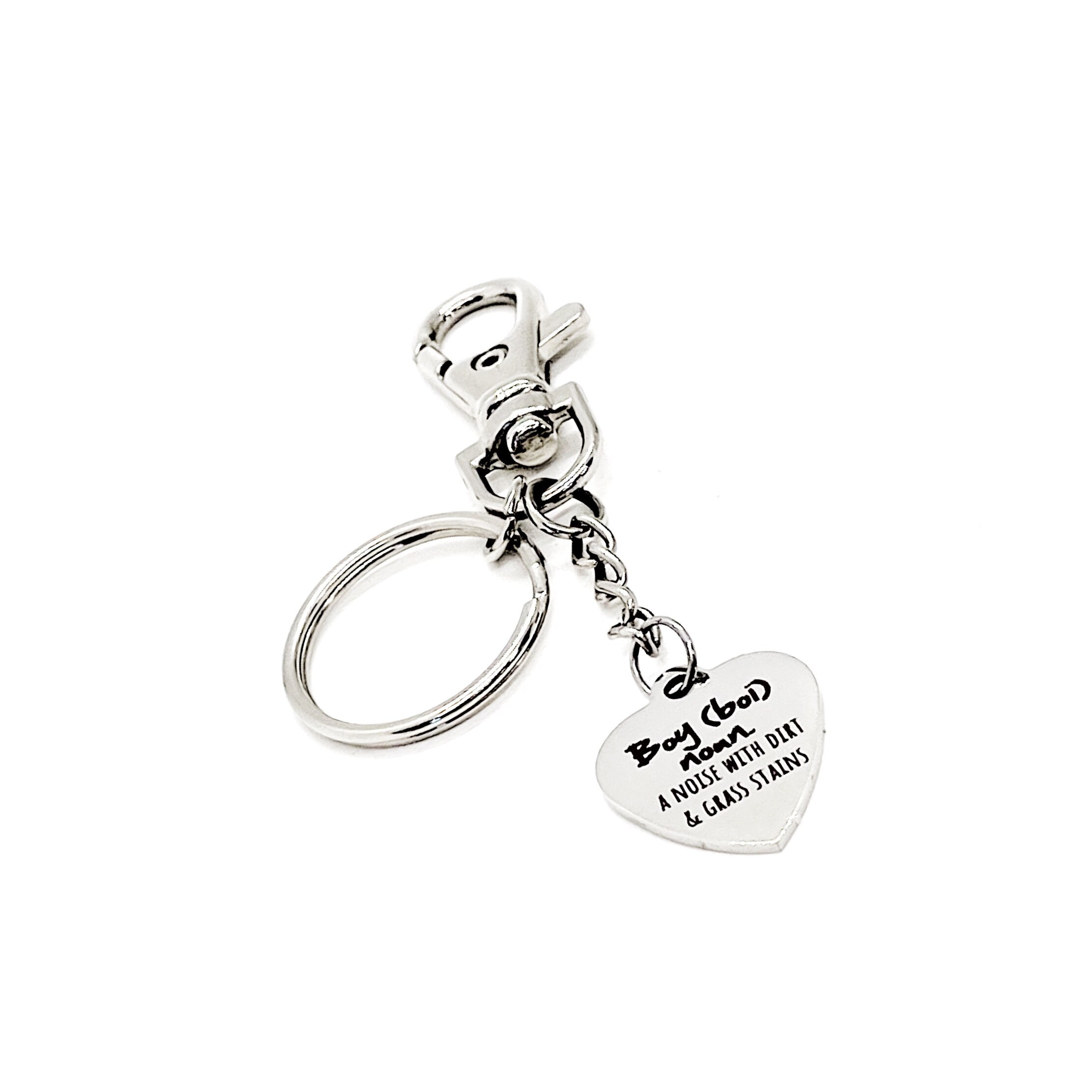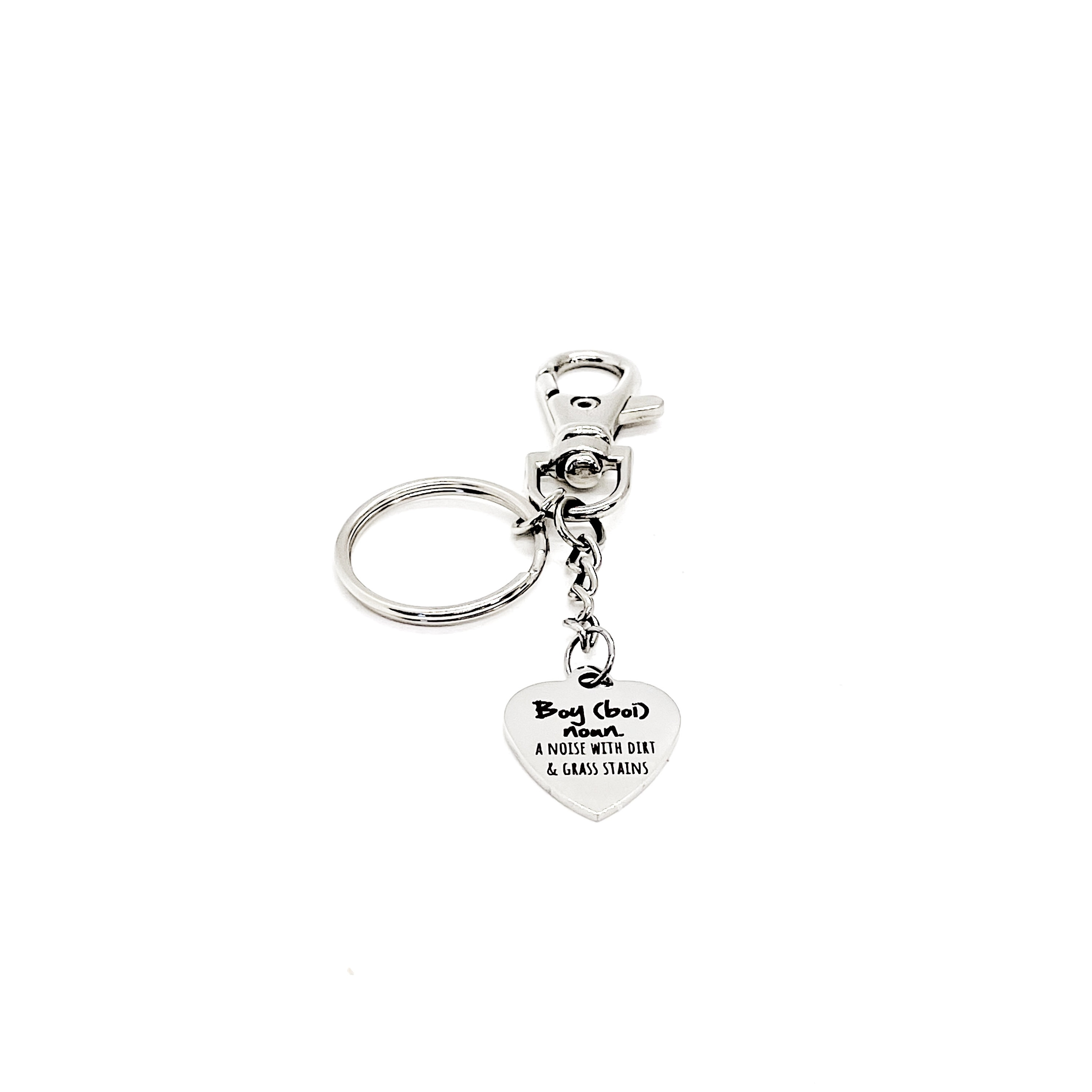 This is a great keychain gift. The keyring can be clipped onto your bag to make it easy to access without digging to the bottom of the bag. It has a stainless steel laser engraved charm with “Boy - A noise with dirt and grass stains” on it. The charm measures approx. 3/4 inch across.