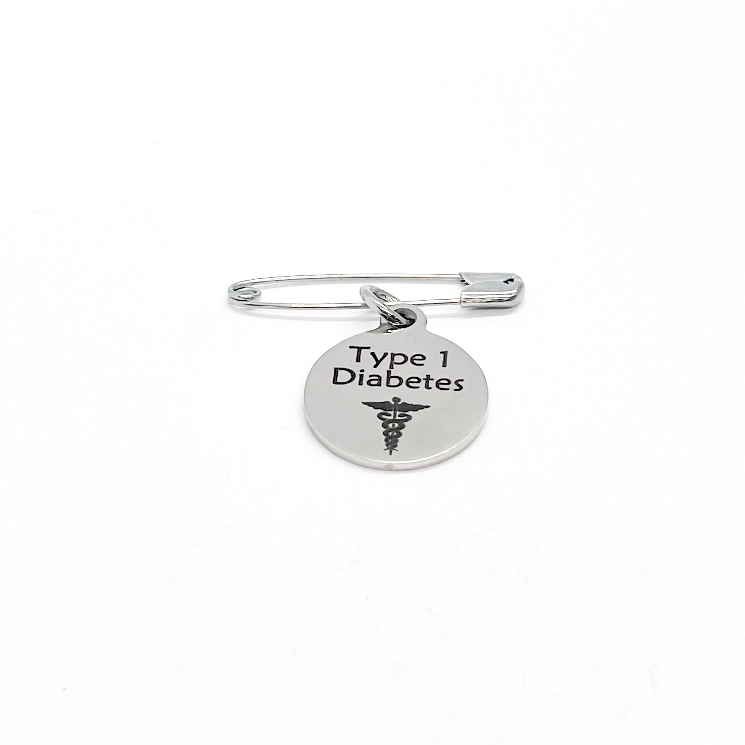 This is a safety pin with a stainless steel laser engraved charm with “Type 1 Diabetes” on it. The charm measures approx. 3/4 inch across.