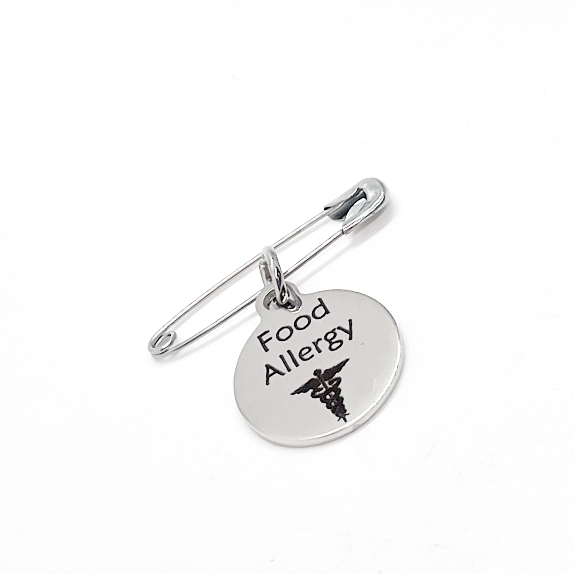 This is a safety pin with a stainless steel laser engraved charm with “Food Allergy” on it. The charm measures approx. 3/4 inch across.