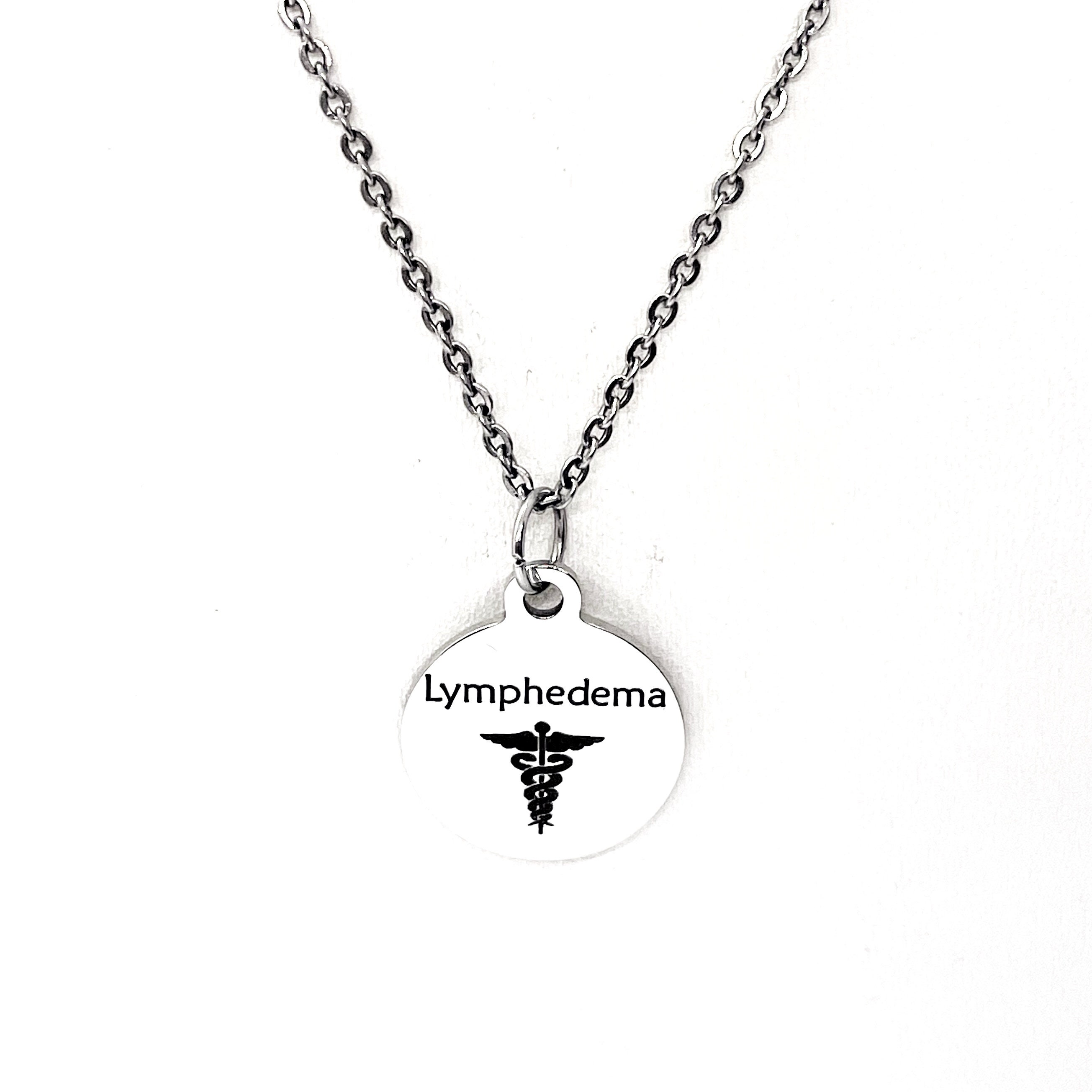 This is a stainless steel laser engraved pendant on a stainless steel chain. The pendant has “Lymphedema” and a medical caduceus symbol on it. This pendant is available on your choice of 16, 18, 20, 22, 24, 26, 28 or 30 inch chain. The pendant is also available for individual purchase if you have another chain on which you would like to wear it. For an additional charge, the charm can be customized to meet your specific needs.