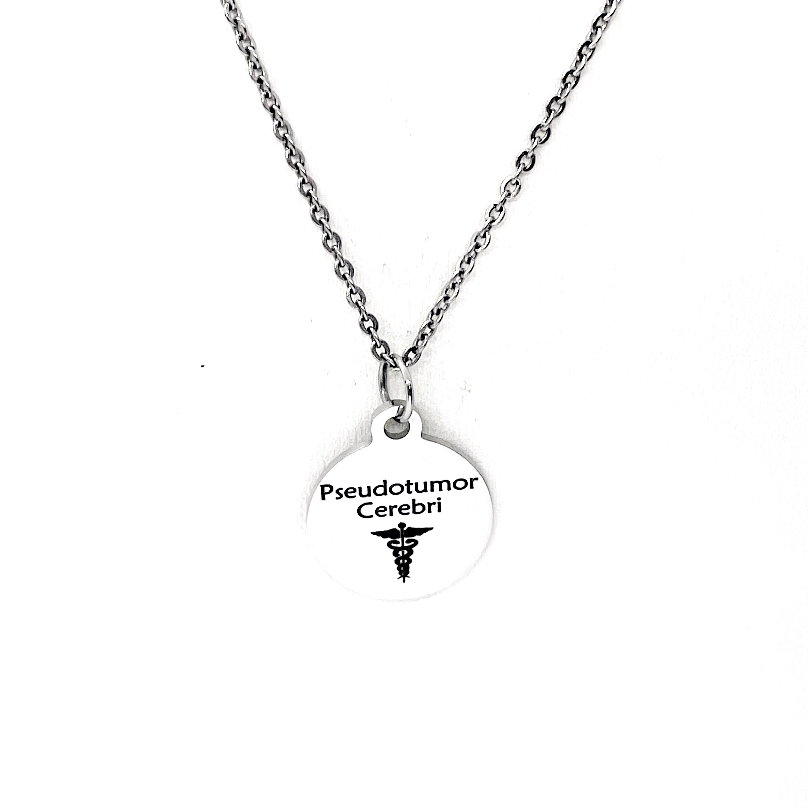 This is a stainless steel laser engraved pendant on a stainless steel chain. The pendant has “Pseudotumor Cerebri” and a medical caduceus symbol on it. This pendant is available on your choice of 16, 18, 20, 22, 24, 26, 28 or 30 inch chain. The pendant is also available for individual purchase if you have another chain on which you would like to wear it. For an additional charge, the charm can be customized to meet your specific needs.