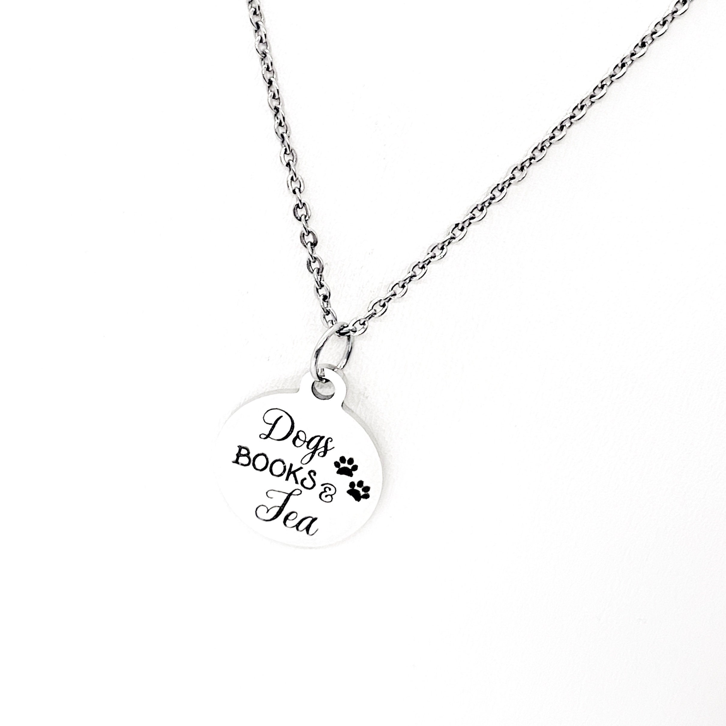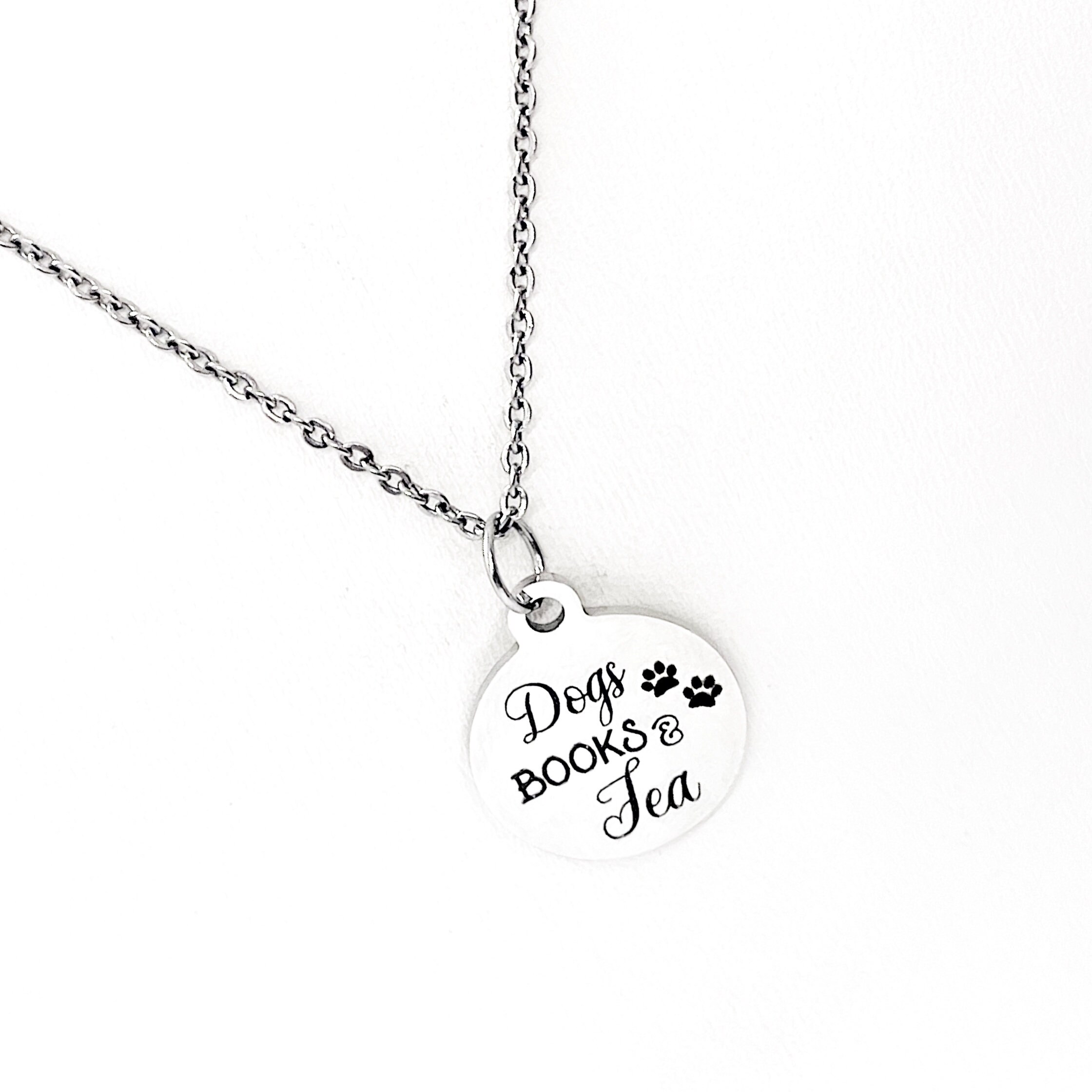 This is a stainless steel laser engraved pendant on a stainless steel chain. The pendant has “Dogs Books Tea” on it. This pendant is available on your choice of 16, 18, 20, 22, 24, 26, 28 or 30 inch chain. The pendant is also available for individual purchase if you have another chain on which you would like to wear it. For an additional charge, the charm can be customized to meet your specific needs.
