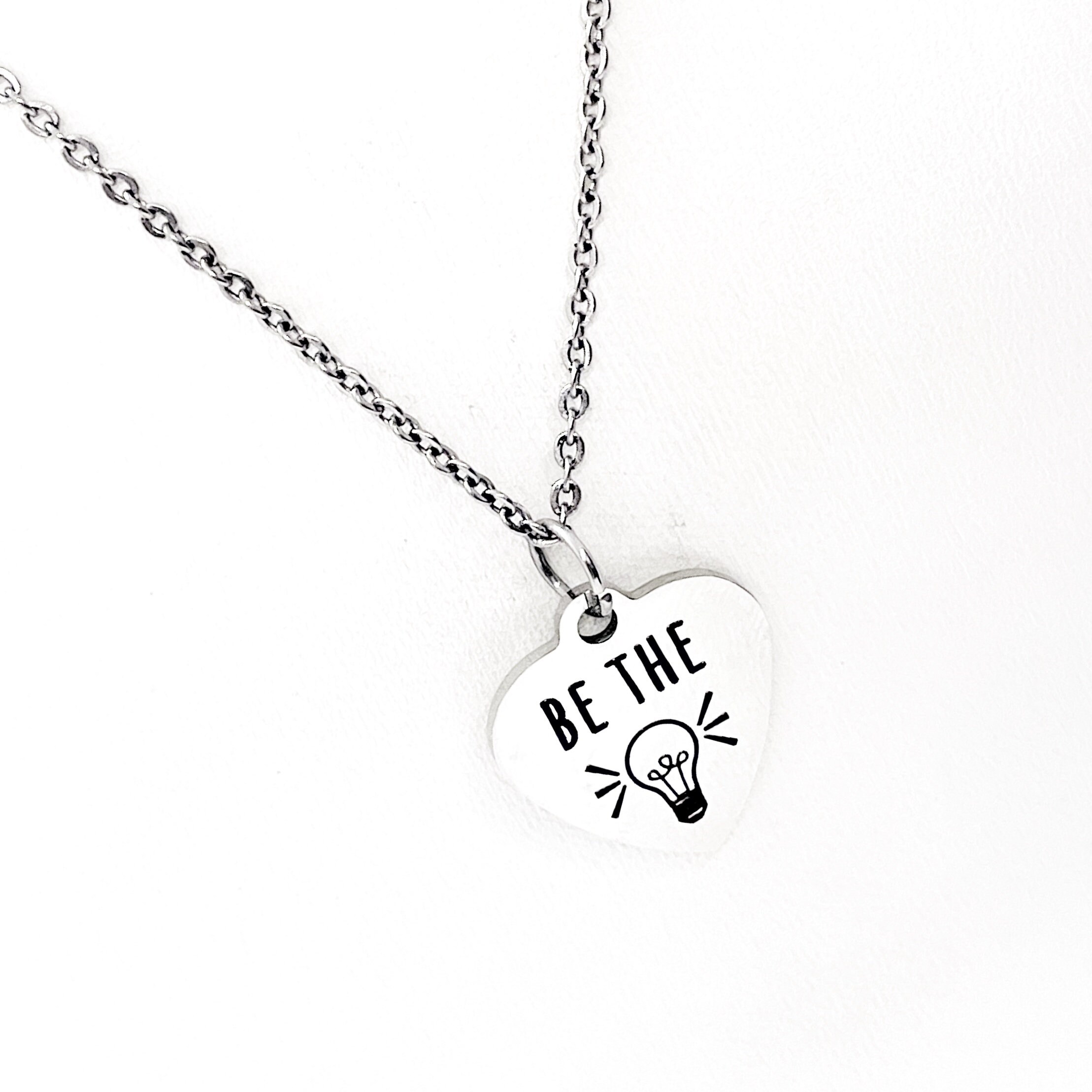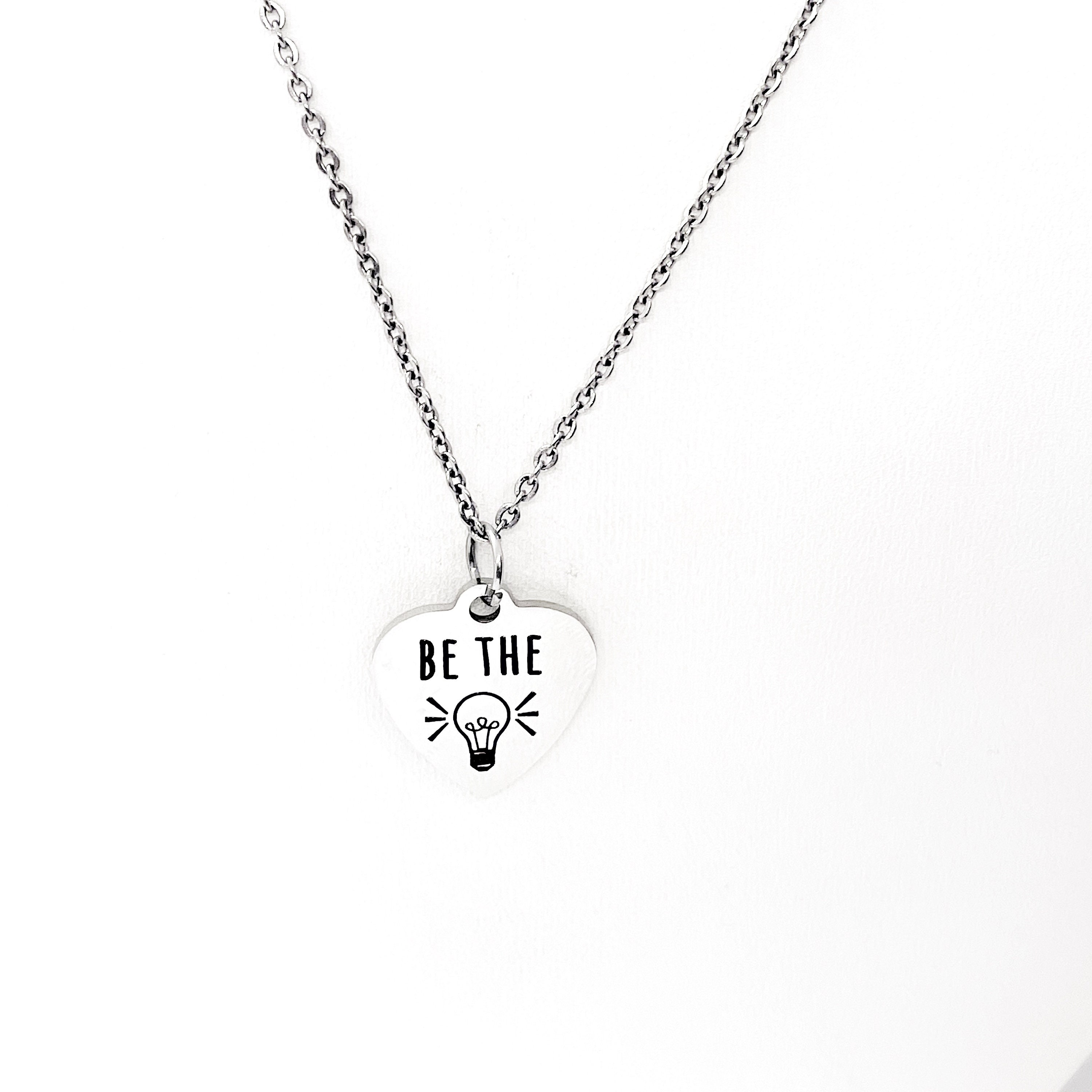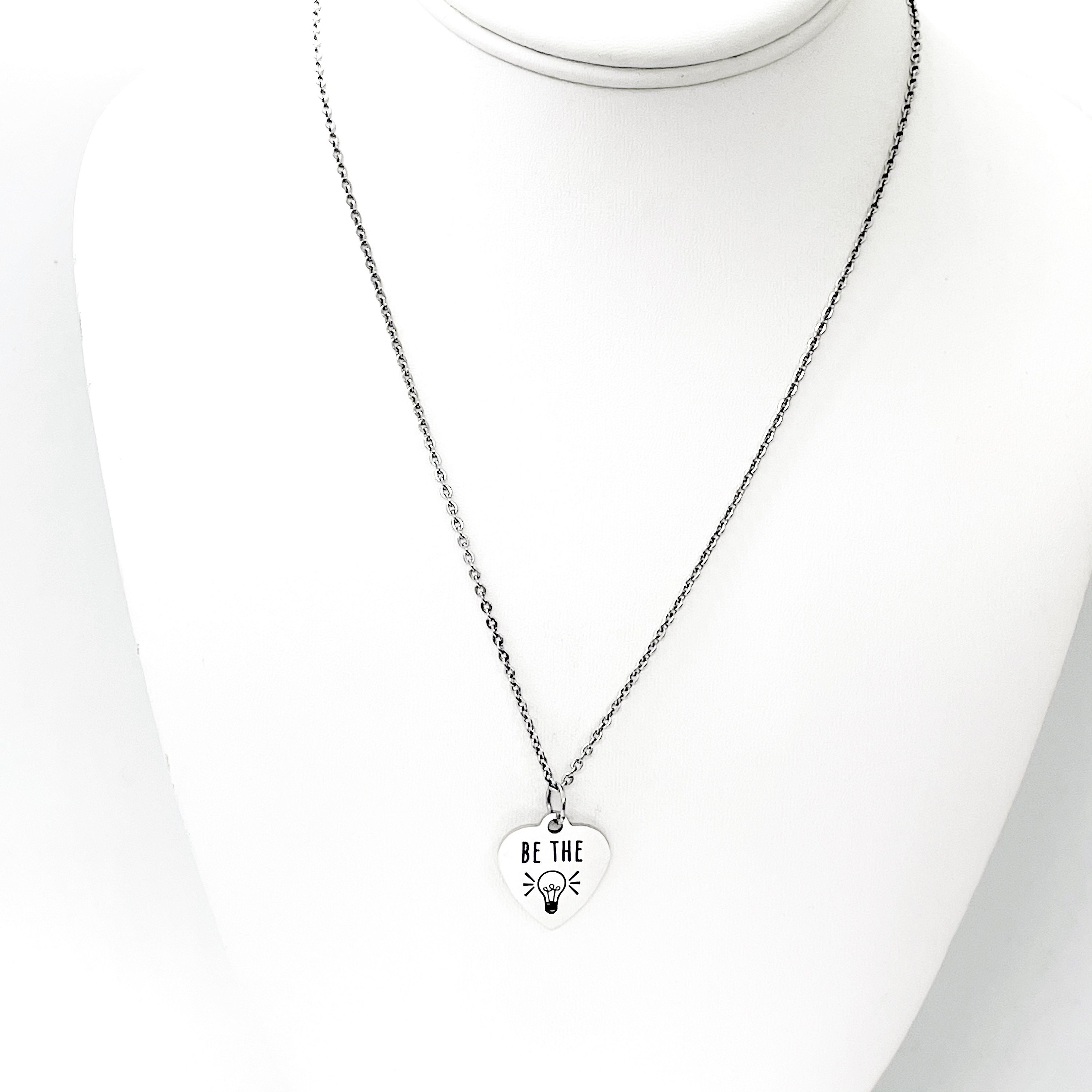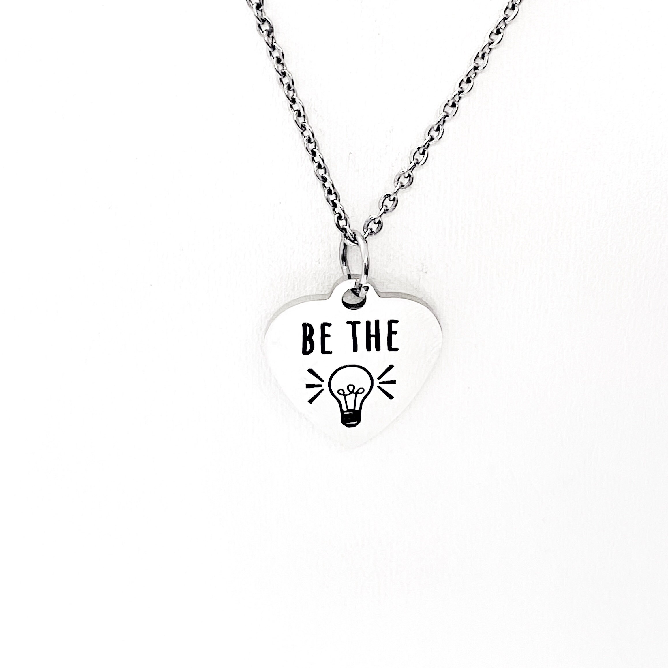 This is a stainless steel laser engraved pendant on a stainless steel chain. The pendant has “Be the light” on it. This pendant is available on your choice of 16, 18, 20, 22, 24, 26, 28 or 30 inch chain. The pendant is also available for individual purchase if you have another chain on which you would like to wear it. For an additional charge, the charm can be customized to meet your specific needs.