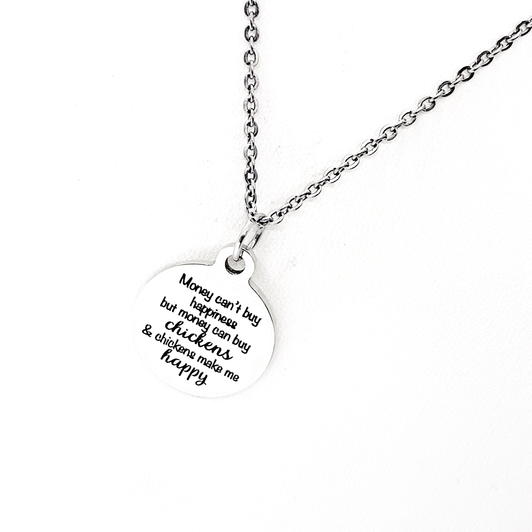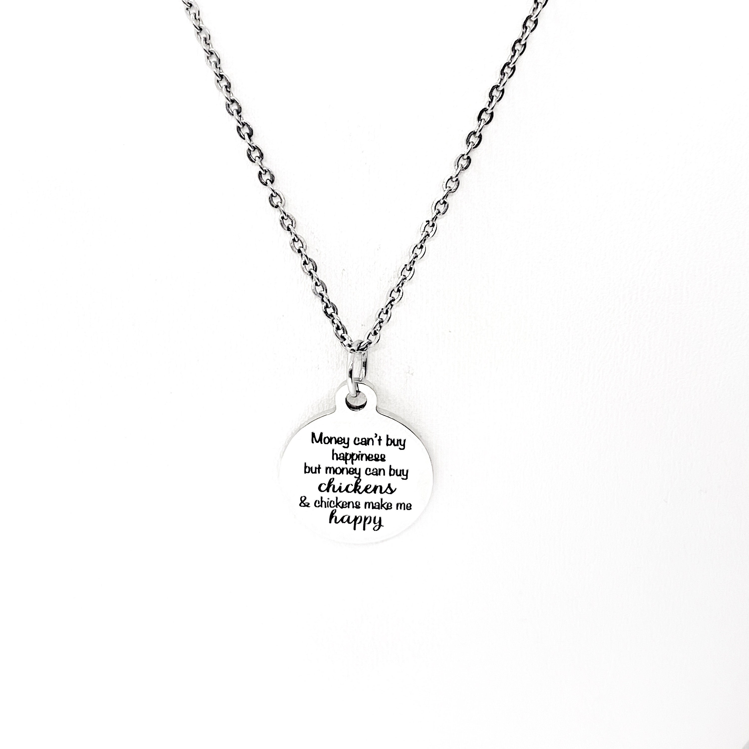 This is a stainless steel laser engraved pendant on a stainless steel chain. The pendant has “Money can’t buy happiness, but money can buy chickens & chickens make me happy” on it. This pendant is available on your choice of 16, 18, 20, 22, 24, 26, 28 or 30 inch chain. The pendant is also available for individual purchase if you have another chain on which you would like to wear it. For an additional charge, the charm can be customized to meet your specific needs.