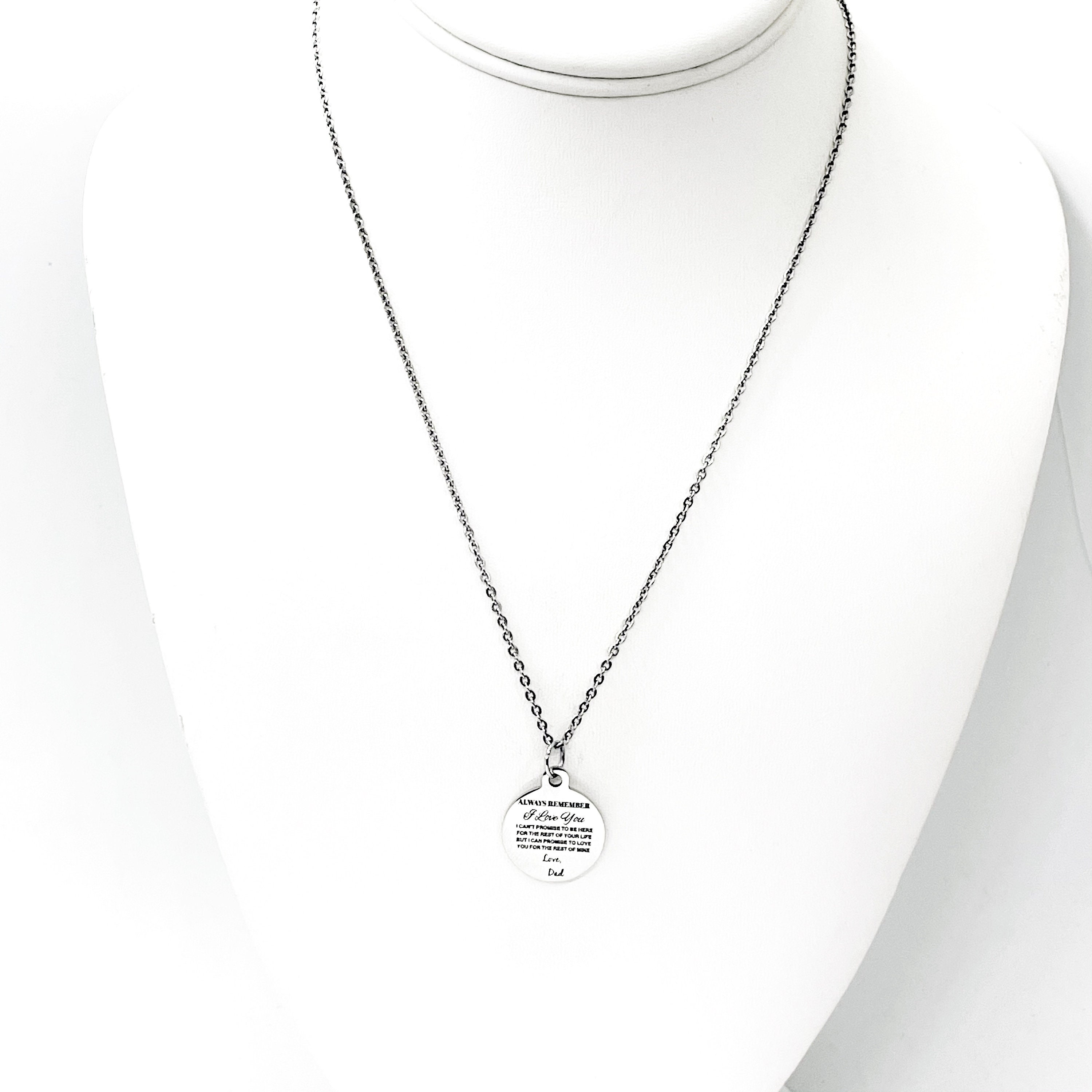 This is a stainless steel laser engraved pendant on a stainless steel chain. The pendant has “Always remember I Love You I can’t promise to be here for the rest of your life, but I promise to love you for the rest of mine.” on it. This pendant is available on your choice of 16, 18, 20, 22, 24, 26, 28 or 30 inch chain. The pendant is also available for individual purchase if you have another chain on which you would like to wear it. For an additional charge, the charm can be customized to meet your specific needs.
