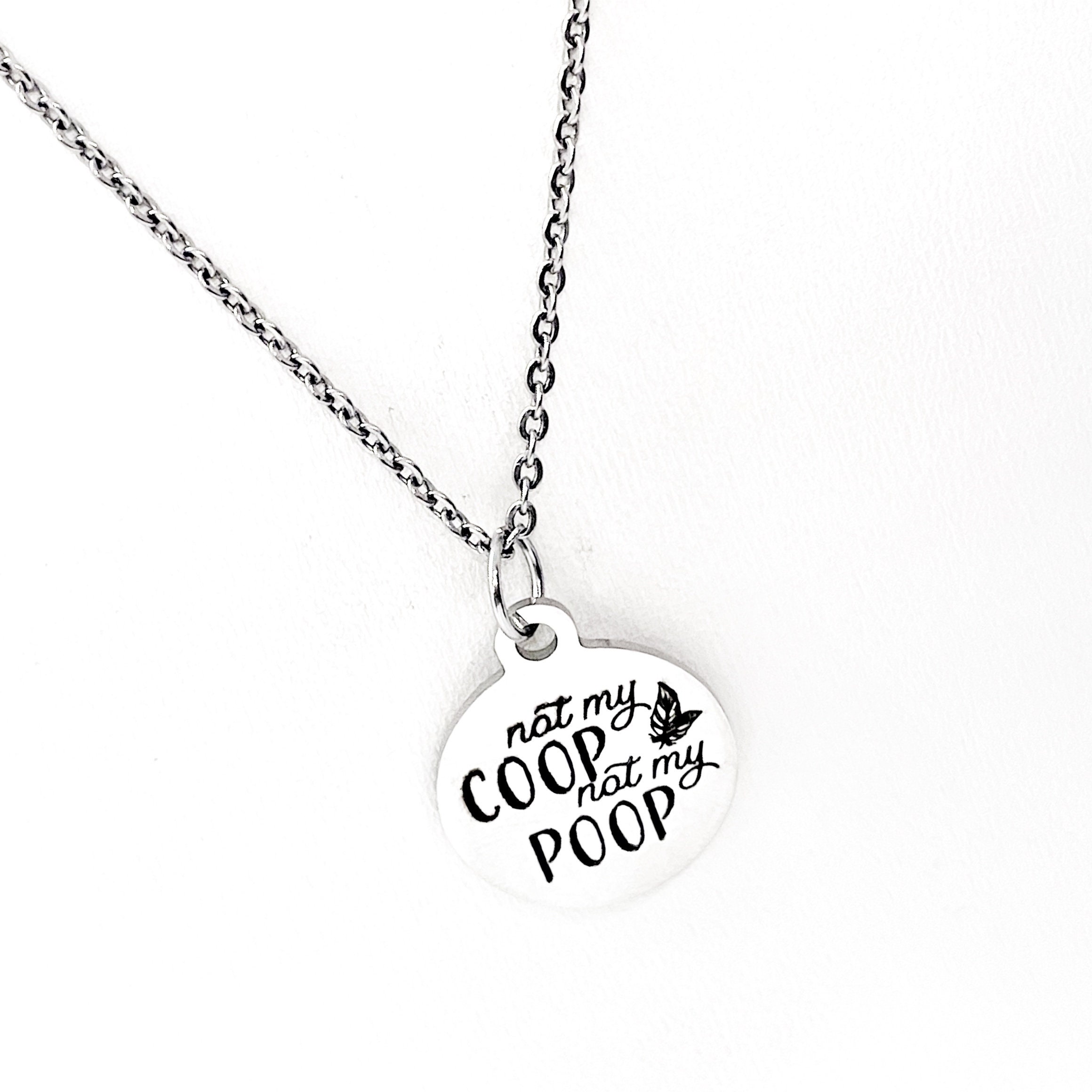 This is a stainless steel laser engraved pendant on a stainless steel chain. The pendant has “Not my coop, not my poop” on it. This pendant is available on your choice of 16, 18, 20, 22, 24, 26, 28 or 30 inch chain. The pendant is also available for individual purchase if you have another chain on which you would like to wear it. For an additional charge, the charm can be customized to meet your specific needs.