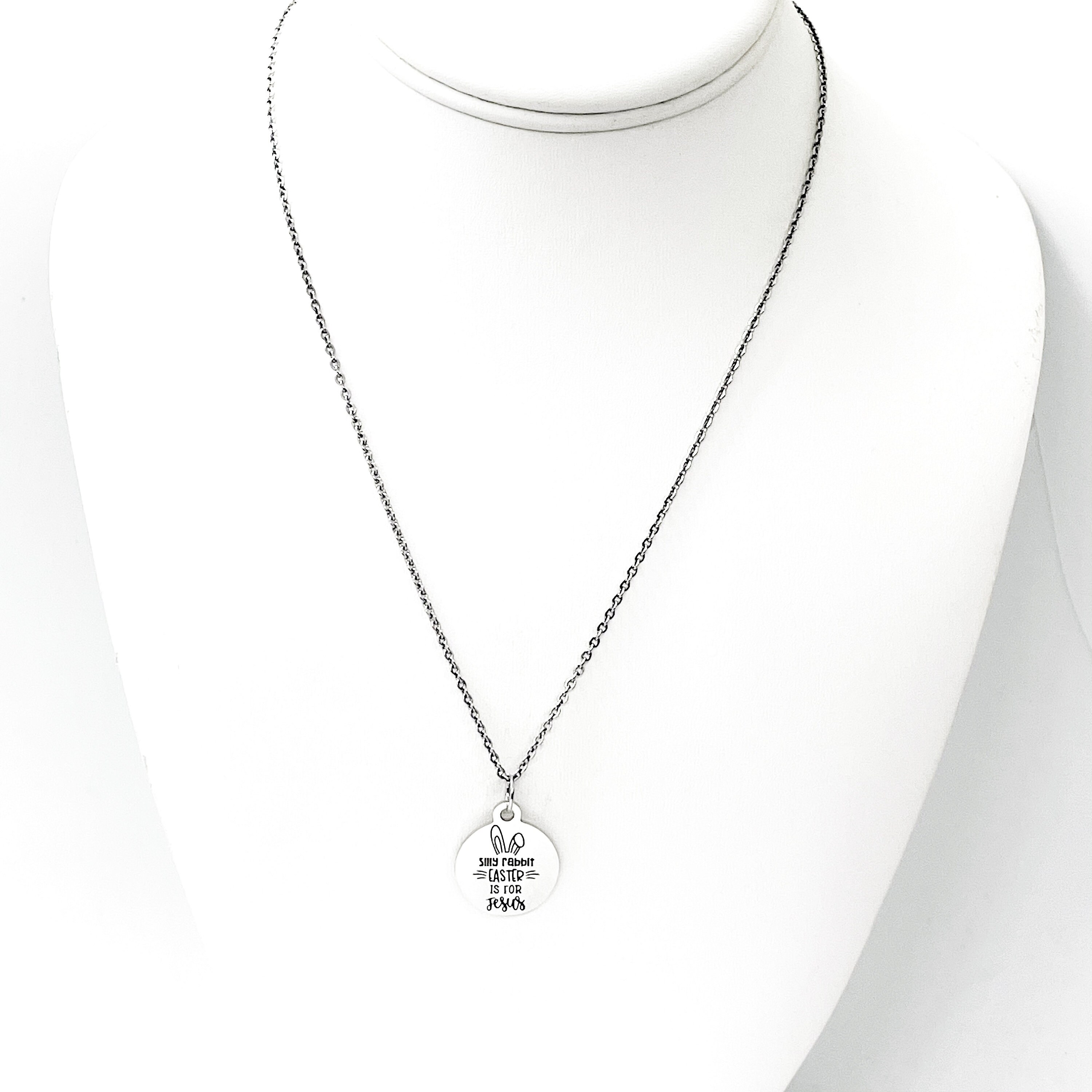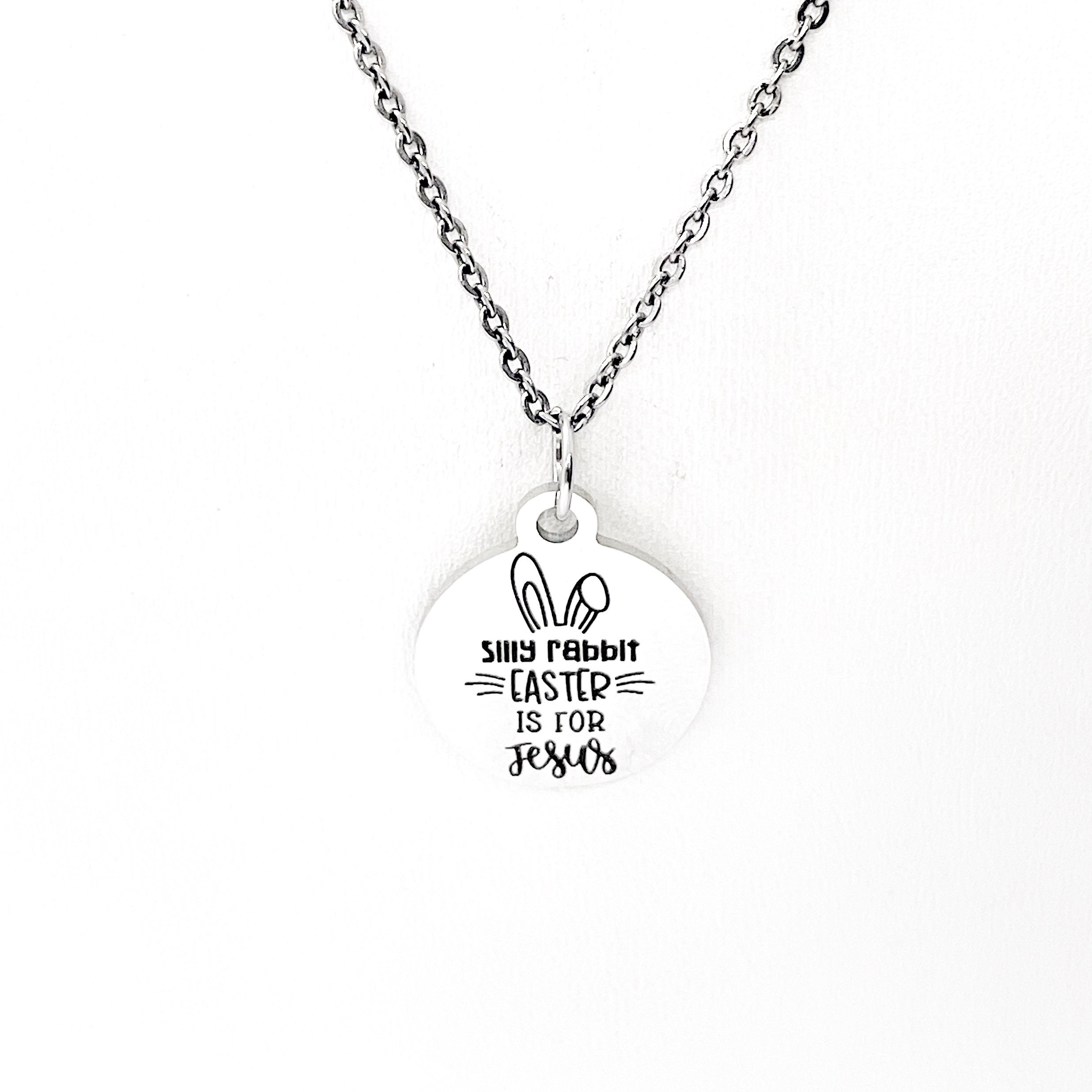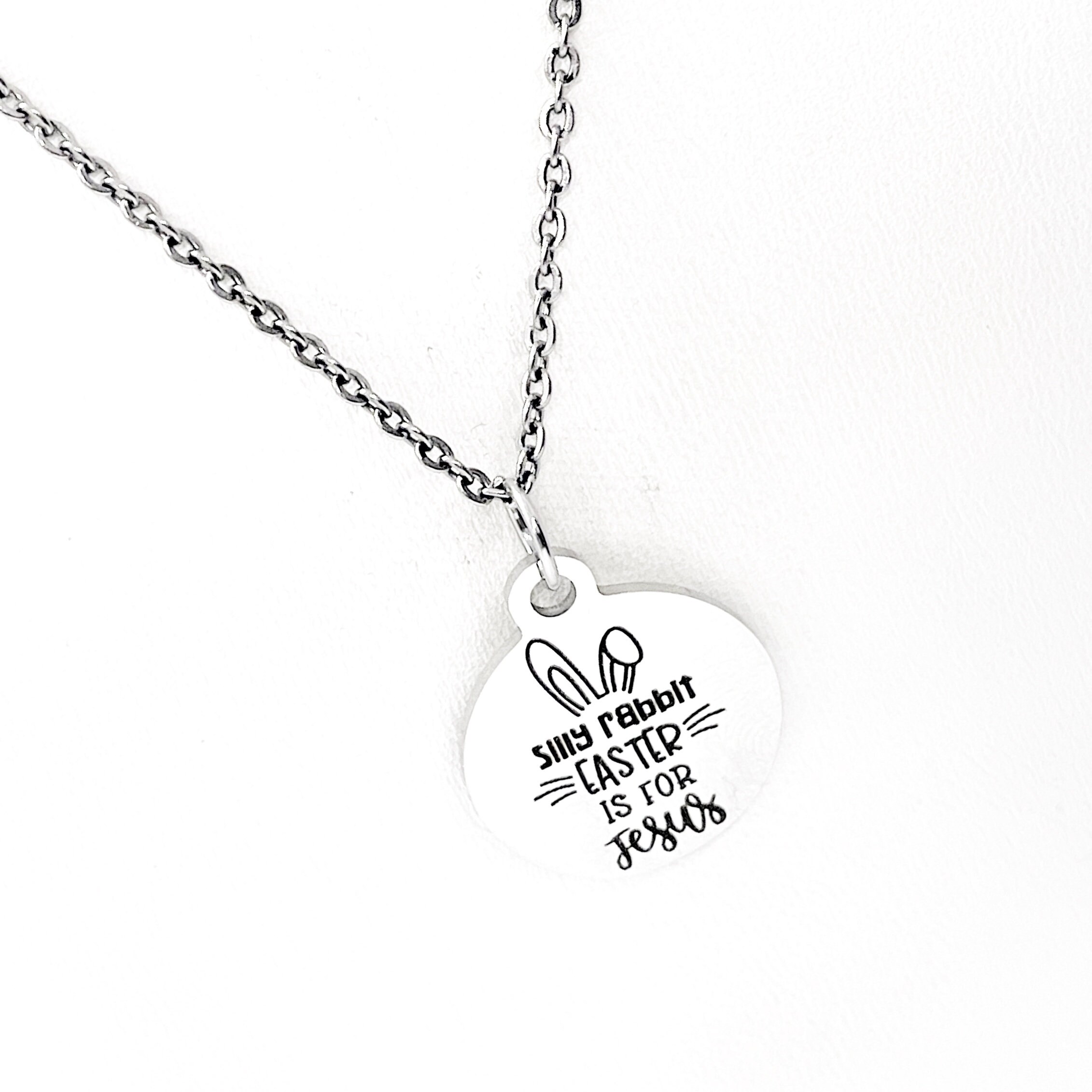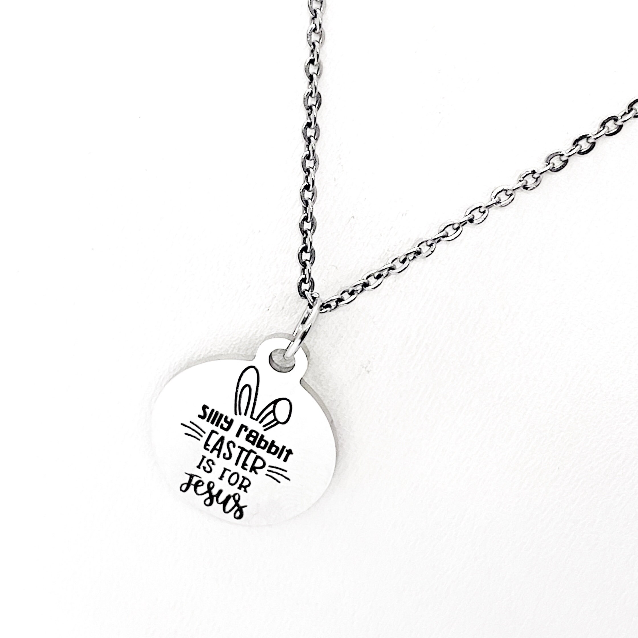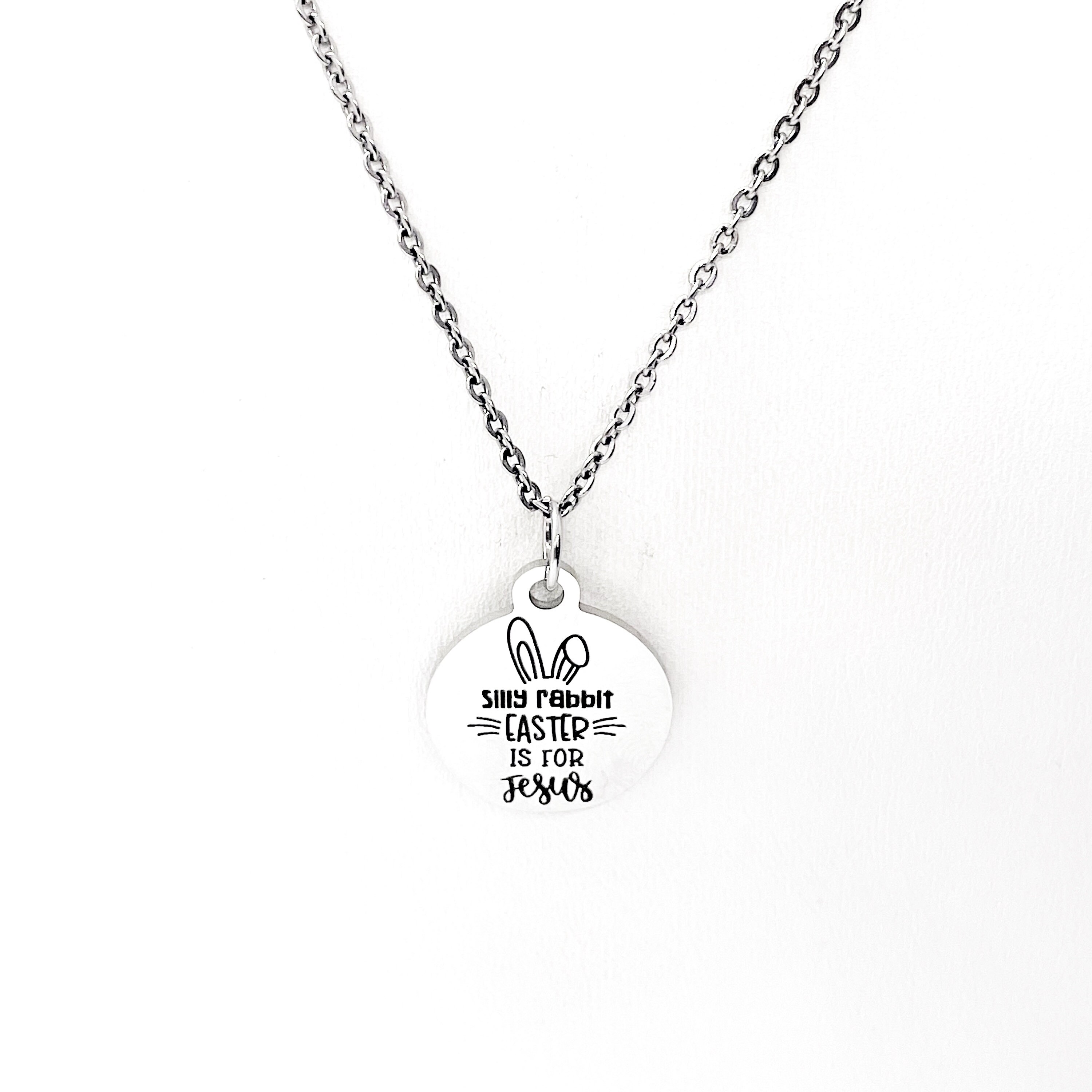 This is a stainless steel laser engraved pendant on a stainless steel chain. The pendant has “Silly rabbit Easter is for Jesus” on it. This pendant is available on your choice of 16, 18, 20, 22, 24, 26, 28 or 30 inch chain. The pendant is also available for individual purchase if you have another chain on which you would like to wear it. For an additional charge, the charm can be customized to meet your specific needs.
