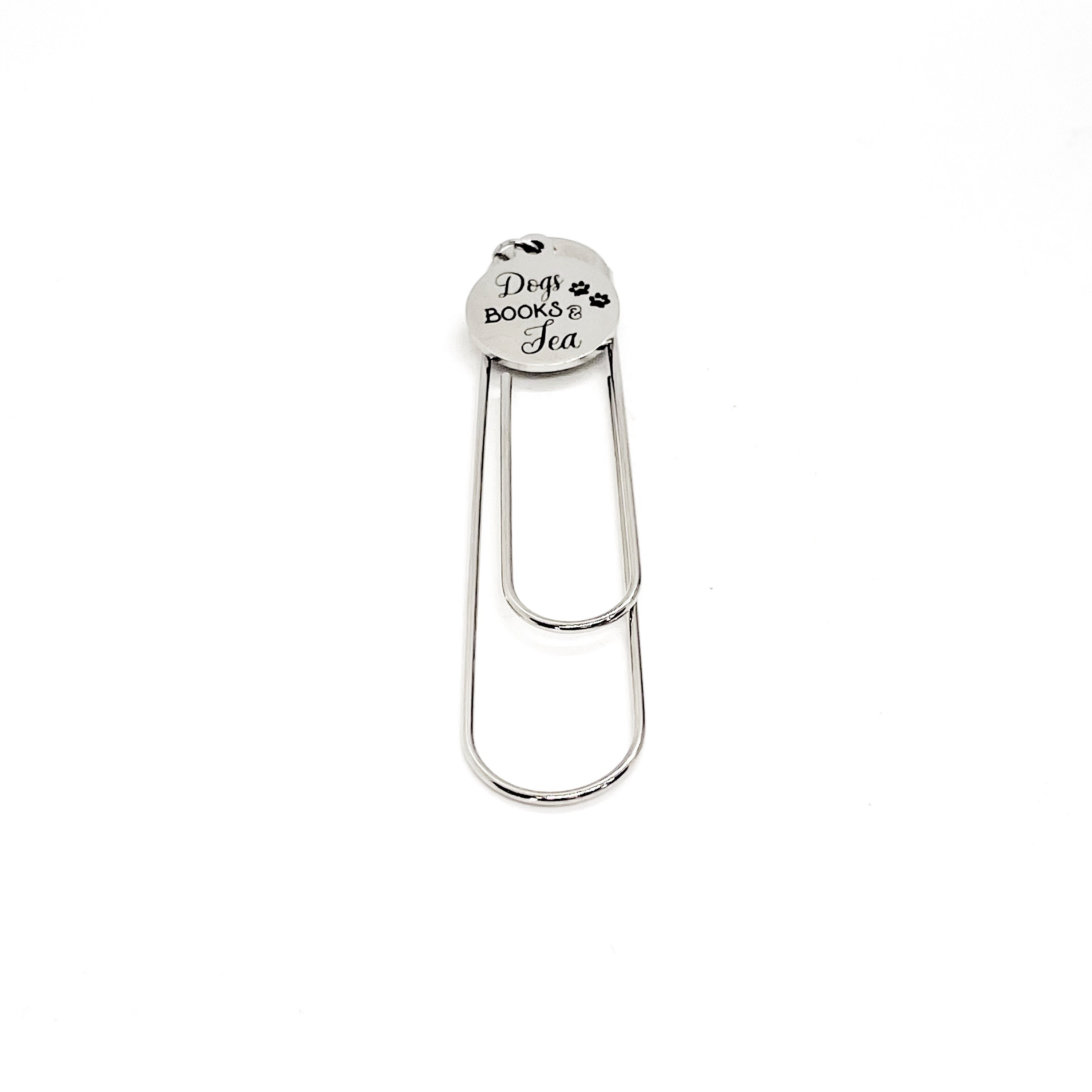 This bookmark has a stainless steel laser engraved charm that says “Dogs Books Tea”. The charm measures approx. 3/4 inch across.