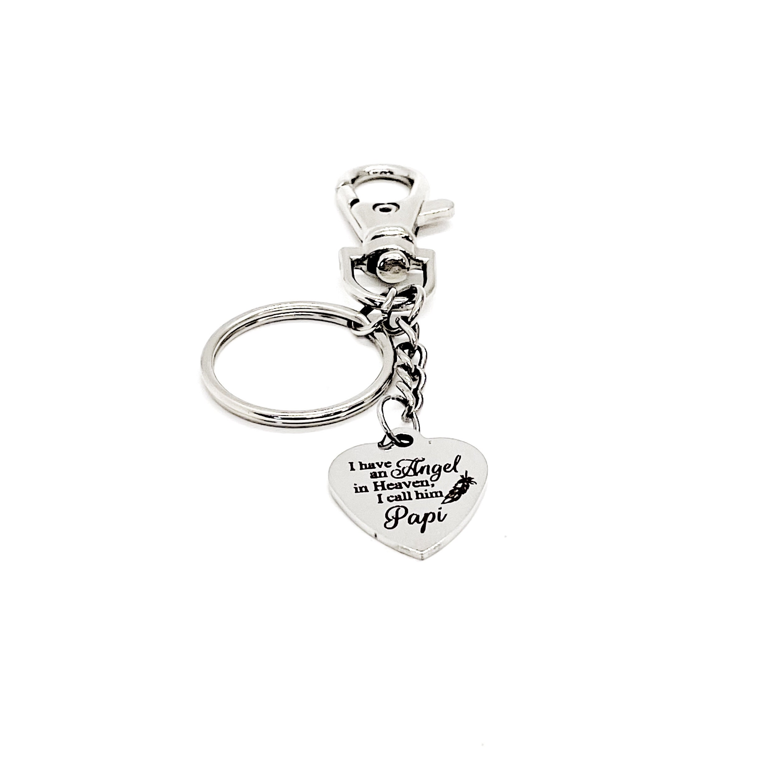 This is a great keychain gift. The keyring can be clipped onto your bag to make it easy to access without digging to the bottom of the bag. It has a stainless steel laser engraved charm with “I have an angel in heaven, I call him Papi” on it. The charm measures approx. 3/4 inch across.