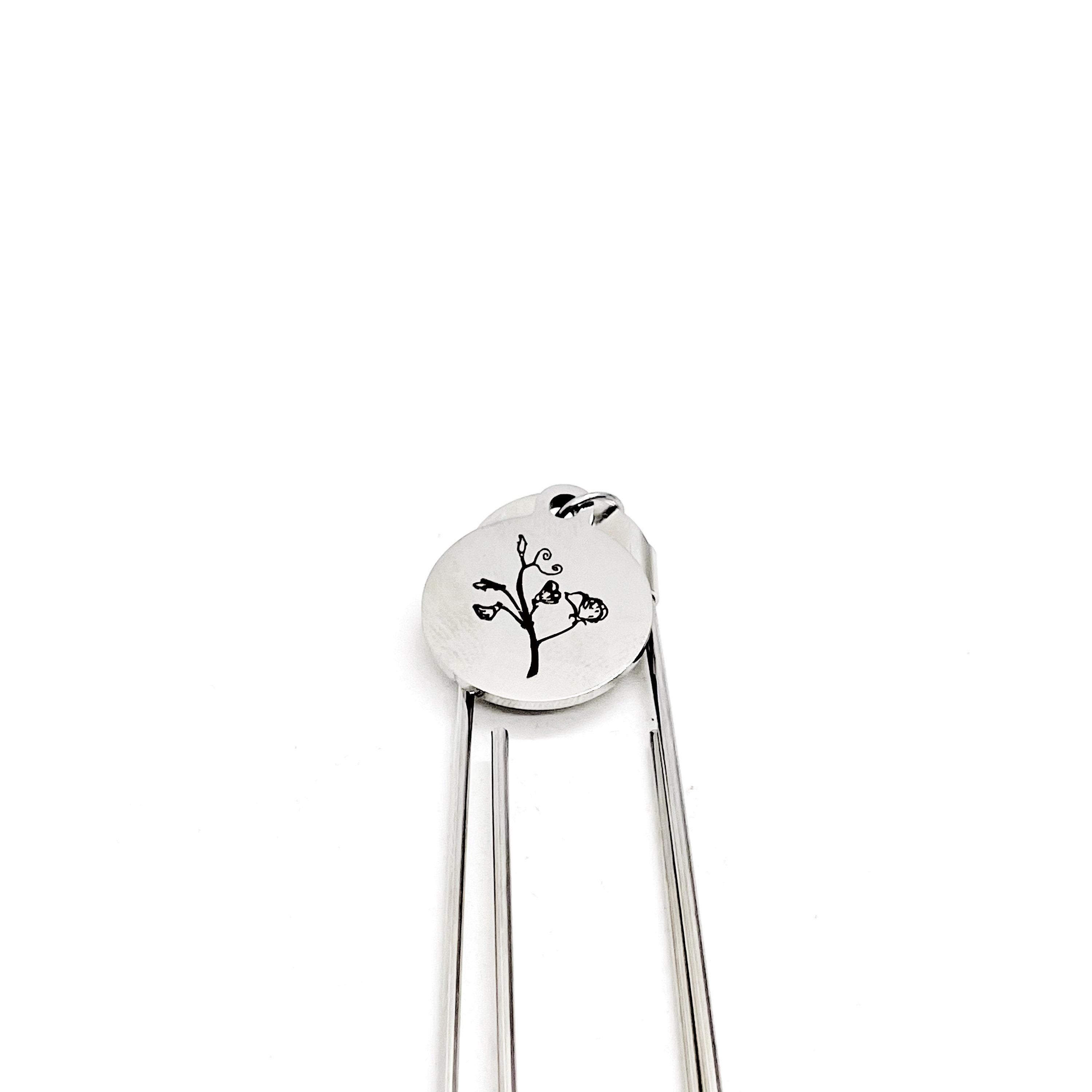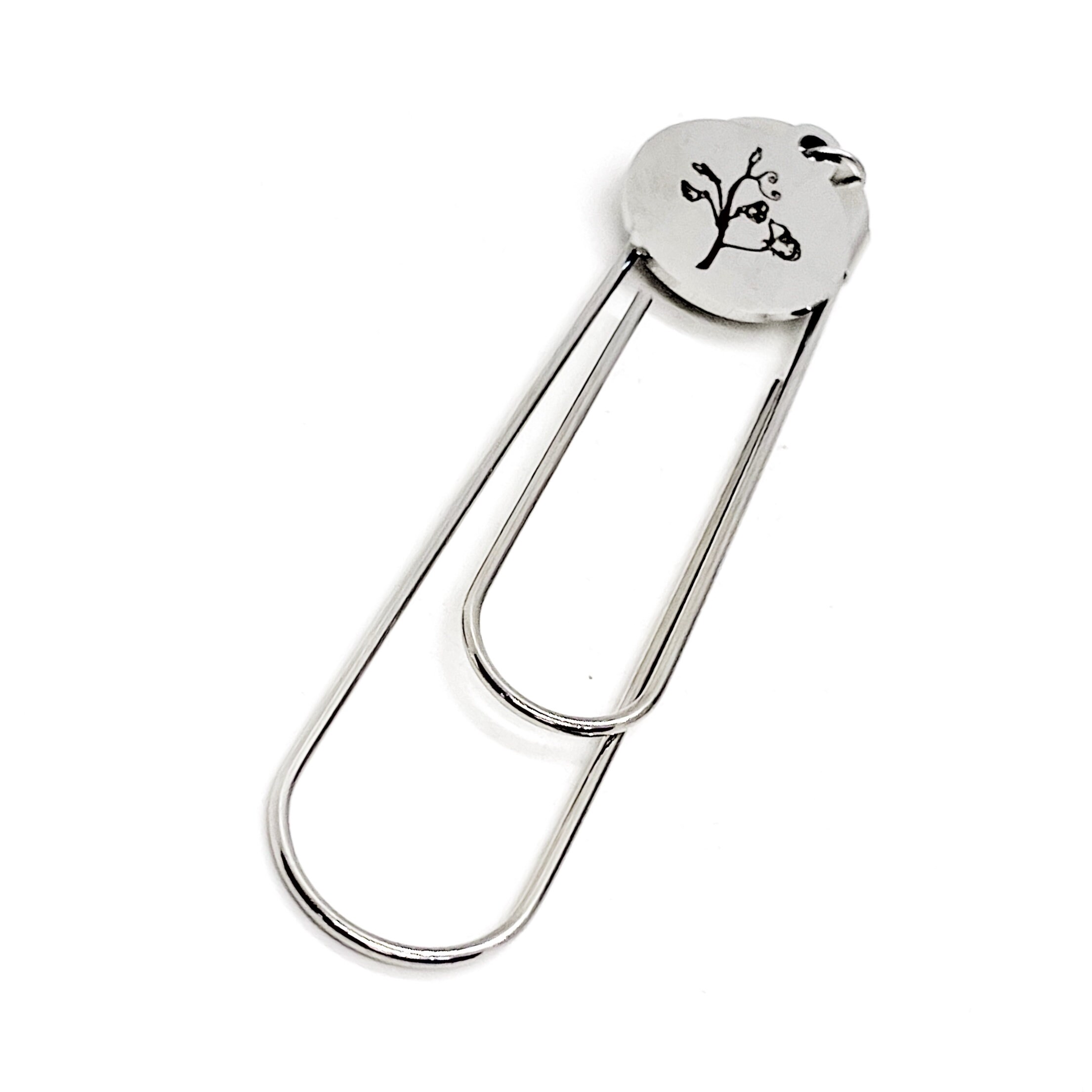 This bookmark has a stainless steel laser engraved charm that has a sweet pea, the birth month flower for April on it. The charm measures approx. 3/4 inch across.