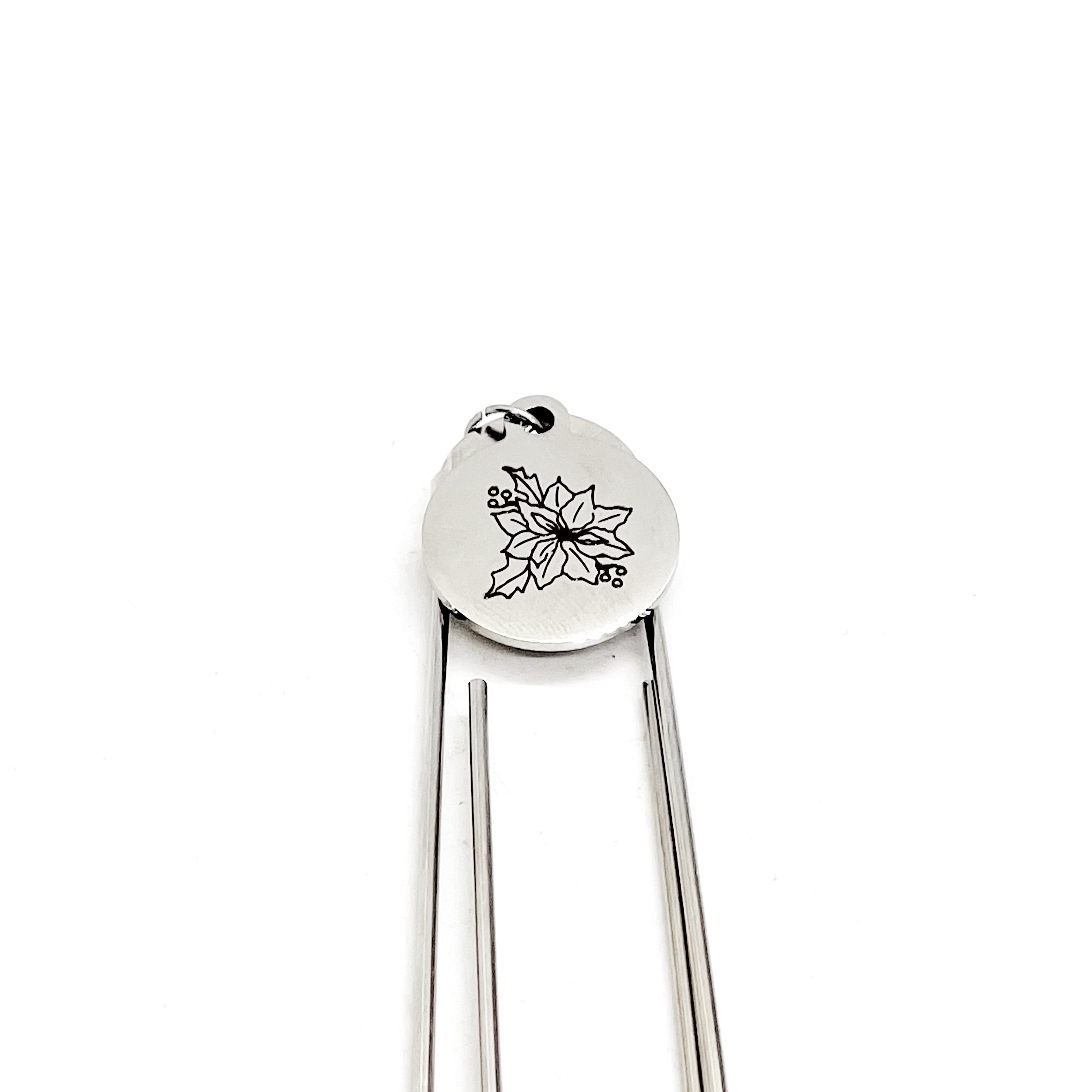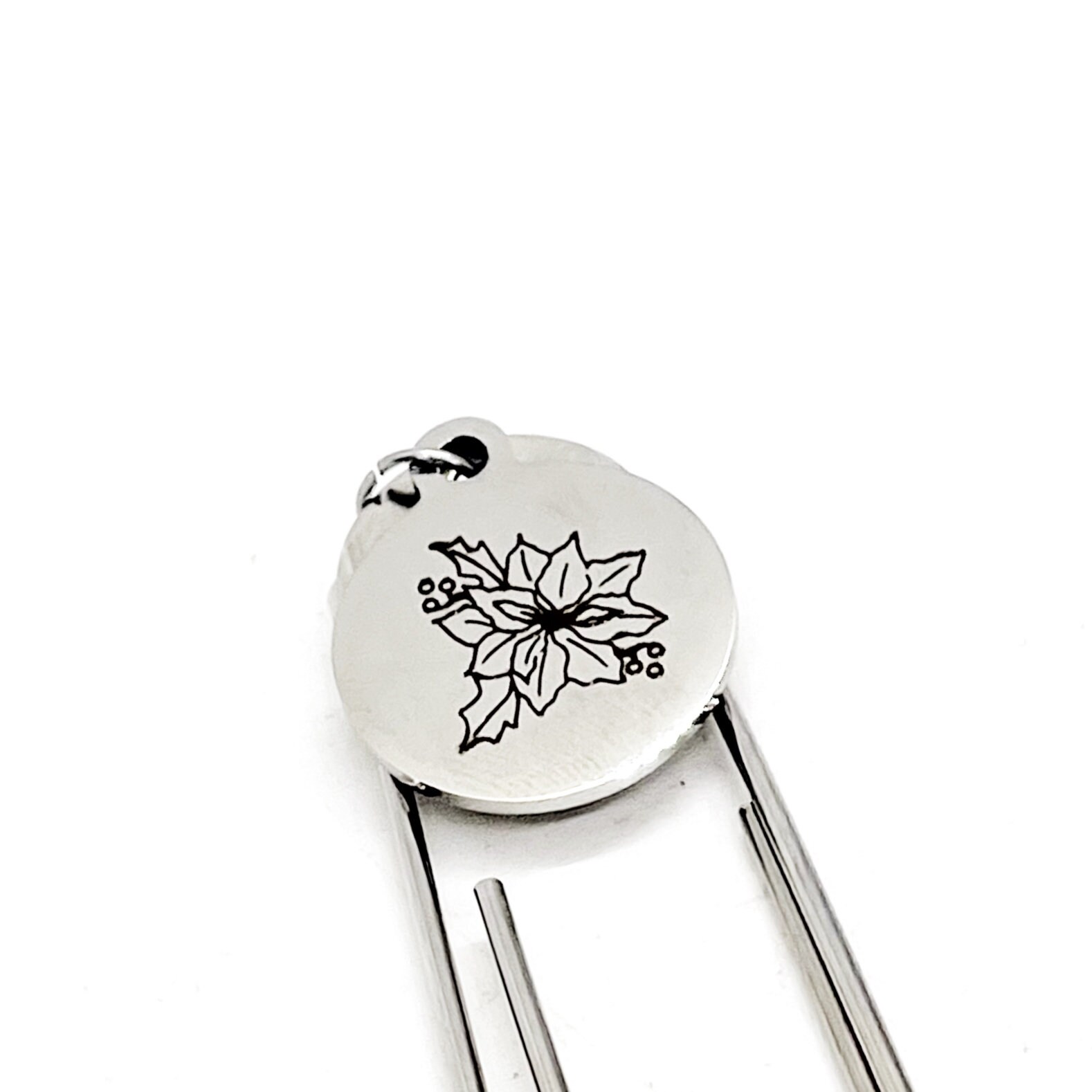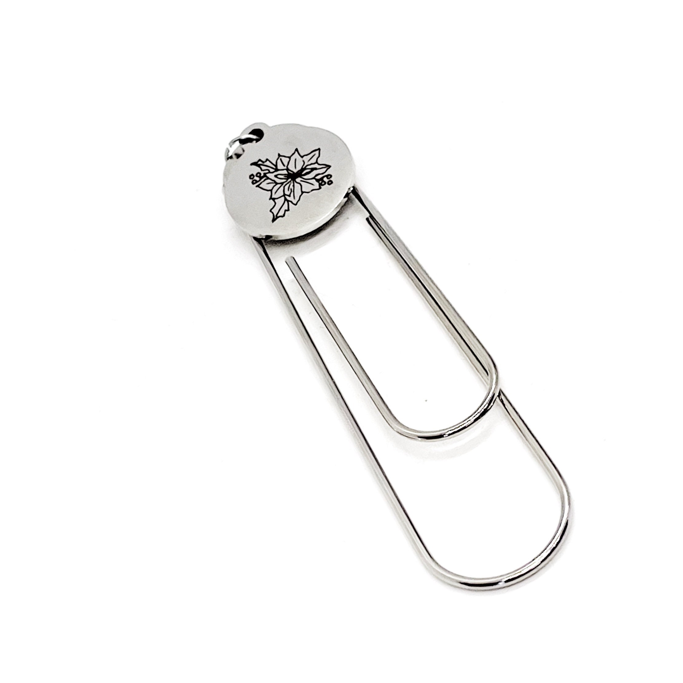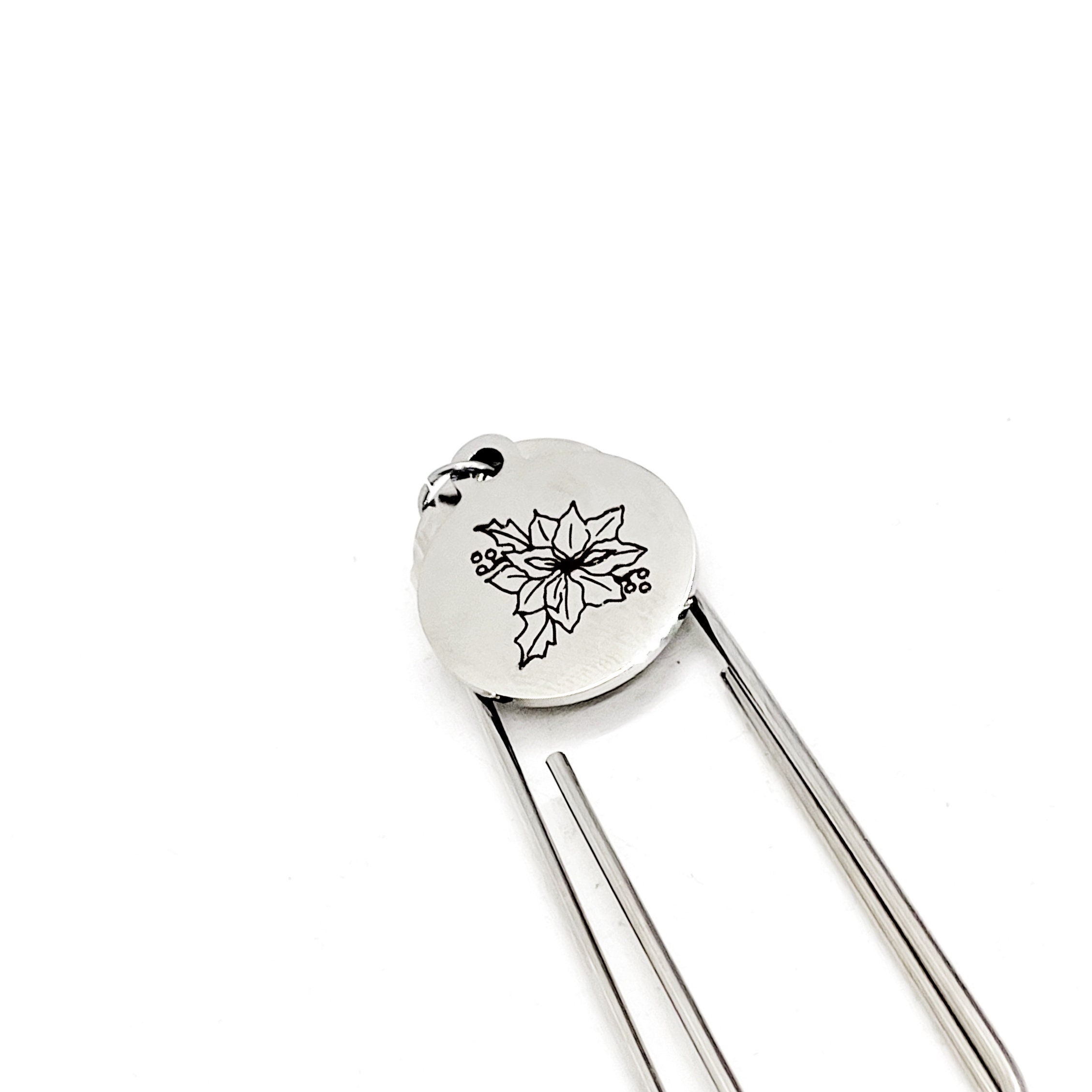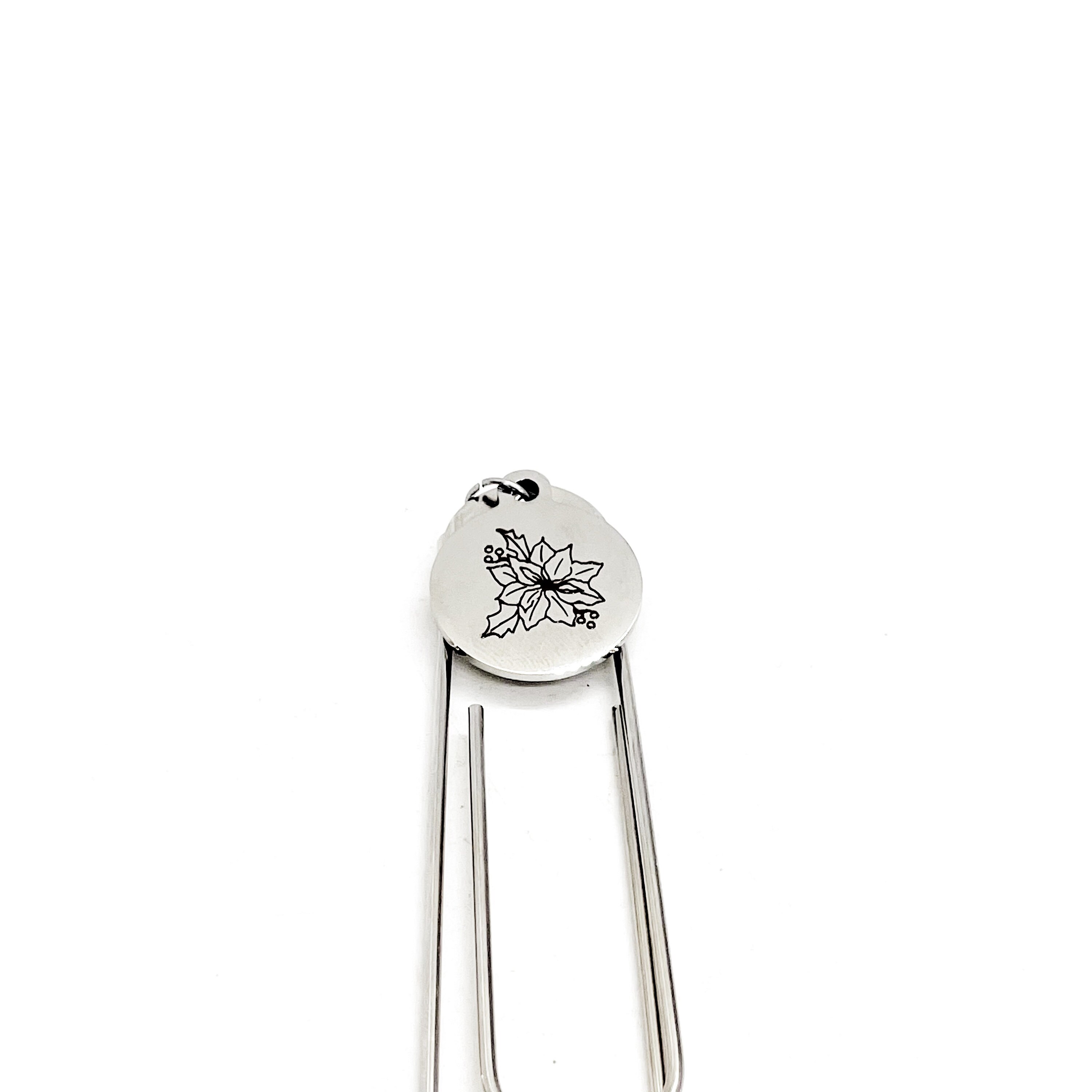 This bookmark has a stainless steel laser engraved charm that has a Poinsettia the birth month flower for December on it. The charm measures approx. 3/4 inch across.