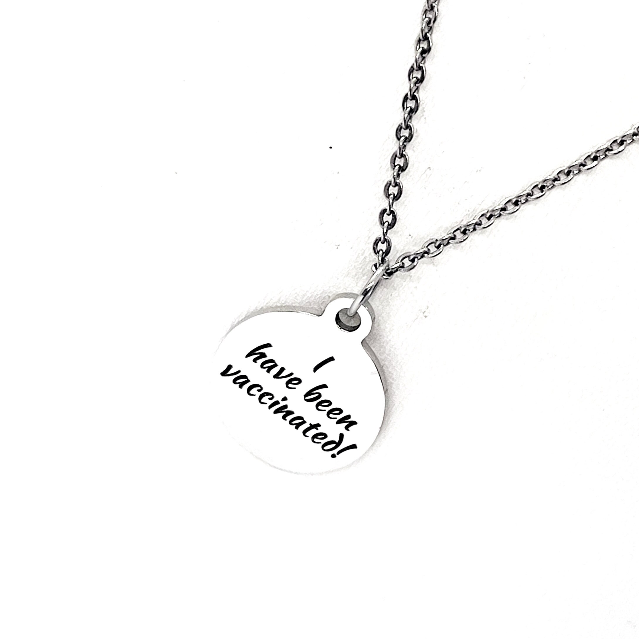 This is a stainless steel laser engraved pendant on a stainless steel chain. The pendant has “I have been vaccinated” on it. This pendant is available on your choice of 16, 18, 20, 22, 24, 26, 28 or 30 inch chain. The pendant is also available for individual purchase if you have another chain on which you would like to wear it. For an additional charge, the charm can be customized to meet your specific needs.