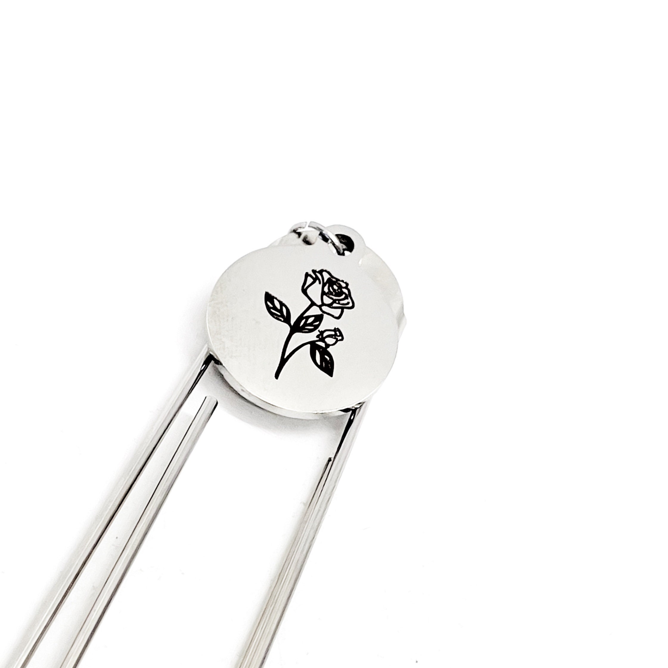 This bookmark has a stainless steel laser engraved charm that has a Rose the birth month flower for June on it. The charm measures approx. 3/4 inch across.