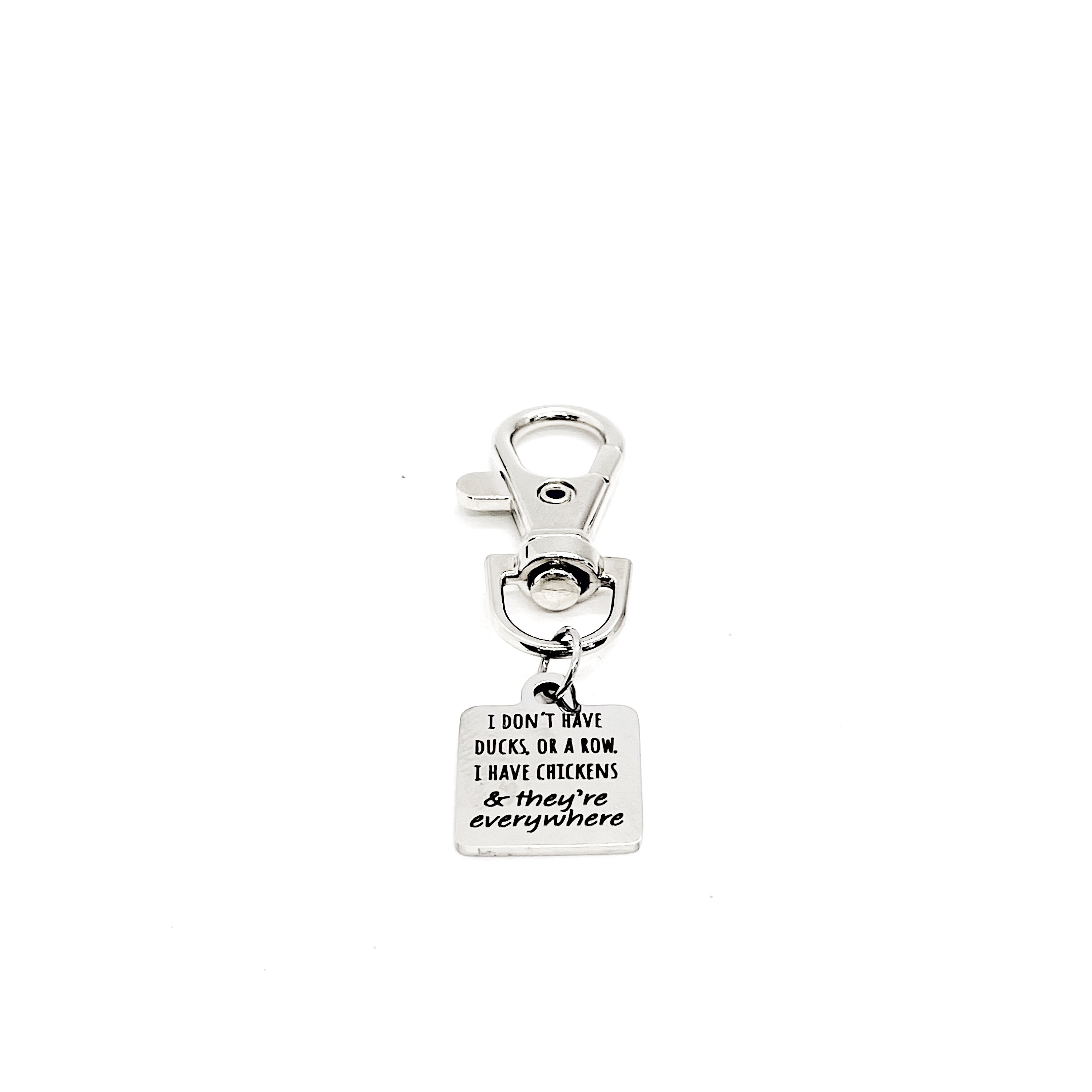 This is a great zipper pull or clip on bag charm. It would be a great charm to clip onto a sports bag, purse, book bag or keychain. It has “I don’t have ducks or a row. I have chickens and they are everywhere” on it.
