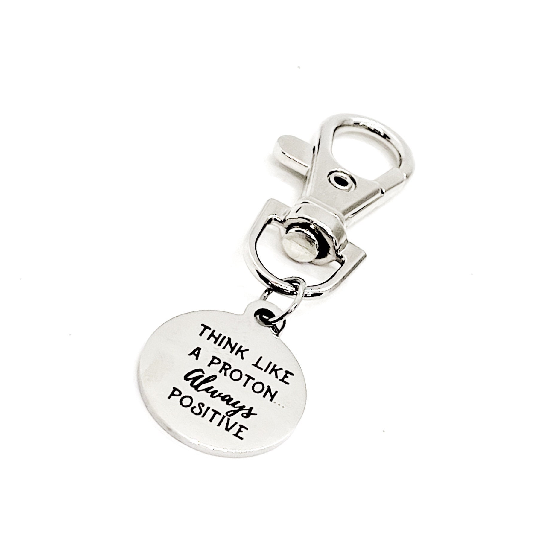 This is a great zipper pull or clip on bag charm. It would be a great charm to clip onto a sports bag, purse, book bag or keychain. It has “Think like a proton, always positive” on it.