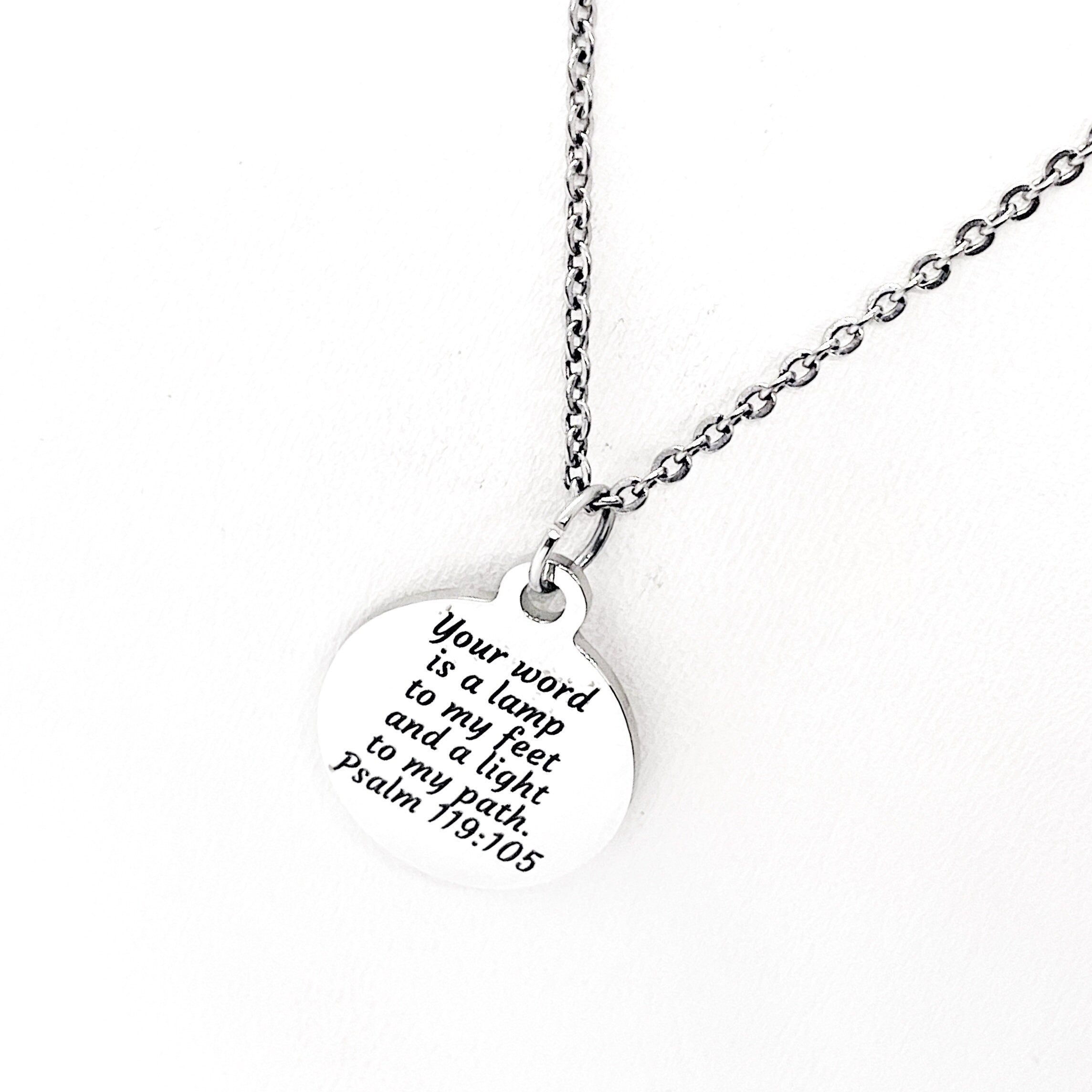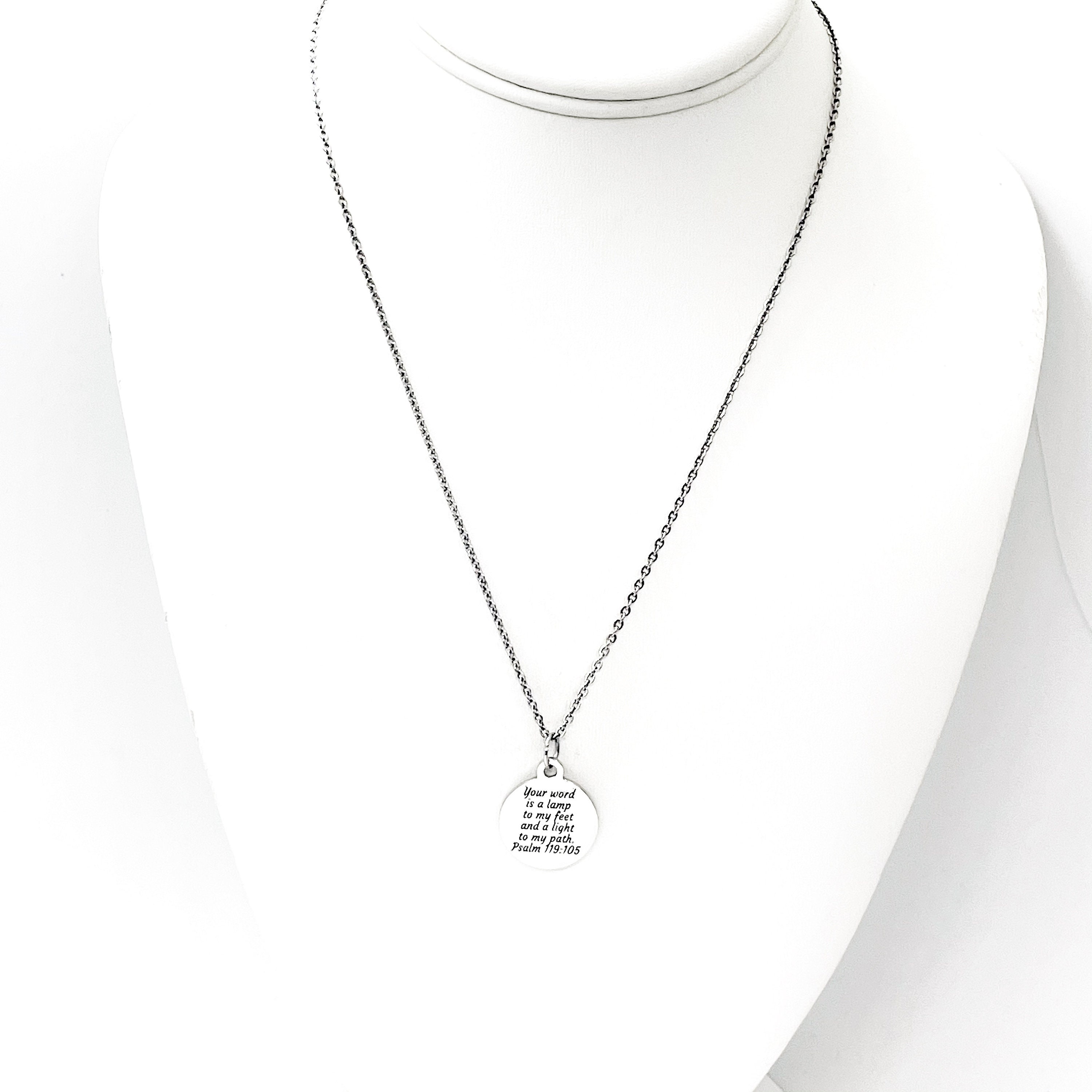 This is a stainless steel laser engraved pendant on a stainless steel chain. The pendant has “Your word is a lamp to my feet and a light to my path” from Psalm 119:105 on it. This pendant is available on your choice of 16, 18, 20, 22, 24, 26, 28 or 30 inch chain. The pendant measures approx. 3/4 inch across. The pendant is also available for individual purchase if you have another chain on which you would like to wear it. For an additional charge, the charm can be customized to meet your specific needs.