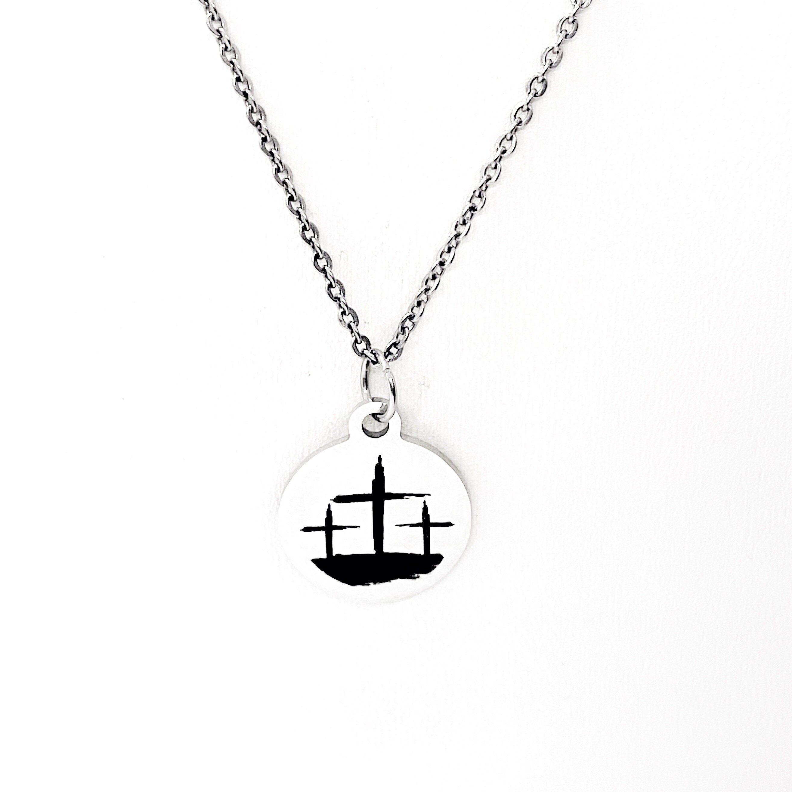 This is a stainless steel laser engraved pendant on a stainless steel chain. The pendant has three crosses on it. This pendant is available on your choice of 16, 18, 20, 22, 24, 26, 28 or 30 inch chain. The pendant is also available for individual purchase if you have another chain on which you would like to wear it. For an additional charge, the charm can be customized to meet your specific needs.