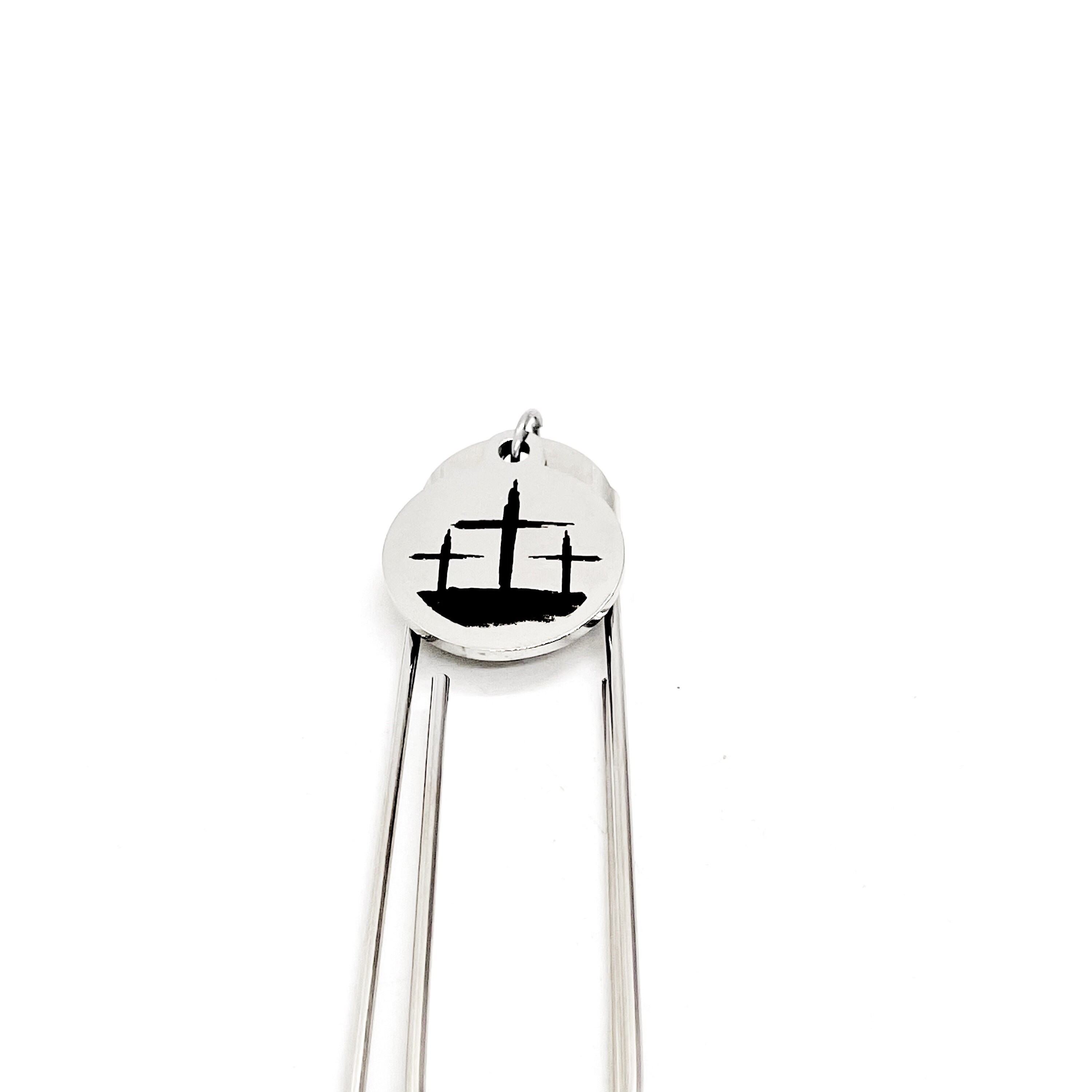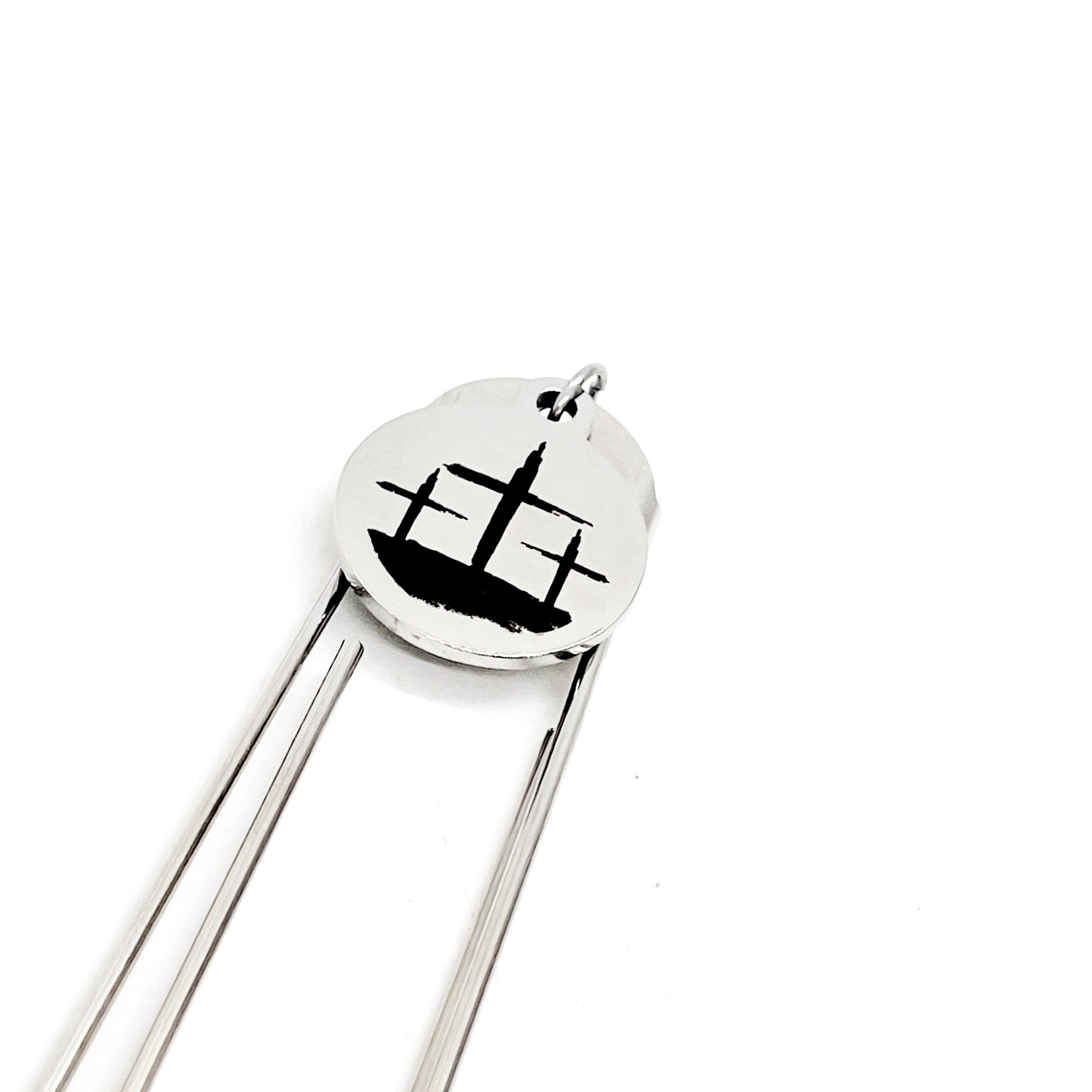 This bookmark has a stainless steel laser engraved charm that has 3 crosses on it. The charm measures approx. 3/4 inch across.