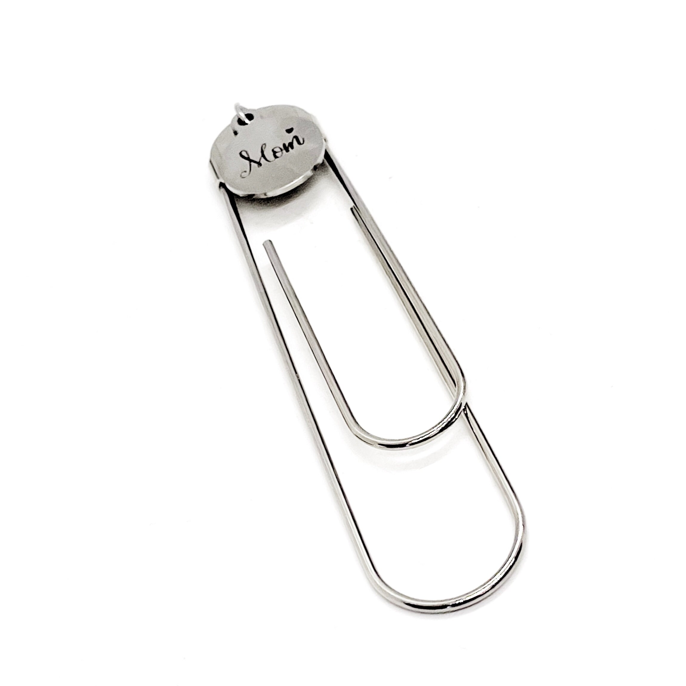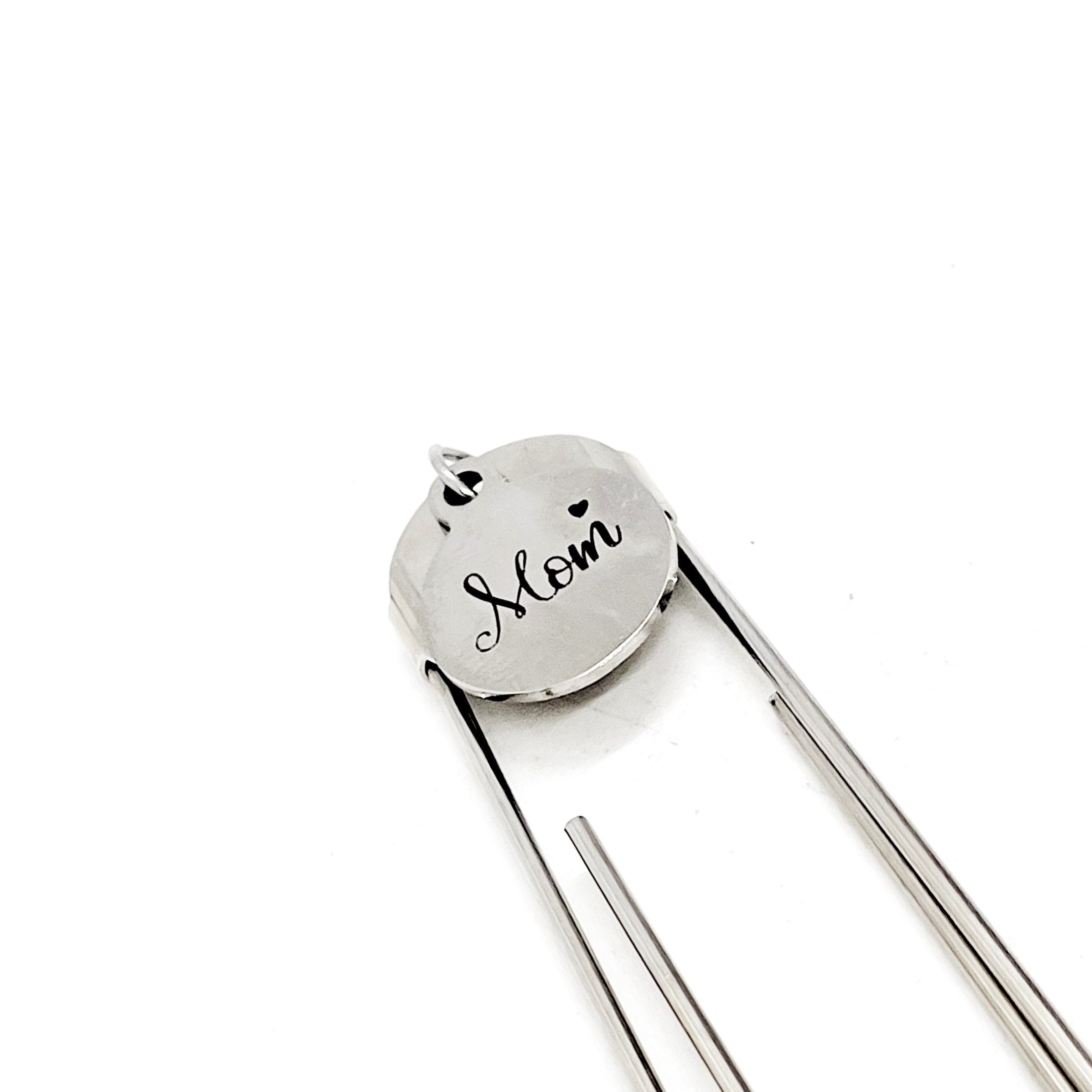 This bookmark has a stainless steel laser engraved charm that has “Mom” on it. The charm measures approx. 1/2 inch across.