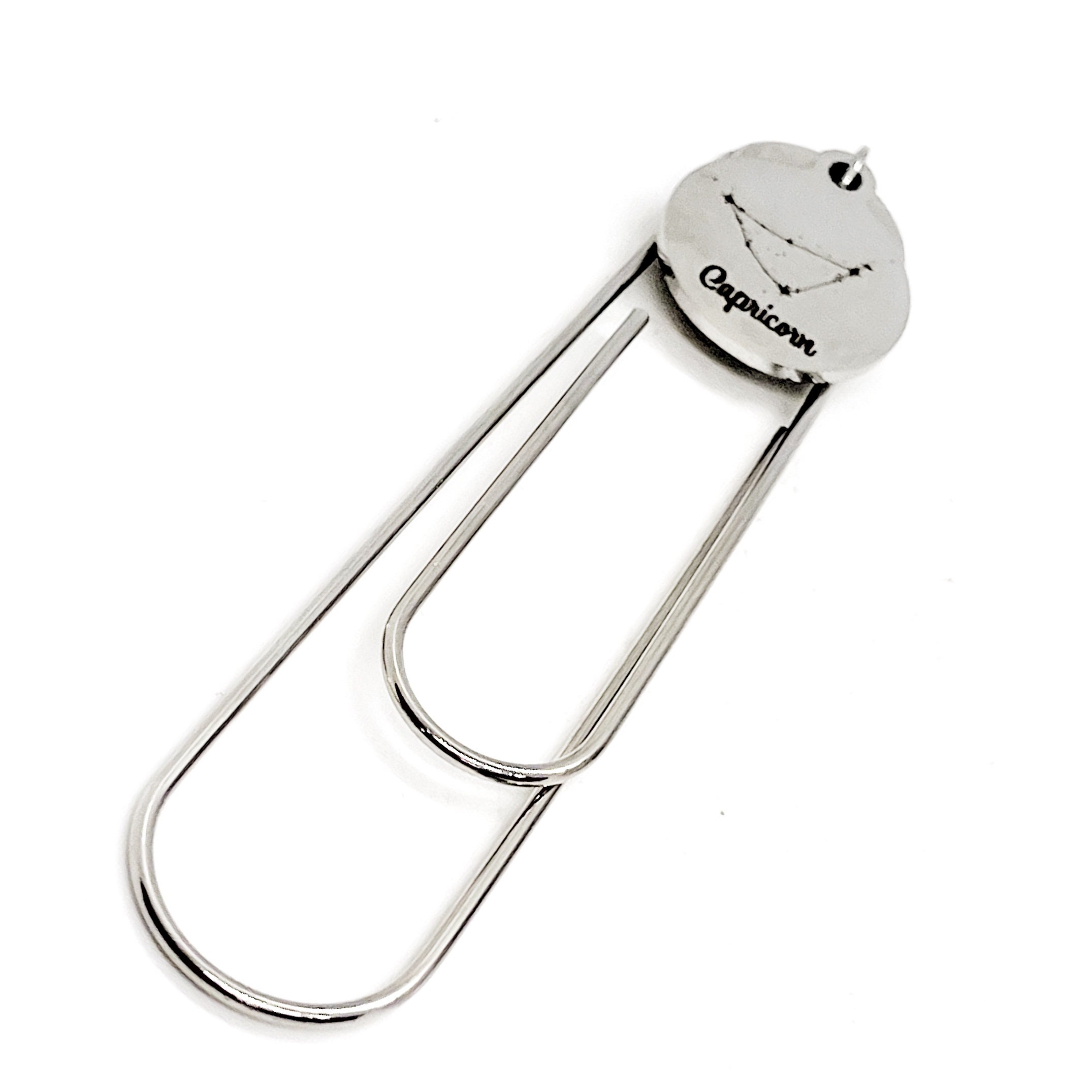 This bookmark has a stainless steel laser engraved charm that has “Capricorn” on it. The charm measures approx. 3/4 inch across.
