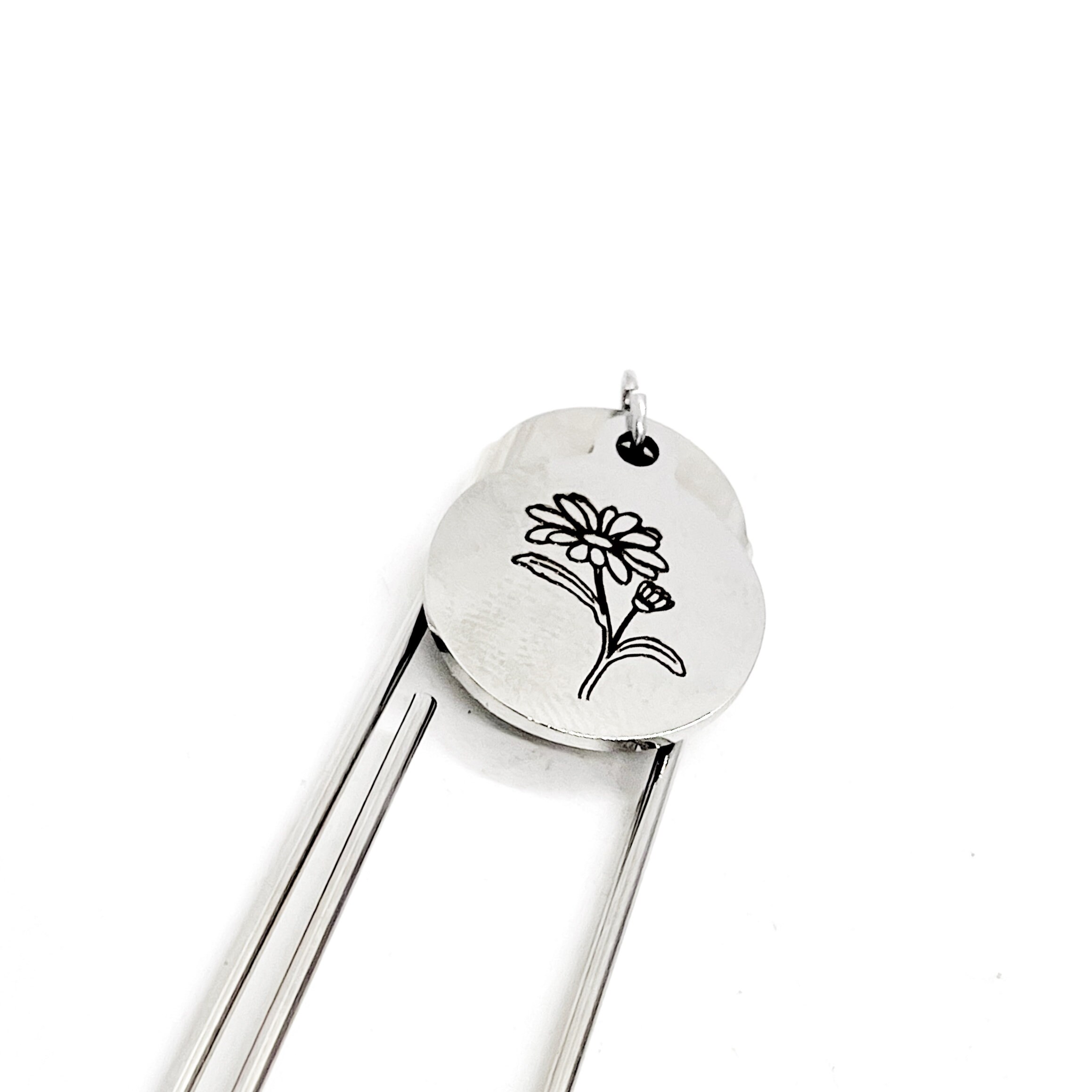 This bookmark has a stainless steel laser engraved charm that has a daisy, the birth month flower for April on it. The charm measures approx. 3/4 inch across.