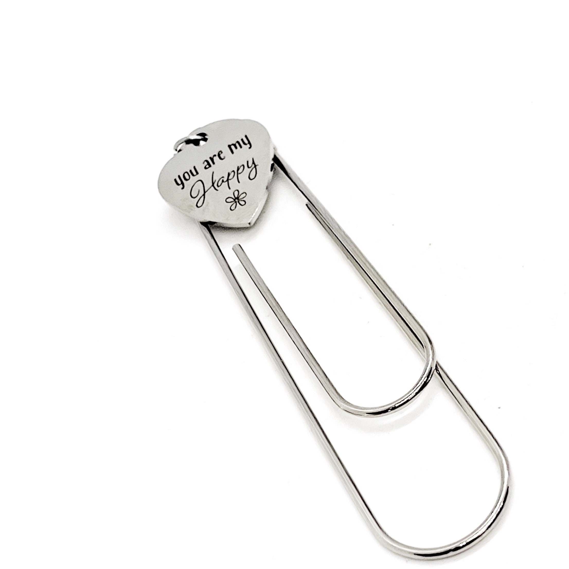 This bookmark has a stainless steel laser engraved charm that has “You are my happy” on it. The charm measures approx. 3/4 inch across.